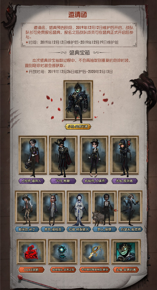 神秘大门轰然开启,回廊深处呈现真实,馆藏大厅激战开启,至高杰作待你绘制!网易首款1V4非对称竞技手游《第五人格》“深渊的呼唤Ⅲ”即将正式开启,在深渊的凝视之下,谁将赢得通往异界彼端的资格,争夺那最终的奖励和荣耀? 混乱将临,步入神秘展馆 在一间神秘的艺术馆里,陈列着黑暗、扭曲又充满诡异魅力艺术品。自称异界行者的艺术家,将远超人类的疯狂想象化为了无穷无尽的灵感,令所有观众为之沉迷。被异象所吸引的寻访者步入回廊深处,才惊觉癫狂的作者只是用最精湛的技艺,呈现了无人曾触及的真实景象。 但他不过是一个含蓄的传达者,其背后的深渊依旧在不断寻找新任代理人,伺机将混乱散播向凡世。璀璨与震撼过后,有谁会因好奇再度揭开帷幕,直视那暗中窥伺已久的阴影? 盛典邀请,开启深渊之战 本届COAⅢ的邀请函已向所有玩家发出,12月19日维护前,战队队长均可免费报名盛典,报名成功后,战队成员方能参与后续赛事。 12月19日维护后,盛典正式开启,神秘艺术馆将打开大门迎接玩家们的到来,在馆藏大厅阶段,战队成员通过深渊匹配和深渊排位获得馆藏大厅积分。队员的馆藏大厅积分将根据规则汇总为战队馆藏大厅积分,最终排名前100的队伍将赢得“深渊的呼唤Ⅲ-至高杰作”主题头像框并晋级至高杰作阶段。 1月9日维护后,至高杰作将揭幕开战,每晚19点至21点,晋级战队需通过特殊入口进行排位赢取至高杰作积分,积分汇总后排名前16的战队可赢得“深渊的呼唤Ⅲ-异界彼端”主题头像框并晋级至异界彼端阶段。本阶段赛事将在游戏内直播平台进行直播解说,并推送至全服玩家观战,观看赛事还有机会赢得随机奖励。 异界彼端阶段,16支晋级战队将受邀参与周年庆中国大陆赛区线上预选赛,其中6支战队将杀出重围,晋级“二周年庆典”。与全球另外10支顶级强队争夺200万总奖金和总冠军桂冠! 丰厚奖励,豪礼馈赠勇者 敢于直面可怕的深渊,在诡异的艺术馆中激战,每一位玩家都是当之无愧的勇者,而本次COAⅢ也备下了诱人的奖励等待你的赢取! 盛典期间,报名战队成员参与任意匹配、排位可获得盛典个人战斗数,参与深渊匹配和深渊排位可获得盛典战队对战数,累积至一定数量后将可以解锁盛典主题涂鸦、奇珍随身物品、盛典主题头像、随从等奖励。而战队馆藏大厅积分和战队至高杰作积分,不仅是战队一较高下,争夺晋级资格的依据,也能根据积分总值和排名情况为战队队员带来丰厚的奖励。 “深渊的呼唤Ⅲ”还为玩家们精心准备了盛典宝箱,宝箱中可能抽中小丑稀世时装“异界行者”、入殓师奇珍时装“嬉命人”、牛仔奇珍时装“教鞭”等,本次盛典珍宝抽取过程中,玩家们还不会抽取到重复的奇珍时装,直到奇珍时装全部获取,助你更快集齐所有珍宝! 网易首款1V4非对称竞技手游《第五人格》“深渊的呼唤Ⅲ”盛典即将启幕!艺术馆内强者云集,深渊对战竞逐胜利!即刻接受邀请,报名参与,在馆藏大厅里尽情激战! 【关于第五人格】 《第五人格》是网易首款非对称性对抗竞技手游。荒诞哥特画风,悬疑烧脑剧情,刺激的1V4的对抗玩法,都将给玩家带来全新的游戏体验。玩家将扮演侦探奥尔菲斯,在收到一封神秘的委托信后,进入恶名昭著的庄园调查一件失踪案。在进行证据调查过程中,玩家扮演的奥尔菲斯将采用演绎法,对案情进行回顾。在案情回顾时,玩家可以选择扮演监管者或求生者,展开激烈的对抗。而在调查的过程,无限接近事实时,却发现越来越不可思议的真相。 |