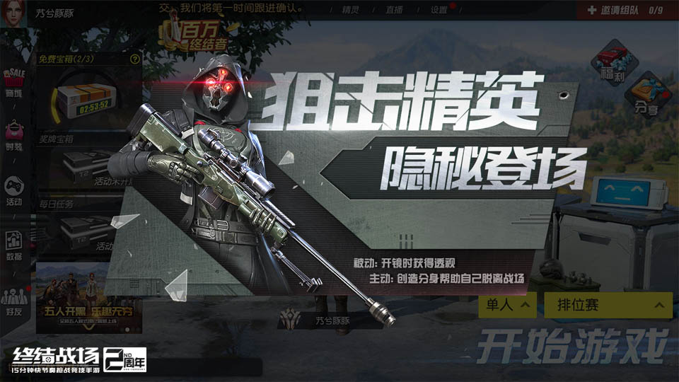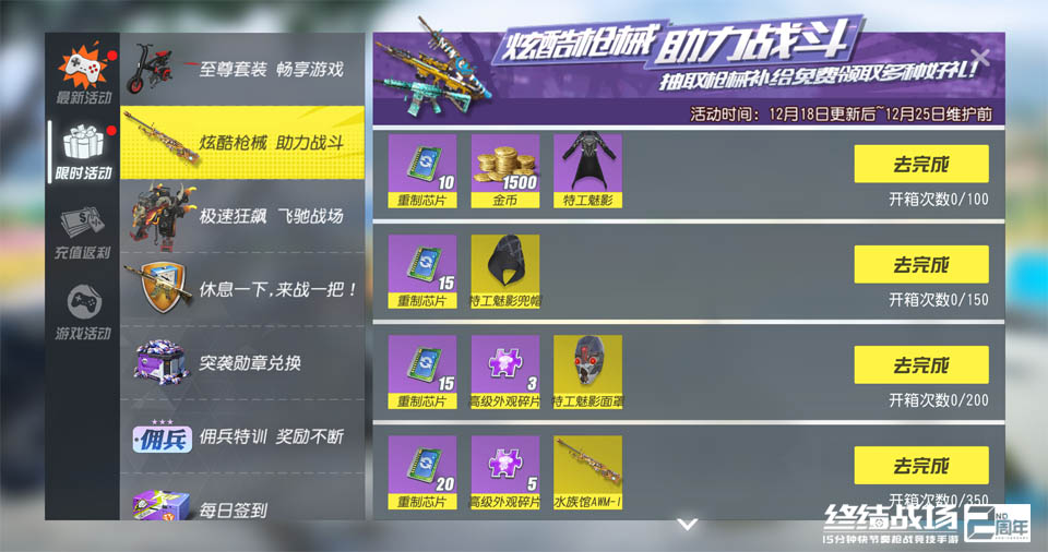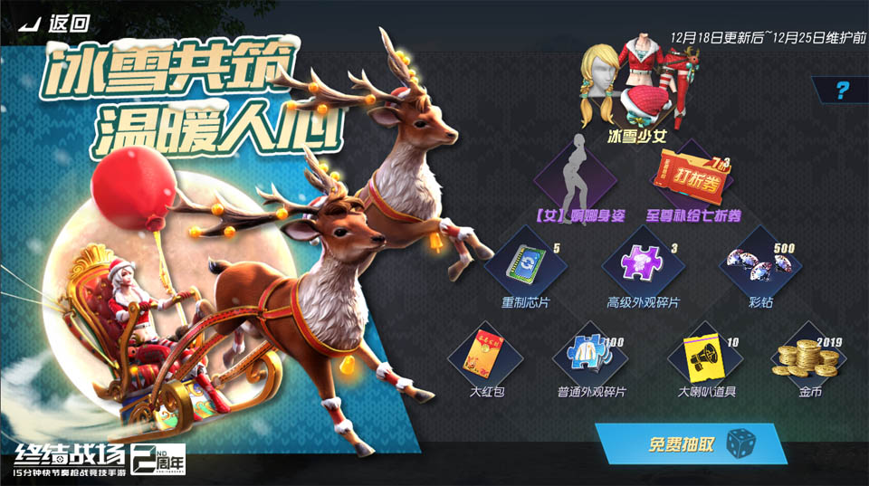 热血欢庆冰雪节,兄弟开黑享豪礼!网易快节奏开黑枪战竞技手游《终结战场》12月18日更新之后,新英雄“狙击精英”正式登陆,实力演示神狙战术。全新幸运系统为至尊补给等活动开启更多惊喜可能,冰雪节嘉年华上线,绝美冰雪套装等你解锁! 热感巡逻战场 狙击精英神秘上线 作为战场上的隐形杀手,狙击精英为自己配备了强大的热感索敌装备,他能够在开镜一段时间内让自己的视野前方形成透视效果,以便于搜寻敌人和偷袭。而当遇到敌人偷袭时,狙击精英则可以在瞬间生成替身,真身通过潜行逃脱危局。 玩家可通过收集任意一套“特工魅影”系列套装和枪械皮肤“水族馆AWM-I”解锁狙击精英。这套专属外观设计别致,充满科幻感,胸前的准星图案更是突出了狙击手的职业特点。 神秘的魅影套装之外,枪械皮肤水族馆将为玩家带来炫目的视觉体验,随着皮肤的升级,视觉效果也将更加出众。 冰雪嘉年华 锁定绝美少女套装 本周更新后,《终结战场》迎来了冰雪节嘉年华,玩家参与“签到赢好礼”活动即可领取海量道具奖励。在12月25日当天,《终结战场》还将正式启动“冰雪节”庆典,参与即有机会免费获得新版本时装“冰雪少女”。在此之前,玩家可以通过本周枪械补给抽取获得免费开奖机会,并有机会获得金币、彩钻、重制芯片、红包等道具,或是提前锁定套装。 幸运加持 终极奖励轻松到手 在本周更新后,《终结战场》的“幸运系统”启动,至尊补给、载具补给和枪械补给中增加了“幸运值”设定。玩家每抽取一次都可以为自己的幸运值加1,幸运值越高抽到终极奖励的概率越大。 其中,枪械补给的终极奖励为橙色品质枪械皮肤,至尊补给与载具补给的终极奖励则是橙色品质的载具或随身载具。当幸运值积满时,玩家的下一次抽取将百分百获得终极奖励,随后幸运值将重置。同时,在枪械补给界面玩家将有机会获得AWM外观水族馆AWM-I以及特工魅影套装,解锁英雄“狙击精英”。 本周载具补给为玩家带来了“暴走”系列,弹跳机器人外观“蒸汽暴走机器人”、人物外观“暴走兽人”和撬棍外观“暴走战斧”火爆上线,铁管中喷发的水雾完美呈现了蒸汽朋克的独特魅力。 本周更新完成后,终结猎手、灵鸦侍者、合成异兽、永生伯爵将加入限免英雄名单,玩家体验与战术空间极大拓展,更多战场组合等你来搭!即刻登录《终结战场》游戏官网,享受快节奏开黑的激爽体验! 关于《终结战场》 英雄归来,终结战场!2周年全新英雄模式刺激开战!彗星巨炮、特工潜行,召唤空投,任选秘宝,给你超酷超燃的对决体验!S11赛季火爆进行中,新英雄狙击精英热血登陆,给你极致畅爽体验! |
