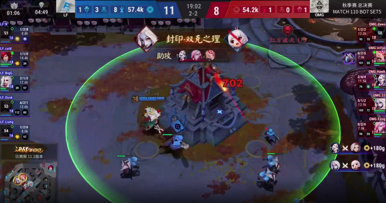 12月7日《决战!平安京》OPL秋季赛总决赛落下帷幕,LF战队凭借昂扬不灭的斗志,让二追四力克劲敌OMG战队,捧起了属于他们的OPL秋季赛冠军奖杯!横跨五个月的历程中,12支优秀的战队为平安京观众献上了整整400场比赛,就让我们一起回顾下2019 OPL秋季赛的各种之“最”吧! 最“考验膀胱”的比赛——10-24 MIE VS LUX 本次秋季赛耗时最长的单局比赛,来自10月24日常规赛第十周,MIE对战LUX的第一小局比赛。 整场比赛总计耗时29分57秒,比OPL秋季赛比赛平均时长15分59秒差不多超出了一倍。比赛中LUX与MIE有来有回,焦灼鏖战,最终LUX以21:20的比分险胜MIE。整场比赛诞生了41个击杀,有3条八岐大蛇与3条石距被拿下。同时LUX也凭借91.8k的经济数据,成为本次OPL秋季赛单场总经济最高的战队。 LUX以21:20的击杀数赢得耗时最长对局 最速闪电战——09-13 OMG VS MIE 本次秋季赛耗时最短的单局比赛,来自9月13日常规赛第十周,OMG对阵MIE的第三小局比赛。 整场比赛总计耗时仅10分02秒,这场比赛中OMG发挥了雷厉风行的激进战术,在拿下第一条八岐大蛇之后,一鼓作气直奔高地,以击杀数13:5战胜MIE,获得了秋季赛耗时最短的对局胜利。 本场比赛堪称“最速闪电战”,彰显了OMG强大的实力,以及让对手无法呼吸的压迫力! OMG以13:5的击杀数赢得耗时最短对局 最疯狂刺激的比赛——10-10 OG VS BLG.M 刺激爽快的比赛,必然少不了大杀四方的对抗。本次秋季赛总击杀数最多的比赛,来自9月13日常规赛第九周,OG对阵BLG.M的第一小局,两队总53次击杀数成为本次秋季赛之最。 双方从18分钟起,不断在八岐大蛇和年兽附近纠缠,爆发了一波又一波精彩的团战。首先是OG以1换4打败BLG.M拿下八岐大蛇,随后在年兽附近与刚复活的BLG.M再起冲突,BLG.M凭借血量优势3换5团灭OG,但迫于蛇线威胁不得已回防高地。在23分钟八岐大蛇再次刷新的瞬间,BLG.M靠着巨额输出拿下大蛇并打上高地,然而被沉着冷静的OG战队0换4反打,从而失去巨大优势。最后OG凭借更稳健的表现,在频繁的团战中克敌制胜,以27:26的击杀数获得这场最疯狂刺激的比赛的胜利! 在这场比赛里,双方激进进攻的风格一拍即合,不断爆发团战,来往拉锯竞逐重要资源。平均每分钟爆发1.8击杀,直让观众们大呼过瘾! OG以27:26的击杀数赢得最刺激疯狂的对局 最逆天翻盘的比赛——11-24 LF VS EG 在11月24日季后赛胜者组第一轮,LF对战EG的比赛中,冠军战队LF上演了一场逆天翻盘局——在连丢两蛇,基地只剩三分之一血的情况下转败为胜! 作为本次OPL最大黑马战队,EG凭借独到的资源掌握技巧,在比赛进行到14分钟的时候便拿下2条八岐大蛇,并利用蛇线优势连破LF两路高地。在滚雪球的优势下,EG二十分钟再开第三条八岐大蛇,LF战队在基地岌岌可危的情形下,并没有选择第一时间去处理兵线,而是在蛇坑与EG战队展开争夺,最后在Dusk小松丸疯狂输出下成功击杀EG四人,获得了八岐大蛇的控制权。随后清姬回城处理兵线,此时LF的基地已然只剩三分之一的血量。 LF战队这个大胆的操作避免了慢性死亡,将劣势扳回打出了气势,随后一鼓作气控下年兽,一波推进击败EG。也正是这场逆天翻盘的豪气一直持续到了LF战队最终夺冠的瞬间! LF战队基地只剩三分之一血量 最出奇制胜的比赛——12-07 LF VS OMG 12月7日秋季赛总决赛中,两支顶尖强队势均力敌,在最焦灼的时刻LF再次展现“偷塔”神技,灵性偷家出奇制胜! 来到总决赛第五局,此时大场比分是2:2,LF和OMG谁能取得第五场的胜利,谁就将拥有赛点的主动权。开场前十分钟LF稳定发挥积极gank,累积下了4:2的击杀优势。并在11分钟的大蛇区团战中,LF.Dusk爆炸输出0换3拿下八岐大蛇。而OMG战队同样不甘示弱,在比赛进行到十八分钟时,双方在大蛇区再次爆发团战,OMG抓住机会以5打4,顺势拿下八岐大蛇。 就在OMG拿下大蛇后又以1换3赢下团战胜利的同时,LF.cold带着下路兵线直扑OMG高地。OMG本可以凭借第二波大蛇,稳健发挥一转反攻,但cold并没有给OMG喘息的机会,就在OMG食梦貘和白狼回城的一瞬间,夜叉最后一戟击破基地,宣告LF赢得胜利! LF.cold夜叉偷家获得胜利 12支优秀战队,四百场的比赛,无数在平安京奋战的身影,成就了大家在2019年OPL秋季赛最美好的记忆。这一季有圆满,有遗憾,风雨如磐,但战场无痕,OPL的征程还会继续,新的战局也会打响。 期望大家可以记得这个秋天某个动人的瞬间,也让我们一起期待明年再见! |