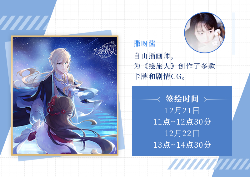 12月21日至22日,COMICUP25 魔都同人祭盛大来袭,《时空中的绘旅人》将在上海新国际博览中心与大家首次线下会面!展台空间细致还原游戏内鸟笼、画室场景;现场多样活动派送各类无料周边;还有特邀画师限时签绘、100%福利掉落抽奖等待你的参与! 【参展信息】 时间:12月21日至22日 地点:上海新国际博览中心 展位:N3馆-CPA08 《时空中的绘旅人》展位位于N3场馆6号门附近。参加过内测的小伙伴应该对展台中心场景十分熟悉,这就是游戏开篇“荆棘鸟笼”的实地场景!各位玩家可以自行进入其中拍照留念。除鸟笼外,现场还融合画廊、画框等游戏元素搭建了签到、抽奖、体验、周边、签绘五大功能区,希望能给前来展台的玩家沉浸式的体验。 漫展现场怎么会少得了福利掉落呢? 【扫码关注】扫描二维码关注《时空中的绘旅人》微博及微信公众号即可获得角色纸袋。 【现场预约】按现场指引预约游戏,可获得宣图文件夹一个。 【转发PV】现场转发B站或微博的游戏PV可抽奖一次,奖品包括角色立牌、限定色纸、明信片、徽章等。 除此以外,《绘旅人》官方特邀画师撒呀酱、纸钞将闪现签绘区,限时签绘不容错过!周边区也可购买今天的行囊和叶塞大陆系列角色立牌、角色徽章以及明信片套装。 超多福利和精彩活动,尽在COMICUP 25《时空中的绘旅人》展台。这个冬至,与你相约魔都同人祭! 关于《时空中的绘旅人》: 《时空中的绘旅人》是一款世界观基于“平行宇宙”概念的剧情恋爱手游。由阿杰、夏磊、姜广涛、谢添天、赵路等知名声优全程配音,并邀请了国内外优秀画手参与创作。 |