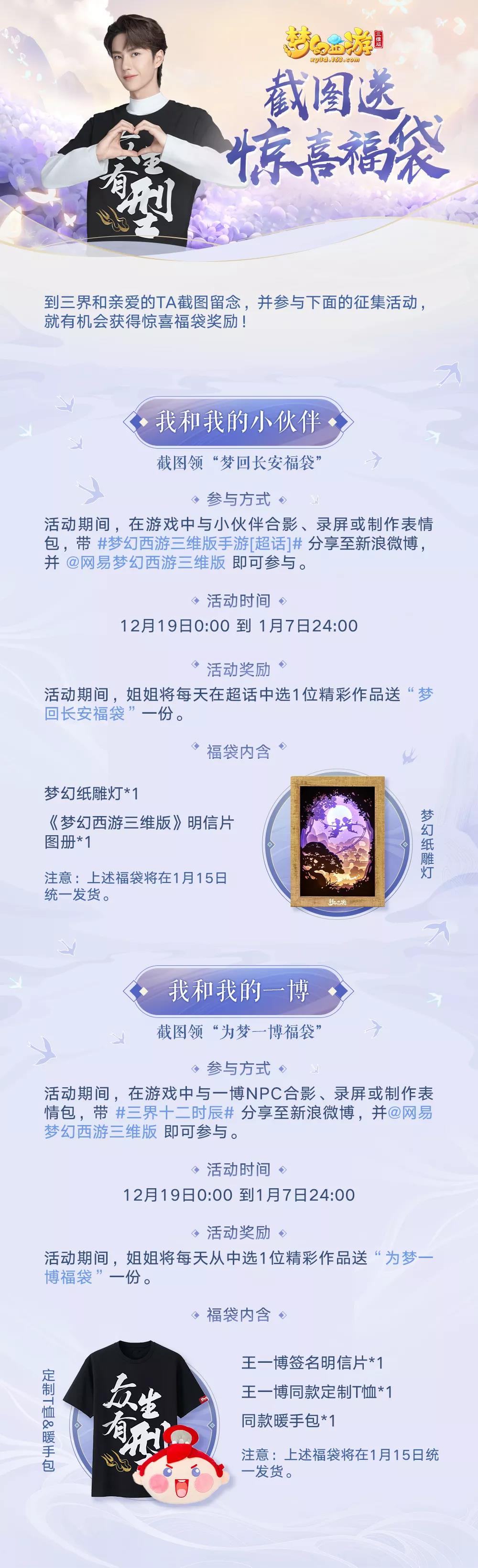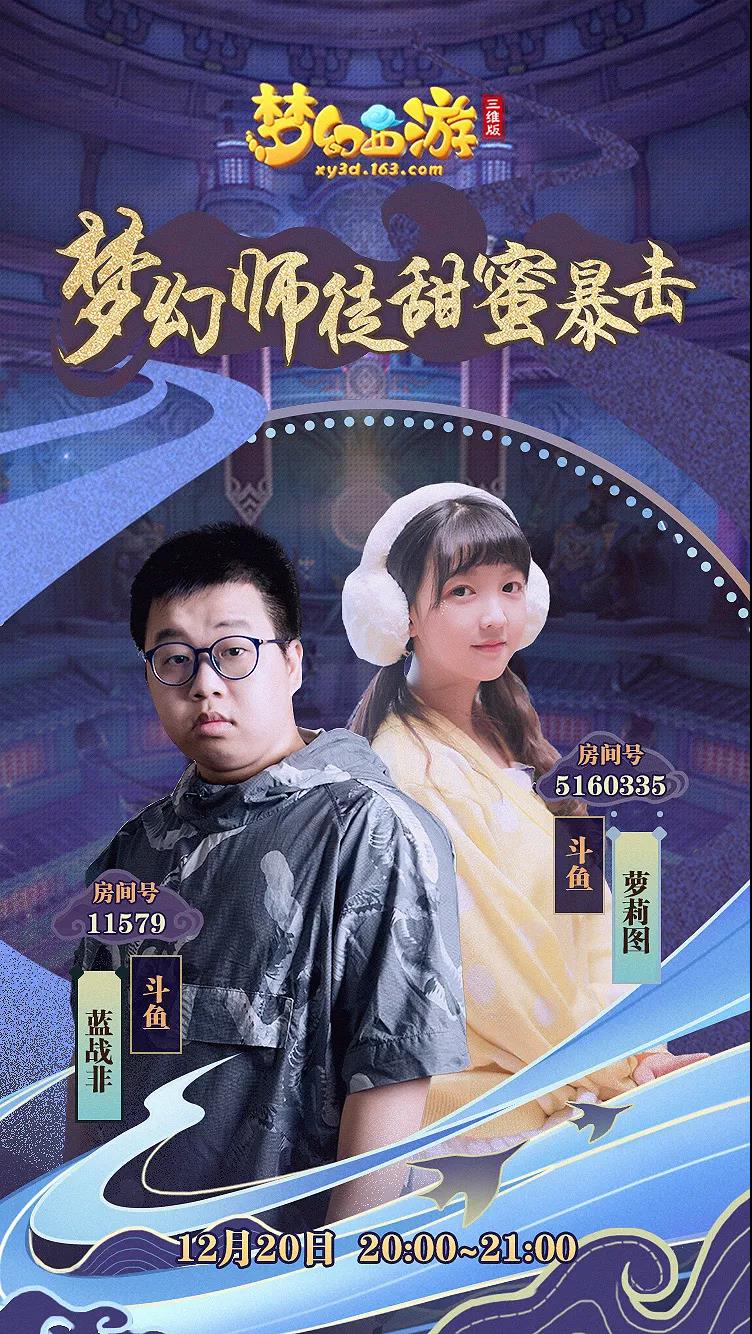 众生有型,万物有灵。《梦幻西游三维版》于2019年12月18日1200正式开启全平台公测,上线领取十二大公测福利! 金牌讲师芜湖大司马丶在三界开课了。自12月18日起,他将在安卓【梦回长安】服务器打造第一帮派,等待少侠前往挑战。 互黑基友蓝战非和萝莉图,则会在12月20日,组队探索三界的奇妙玩法。 12月21日,更有人气主播呆妹儿小霸王带你游三界! 清华学霸主播女流和安神豆腐渣将在12月22日迎战科举,争夺本周状元郎。 看完所有直播的你,或许能够成为综合素质全面发展的“三好”少侠?《梦幻西游三维版》现邀请你解锁主播技能,成为侠义主播团中的一员!只要你有才有梗,愿意展示,就能成为主播,收获一批忠实粉丝。 即刻前往斗鱼直播、CC直播、西瓜直播、B站直播均可参与报名,还有机会成为官方签约主播,获得丰厚奖励。 最后,行走三界,不随时随地和亲爱的TA截图晒照怎么行? 关于《梦幻西游三维版》手游: 《梦幻西游三维版》是由网易梦幻西游金牌团队研发的次世代3D即时制手游,延续了梦幻西游的经典玩法、独特的国风美学,并塑造了一个万物有灵的西游大世界:随心选择的善恶身份、自由结交的仙魔精怪、无定式的剧情发展、开放探索的游戏规则……即刻启程,触摸三界的心跳。 |