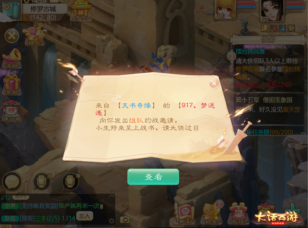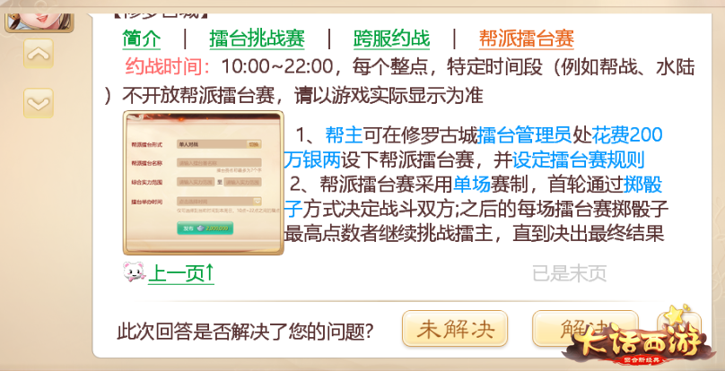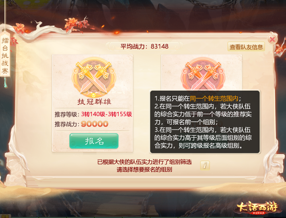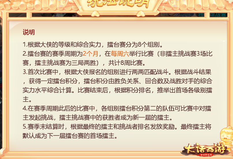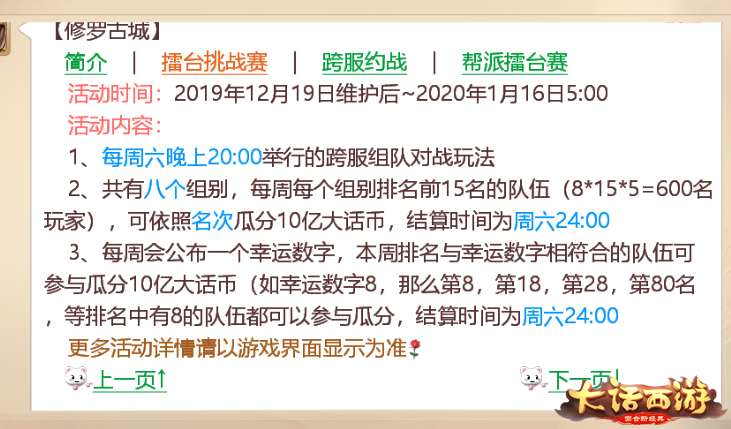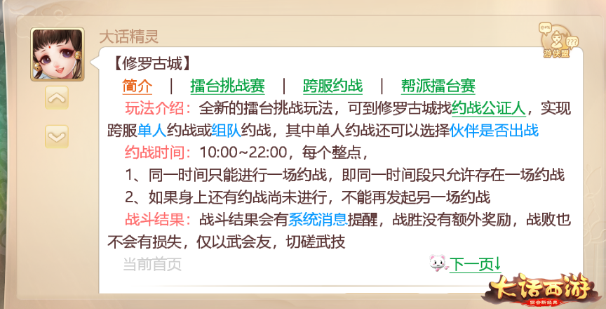 网易游戏旗下经典国风手游——《大话西游》手游全新资料片“修罗古城”已正式上线,在全新地图“修罗古城”中,多元化的擂台玩法为热爱PK的大话玩家们带来了全新的游戏体验。为了帮助更多玩家对“修罗古城”的全新玩法有更加透彻的理解,网易CC917主播梦逍遥为所有大话手游玩家们带来了一份十分详细的玩法全面解析。 作为大话手游日常PK的全新选择,修罗古城玩法上线之后还是收到了许多玩家们的密切关注的。作为对这个全新玩法完全陌生的萌新玩家,可以先在“大话精灵”中进行查询,简单获取到有关“修罗古城”玩法的介绍。 接下来大家可以通过新的“修罗古城”地图,来了解此次全新玩法的分类。通过地图上我们可以看到,修罗古城地图上有3个NPC,他们将是引导玩家开启新玩法的领路人。 逍遥用自己的理解帮玩家们进行了分类,三个玩法分别对应三个NPC: 玩法1:日常约战玩法 NPC约战公证人 玩法2:擂台挑战赛玩法 NPC 擂台挑战赛领军 玩法3:帮派擂台赛玩法 NPC 擂台管理员 玩家想要参与上面三种类型的玩法,分别和这三个NPC对话即可开启相应的任务流程了。 关于这三个类型的擂台玩法,逍遥也为玩家们带来了简单的介绍和攻略: 玩法1:日常约战 日常约战玩法有点类似于常规赛,只为体验PK的乐趣和练手用的,不管胜负都没有任何的奖励和惩罚。 玩家点击约战公证人下战书之后会跳出如下界面,这里大家就可以根据需求进行选择,主要分为单人,单人和伙伴,以及组队玩法。 在这个检索界面中,玩家可以选择自己需要约战的对手,包括跨服玩家也可以进行约战,但是想要约战的对象必须在线。系统会根据你的总体战力帮你推荐一批对手,但跟等级和服务器都无关,160级的玩家也可以匹配到1转和你战力相差无几的其他服务器的玩家,所以仍然需要玩家自己手动选择想要约战的对象来下战书。除此之外,玩家还可以约战自己的好友或敌人,约战过的对手都会有约战记录,如果不服可以下次再向对方发起挑战。需要注意的是,每次约战的时间只能是10点到22点之间的某个整点,并且需要提前一定的时间下战书。 被约战的玩家会收到系统的邮件,点击查看可以选择约战或者拒绝约战。 一旦被约战方接受约战,那么在此约战结束之前不可以进行其他约战,也就是说约战同时只能约战一个对手。约战是需要主动发起的一方消耗一定花费的,本服内约战需要支付10W游戏币,跨服约战则要支付500仙玉,不管约战是否成功对手是否接受约战,约战的费用都不会退回,大家一定要慎重进行约战,最好和对方事先约好,以免不必要的损失。 修罗古城约战中不会提供药品,在约战过程中使用的药品会正常消耗。单人约战的发起方可以选择是否允许带伙伴参赛,而组队玩法是无法选择伙伴参赛的。当约战开始的时候系统会发放消息邀请其他的玩家前来观战,当战斗结束的时候系统也会公布比赛的结果。 玩法2:擂台挑战赛 如果说日常约战玩法是常规赛的话,那么擂台挑战赛就是排位赛了。 由于擂台挑战赛是一个全新的周末玩法。挑战赛每周6晚上8点开始,每一个组别都会有一个擂主,每一个组别排名第二的队伍可以挑战擂主,挑战模式是三局两胜,如果挑战成功则成为擂主。除此之外其他的大部分队伍都会进行两两匹配,和决战长安一样打三场战斗,然后根据结果给予一定的擂台积分。不过擂台挑战赛的积分不再是单一的以胜负的方式给予积分,而是会根据胜负、回合数和双方战力情况给予一个综合积分,相对来说会更加科学一些。擂台挑战赛一个赛季为2个月,赛季结束之后会发放赛季奖励,赛季结算时候的擂主就是下一赛季开始时候的擂主。 除此之外,每一周的擂台挑战赛还有会惊喜,8个组别的每一个组别的前15的队伍会根据名次来瓜分10亿大话币。另外还有幸运奖励,在12月26日-1月6日期间还有限定的活动,系统每周会选出一个幸运数字,玩家只要当周擂台赛的排名跟幸运数字有关也可以参与瓜分巨额奖金! 需要注意的是,每周的擂台挑战书最晚报名时间是在周五晚上22点之前,按照登记和队伍的平均战力,总共分为8个组别。逍遥在这边帮大家将三个报名信息进行一些说明:第一这里的“同一转生范围内”指的不是说报名的五个玩家必须是同一转生范围的,正确的理解应该是,只要有三转玩家的队伍就没有办法报名推荐等级为3转以下的组别。 至于第二和第三点,举个例子说明更直观一些:例如队伍中等级最高的玩家为3转156级,但是平均综合战力只有8W,该队前一个组别的等级为3转140到155级,但是战力需要9W,那么我们的平均战力比前一个等级组别的平均战力要低,这种情况下我们就可以选择报名前一个组别的擂台挑战赛。那么第三个就是反过来的意思,大家在报名的时候可以根据情况选择报名。 玩法3:帮派擂台赛 帮派擂台赛玩法是一个能够帮派小伙伴们之间的感情的趣味玩法,该玩法只有帮主可以进行发布。擂台赛采用单场赛制,分为单人对战和组队对战两种。参与也有筛选机制,也就是说帮主可以根据这次擂台赛的需求来限定参赛成员的范围。 这是一个相对比较新颖的模式,最终的擂主获得者不仅需要实力也需要运气,运气好说不定可以少打几个对手然后成为擂主。 以上就是梦逍遥对修罗古城玩法的一些简单的分析,希望可以帮助大家更快的了解这个玩法。全新资料片“修