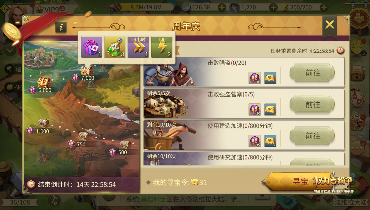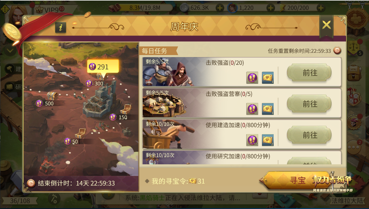 书写王国史诗,法维拉周年庆来袭!网易首款全球开放策略手游《权力与纷争》将迎来盛大的周年庆典,领主们将在法维拉大陆上共同庆祝这值得纪念的一刻,更能参与游戏为大家准备的各种惊喜活动,赢取传说技能残页、传说自选信物等超豪华道具奖励! 铸就辉煌,法维拉周年里程碑! 自去年12月27日开启全平台公测以来,《权力与纷争》吸引了许多喜爱SLG战争策略手游的玩家,以制作精良的游戏品质、多种多样的特色玩法、燃情四射的军团对战、丰富多彩的福利活动为领主们带来了独具一格的游戏体验。 在一年多的时间里,领主们在法维拉这片神奇的大陆上迎来了多次里程碑式的变革,从公测的盛大开启,到法维拉大事件的持续更迭,再到英雄崛起时代的终结,黑焰降临版本、巨龙传说版本陆续重磅来袭,领主们凭借自己的智慧和勇气开疆拓土、抵御强敌,踏上了一段又一段全新的征程。王国纷争愈演愈烈,热血战歌号角声声,巨龙威胁无处不在,真正的世界霸主也许正在崛起! 周年庆活动惊喜来袭,海量豪礼等你赢取! 为了庆祝《权力与纷争》迎来公测一周年纪念日,一场盛大的庆祝活动即将在法维拉大陆上隆重开启。这片丰饶的大陆更是准备了满满的福利准备赠与各位浴血奋战、抗击巨龙的领主们,为期15天的周年庆活动将在2019年12月27日0点正式上线! 在活动期间,领主每天通过完成战胜强盗、强盗营寨,努力建设城市并使用建造和研究加速,与其他城市进行贸易、训练精锐士兵等每日任务均可以获得珍贵的寻宝令,同时也能积累活跃度。 通过消耗寻宝令,领主们可以进行幸运抽奖,有机会得到传说级自选信物、5阶自选装备、光辉龙息宝钻、通用加速3天等超稀有超给力的游戏道具奖励! 不仅如此,积累一定活跃度之后,领主们可以得到神秘的远古地图指引,前往寻找蕴含着大量稀有奖励的最终宝藏,在寻找最终宝藏的路上,领主们有机会获得传说装备宝箱、传说技能残页和传说信物宝箱等珍稀好礼,更有最终宝藏——火焰时代套装史诗装备自选箱、史诗信物自选箱等待着领主领主们通过智慧和勇气去找寻! 豪礼激情放送,共贺法维拉庆典!《权力与纷争》今日迎来公测一周年纪念,福利满满的庆祝活动将在本周四维护后盛大开启!领主们参与活动就有机会获得各种高价值珍稀道具奖励,除此之外,还有更多的惊喜等待领主们一一解锁,敬请期待!关于游戏的更多玩法、更多精彩内容,请关注相关后续报道。 【关于《权力与纷争》】 《权力与纷争》是网易首款全球开放策略手游。游戏共有五大类型、四十余种不同建筑,玩家可在自己的领地中,精确规划资源实现最大化利用,发展农业、工业、军事,提升城市实力,抵御外敌入侵。游戏内有金钱帝国、工业巨擘与战争之王三大派系,各大派系天赋不同,给予玩家更多个性化发展空间,不同派系玩家也可通过合作共同提升实力。游戏中有丰富完善的贸易系统,玩家可凭借自己的商业能力低买高卖,上演逆袭。游戏中更有联盟竞赛与战争,及后期将要开启的跨服战和跨国战等多种战斗玩法,玩家可与真人斗智斗勇,享受策略战斗的快感。 |