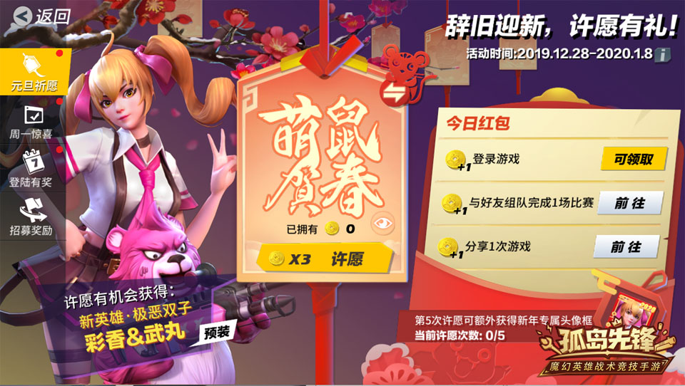圣诞狂欢余韵尚在,元旦福利席卷又至!网易首款魔幻多英雄战术竞技手游《孤岛先锋》12月26日更新抢先为元旦热身,海量道具福利接连登场,全新英雄极恶双子预装上线,参与元旦祈愿活动即可提前锁定!更有全新枪械礼包开启“符印”外观专场,海量商城新品陪你共贺佳节! 参与元旦祈愿 锁定双子英雄 在2019年12月28日至2020年1月8日期间,玩家参与“元旦祈愿”活动,按要求完成指定任务即可获得许愿币奖励。每消耗三枚许愿币可进行一次许愿,将有机会获得秘宝钥匙、金钥匙、英雄成长资源、钻石等丰厚奖励。 除了海量珍贵道具之外,各位先锋官还将有机会在祈愿活动中获得新英雄“极恶双子”预装礼盒,拥有礼盒的玩家可以在1月中旬新英雄上线后自动获得永久英雄极恶双子“彩香&武丸”。此外,累计五次许愿后玩家可以额外获得新年专属头像框奖励,享受开年新面貌体验。 符印注入威力 龙魂震慑四方 在《孤岛先锋》中,创意百变造型独特的枪械皮肤深受各位英雄喜爱,此次的全新枪械礼包专为单管猎枪打造,机械雕刻与符印元素共同构建出奇异美感,为这款经典火器附上神秘力量。玩家购买枪械礼包将有机会获得单管猎枪传奇皮肤“龙魂符印”,使用时还会出现定制淘汰播报。 礼包中还包括单管猎枪史诗皮肤“洋流符印”和“瘟疫符印”以及其他多款皮肤奖励,为玩家开启《孤岛先锋》专属时尚惊喜。 商城上新 精品任选欢乐过节 新年新气象,商城大焕新!《孤岛先锋》商城精品为玩家提供更多装扮选择,下落特效“自然礼赞”带你体验与自然融为一体的灵动,夜之魔女皮肤“万圣小恶魔”再现万圣惊魂夜的欢乐回忆,舞蹈动作“机械震感”开启每位玩家的机械舞天赋,让舞蹈休闲与激烈竞技相互调节,收获多方面娱乐体验! 网易首款魔幻多英雄战术竞技手游《孤岛先锋》元旦惊喜震撼开启,祈愿福利、全新英雄打造新年最嗨起点,开黑更流畅,体验更激爽!12月26号更新后冰雪女王开放限免,即刻登录游戏官网,更多游戏资讯为你助力,极致竞技等你参与! 关于《孤岛先锋》: 《孤岛先锋》 首创多英雄魔幻战术竞技玩法,六大首发英雄,技能自由搭配,隐身、突进、控制、伤害无所不能!全新魔幻世界,多种族地形植被;圣堂祈祷系统,装备助你火力全开;随身恐龙坐骑,一键召唤策马奔腾;双重复活机制,淘汰化身小萌龙,坚持就能原地复活!魔性趣味玩法,紧张刺激惊喜不断! |