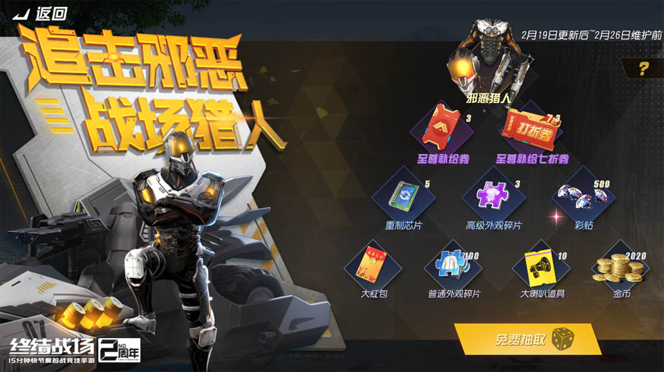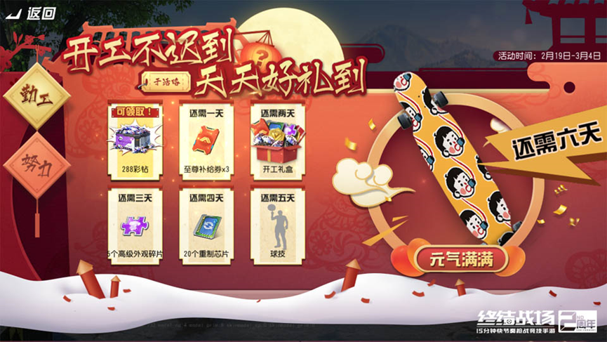原始力量,破风而来!网易快节奏开黑枪战竞技手游《终结战场》2月19日版本更新,“野蛮”组合突袭进入战场,面具战士驾“野猪”征战四方,让竞技开黑更具原始风情。同时春节活动相继下架,开工预热携手启动,陪伴玩家一起迎接春日挑战! 开工签到 至尊预热更多惊喜上线 伴随着假期的结束,为玩家带来海量福利的春节系列活动挥手告别,而开工签到又带来了新的惊喜。2月19日更新后,开工签到活动开启预览功能,在2月22日至3月4日期间,玩家可通过每日签到累计天数,并根据天数兑换领取相应的活动奖励。奖励包括随身载具滑板的全新外观“元气满满”、大量彩钻、至尊补给券、开工礼盒、外观碎片、重制芯片、特效动作等等,每种奖励只能领取一次。 本周至尊补给预热活动上线,玩家只需抽取当周枪械补给达到一定次数,即可获得大量《终结战场》实用道具,更有“邪恶猎人预装礼包”等你来拿。礼包中含超炫未来风格外观一套,机械战士化身战场猎人,让邪恶无所遁形! 枪械补给 冬日严寒变身战场利器 在本周枪械补给活动中,玩家除了有机会得到“邪恶猎人预装礼包”之外,更重要的是可以收获M134外观“M134-凛冬”、大马士革刀外观“寒霜战斧”、男性人物外观“寒冰咒师”以及女性人物外观“寒冰巫女”等特制皮肤。 本周枪械补给中的人物外观皮肤,采用了黑金双色,线条状护甲将人体力量与神秘色彩完美融合,充分展现了原始野性与庄重威严的双重美感。 载具补给 当野猪成为战士坐骑 在原始审美中,“野蛮”是力量的象征,更是战士必备的属性。而自然界中的“野猪”尤其以集冲撞力、奔跑速度、载人能力于一体而备受原始战士欢迎。现在,这样特别的“载具”来到了《终结战场》,玩家抽取本周载具补给即有几率获得随身载具“狂暴野猪”以及男性人物外观“野蛮骑士”,在2月26日前集齐狂暴野猪和野蛮骑士外观的玩家还将获赠飞饰“豚豚”。 打造超绝竞技体验,开启视玩多重享受!《终结战场》本周版本更新后,限免英雄阵容更换为赏金猎手、合成异兽、永生伯爵、幻星之梦,多职业合 关于《终结战场》 英雄归来,终结战场!2周年全新英雄模式刺激开战!彗星巨炮、特工潜行,召唤空投,任选秘宝,给你超酷超燃的对决体验!春节活动多重惊喜齐发,极致畅爽体验! |
