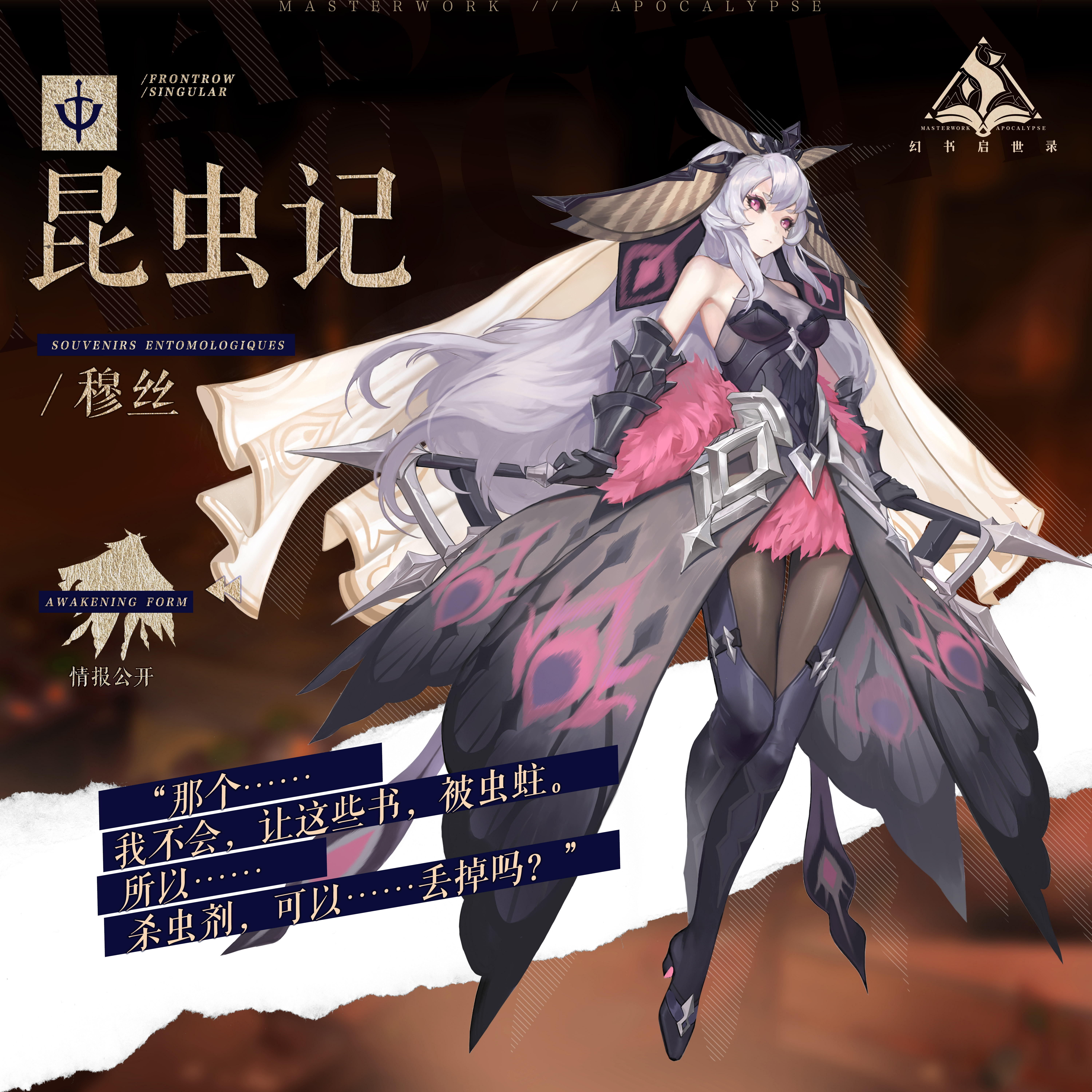 悠悠的白云悬在湛蓝的天空之中,日光则孜孜不倦地照耀着这名为“荒石园”的土地。在许多个为我们忽视的角落,在层层叠叠的枝叶之间,居住着无数的昆虫。与我们共存于一个星球的几百万种昆虫遵循自然的法则,为生存与繁衍进行着永不言弃的努力。 少女被观测到时,便和在这“荒石园”有关。她是名为穆丝的少女,她是《昆虫记》的幻书人形。 微小世界的悲喜剧,法布尔“昆虫的史诗” 与人类无异的是,昆虫同样拥有着丰富多彩的生活。在这部被雨果盛赞为“昆虫的史诗”的著作之中,我们能够窥见独属于昆虫的日常。无论是角落中蟋蟀的歌唱,还是笃耨香树上蚜虫的迁移,无一不展现着昆虫们的生机与活力。 由飞蛾化身而来的穆丝拥有着昆虫的习性,因而并不善于与人类沟通。她虽寡言而又沉默,却拥有着极为温柔的内心。飞蛾的趋光性牢牢地印刻在她生命的脉络之中,而这样纯粹的基因让她拥有了无可比拟的执着与坚定。她是英勇的战士,她拥有着为守护馆主而牺牲自己的觉悟。 少女现身颁奖典礼,彰显杀手的非凡能力 在空旷的会场中,所有人都屏息等待着颁奖主持人对于诺贝尔文学奖提名作品的介绍。在一片缄默之中,主持人的声音也显得格外清晰与嘹亮。他说:“这部作品蕴含着哲学家一般的思考,艺术家一般的观察,文学家一般的感受和笔触。它用诗篇歌颂科学,用蓝天下的荒石园代替实验室中的化学试剂……” 与主持人的慷慨激昂截然相反的是,现身颁奖典礼的穆丝显得格外的冷静克制。此时的她正潜伏在会场的角落,她纹丝不动的灰色裙摆仿佛与墙壁融为一体。在听到自己的名字时,穆丝的触须微微抖动了一下,随即便恢复了一如往常的平静。 阿克夏生活适应中,穆丝诠释友情的新定义 自来到阿克夏以来,穆丝始终在努力地适应阿克夏书馆的生活,并且自称已经与他人建立了亲密的人际关系。记录员虽然早已为自己做好了“穆丝对人类社会的理解能力不佳”的心理建设,却仍在亲眼见到穆丝所言的友情之时大跌眼镜。 穆丝每天都挂在自己朋友的花枝上,并且毫无心理负担地将朋友作为与自己共生的储备粮。对此忧心忡忡的记录员将此事报告给攸宁,而攸宁则对这种独特的友情表示了认可。 昆虫记与大自然,科学的奥义究竟在何方 对于大自然的探索是否存在永恒的正确方式呢?穆丝始终相信,真正的学者应脚踏实地地观察自己身处的世界,看看蓝天白云下的自然万物。 荒石园中的一切为法布尔所记录,并写成《昆虫记》永传后世。而穆丝则从《昆虫记》中了解了生命的价值,并在阿克夏中不断书写全新的故事。 |