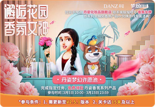 3.7女生节及3.8女神节到来之际,《梦幻花园》将携手丹姿,和广大玩家朋友一起踏上一场浪漫甜美的香氛之旅!即日起,来《梦幻花园》,除了感受花园的浪漫气息及爱不释手的游戏体验,更能享受到由丹姿带来的多重精美好礼。快来《梦幻花园》,过一个别开生面的女神节吧! 【邂逅丹姿 女神许愿池】 为了迎接女神节,《梦幻花园》联合丹姿推出“丹姿梦幻许愿池”活动。活动期间,只要完成指定任务,就能够免费领取丹姿香氛系列产品啦! 活动时间:3月5日10:00-3月15日23:59 参与条件: 1、游戏更新至V2.5.1版本 2、游戏关卡达到15关以上 参与方式: 1、进入游戏后,打开许愿池活动,选择心仪的周边,点击对应的周边图标 2、选择完毕后,点击提交按钮,一旦选择就不能更改啦,还请小伙伴们考虑清楚啦 3、接着邀请好友(注意:一定要是活动期间下载游戏的新玩家才算哟)下载游戏,一起开启浪漫花园之旅 4、当邀请的好友都闯过15关后,就能领取梦幻花园X丹姿送出的女神节礼物啦!女神礼物数量有限,先到先得。当礼物发完时,后续完成邀请任务的小伙伴将获得大量金币与道具奖励 【女神范 丹姿特别福利】 除了游戏内的女神节特别活动,丹姿还为这次花园女神节推出了额外福利。复制淘口令¥ITx81erR0f0¥,直接领取丹姿姿丝维丽香氛洗发乳20元现金券。想像珍妮和艾莉克斯一样,拥有靓丽秀发,让发丝持久留香吗?丹姿丝维丽香氛洗发乳你值得拥有!一起来花园邂逅浪漫甜蜜吧! 女神节,来《梦幻花园》,来一场浪漫甜美的香氛之旅! |