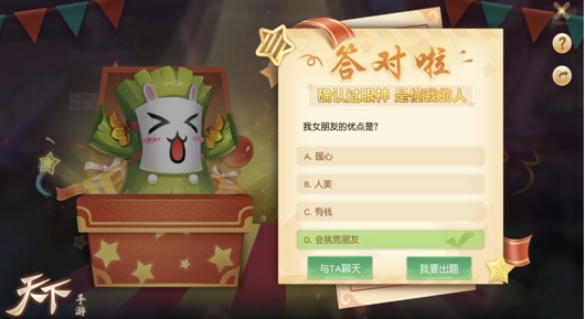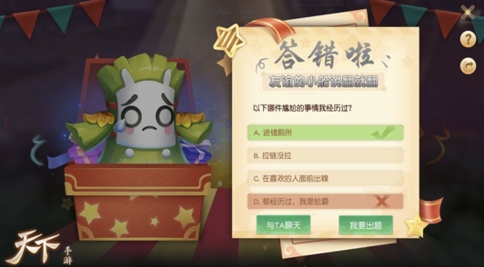 互相伤害才是友情的最好见证,愚人节“愚”你没商量!《天下》手游愚人节活动今日开启,整蛊也要抢占先机!“愚你同乐”活动为你准备好了海量送命题,想让哪位塑料亲友“送命”,就等少侠一句话!天域武器与大禹首饰从天而降?别做梦了,是天愚武器和大愚首饰!擦亮双眼,莫当愚人哦。愚人节彩蛋好礼点击就送,若是碰巧遇见空空如也的礼物盒……别怀疑,一定是皇帝的新礼物没错!愚人节活动给你爆笑欢乐,整蛊与被整只在一念之间,少侠准备好了吗? 【送分题or送命题?默契亲友“愚”你同乐!】 想测试与亲友的默契值吗?想给情缘来一发地狱级送命题吗?《天下》手游“愚你同乐”活动题库已为少侠备好,只等你来勾选正确答案!自选问题并勾选你心中的正确答案,发送给亲友等TA猜出你的选择。回答正确即有机会获得雷音溟钻、元魂精魄等好礼,回答错误则会有搞怪小惩罚!本次“愚你同乐”活动还将特别增加愚人节趣味评语,官方吐槽,最为致命!想GET愚人节官方点评吗,那就快来互送送命题吧! 【天域武器从天而降?醒醒,是天“愚”武器!】 天上没有掉馅饼的好事,但……却掉下来了天域武器和大禹首饰?醒醒,擦亮眼睛仔细看,是天愚武器和大愚首饰!除此之外,还有大愚之灵、天愚琉璃和圣灵软愚等神秘道具,少侠在获得这些愚人节专属道具时会触发世界通告和提示。萃取道具即可获得“愚乐值”声望,积攒声望还可获得愚人节礼包、特殊称谓和成就等神秘好礼呢! 【愚人节彩蛋真假难辨!少侠,你掉的是这颗金绣球还是银绣球?】 课程表中藏有神秘彩蛋?《天下》手游“愚人节彩蛋”活动等你捕捉好礼!打开课程表,点击周边装饰用的彩球,掉落胡萝卜砸中草精,就有机会获得愚人节礼物!什么?礼物盒中居然空空如也?那一定少侠上了调皮草精的当,拿到了假的课程表了!没关系,下一个课程表一定是真的!当然,少侠还有机会获得真·愚人节神秘礼物。礼盒当中究竟藏了什么好礼呢,亲手打开一试便知! 更多《天下》手游最新活动爆料与玩家投稿鉴赏等精彩内容,还请少侠继续关注我们! |