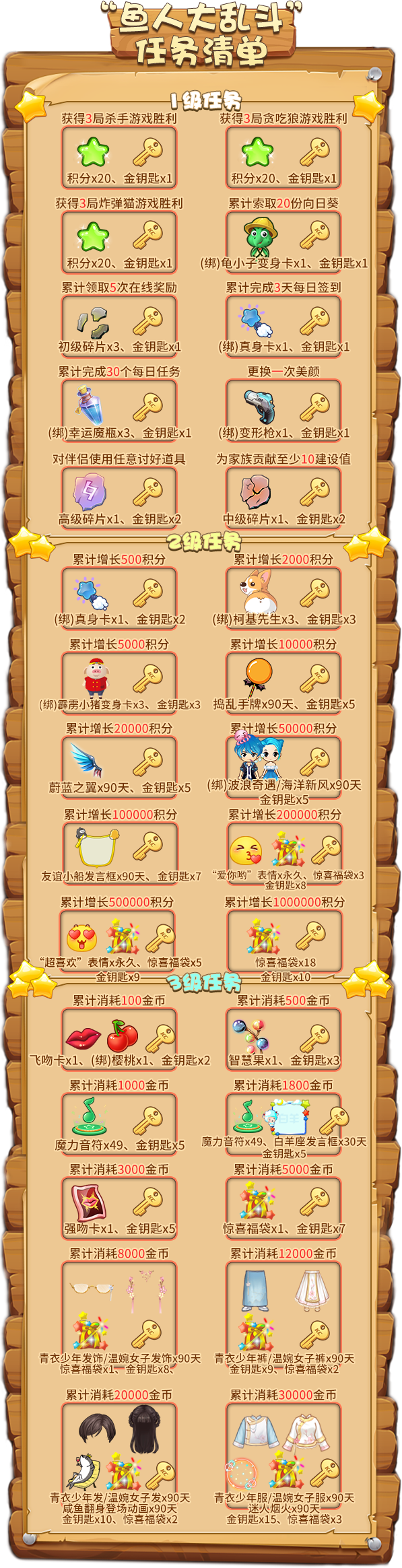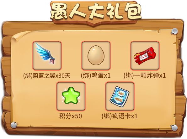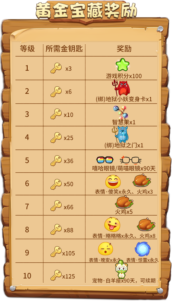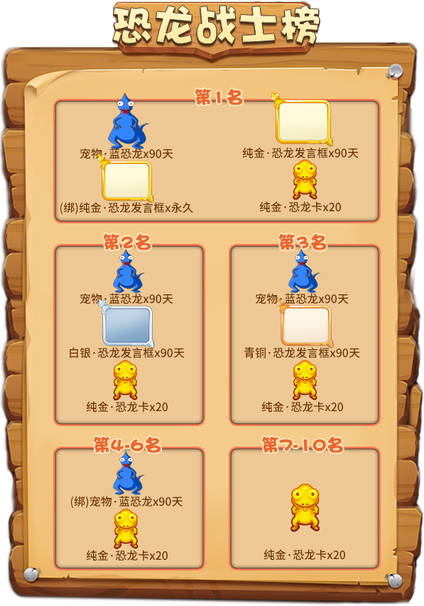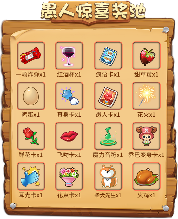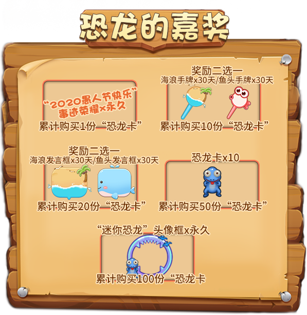 银砂海滩位于推理之都西面,这里白沙如雪,海水清凉,是推理之都引以为傲的“宝蓝明珠”,也是游客们必打卡的“网红旅游景点”。但在每年四月即将来临时,这里就会变成“禁地”——你不会看到神情悠闲的度假游客,只能看到严阵以待的护卫队员们。银砂海滩的另一面,是滔天骇浪,在白得有些可怖的浪潮之中,隐藏着面目狰狞的鱼人!这群张牙舞爪的怪物,每年都会登陆推理之都,给我们制造麻烦!拿上你的武器,朋友们,身为推理之都的一员可不能坐以待毙!为了荣(jiang)耀(li),让我们在愚人节活动开启时,战个痛快吧! 活动时间:2020年3月27日14:00-4月6日24:00 活动一:签到有礼,做好战斗准备 所有防卫队的队员们,请到这里来领取你们今天的作战物资! 活动期间,每完成1次普通签到或补签可累积1次“愚人惊喜奖池”抽奖机会!签到的天数越多,每天可抽奖的次数越多! 愚人惊喜奖池: 活动规则: 1. “愚人惊喜奖池”中的奖励均为绑定物品,不可交易、回收和续期; 2. 已获得的抽奖机会仅当日有效,次日需通过签到或补签重新获得。 活动二:鱼人乱斗,护卫行动开启 浪潮汹涌,遮天蔽日!鱼人大军即将登陆银砂海岸,推理之都的勇士们速速集结,抵挡哇哇乱叫的鱼人们!想要成为一名合格的防卫队员,既要完美地抵挡鱼人的进军,还要兼顾搜刮鱼人的物资,捣毁它们的窝点! 活动期间,三份任务清单等你挑战!每完成一项任务,都可以获得其中的奖励,击退鱼人,势在必行! “鱼人大乱斗”任务清单: 活动规则: 1. “1级任务”中,“炸弹猫”和“贪吃狼”游戏房间需至少保持5人及以上,“杀手游戏”游戏房间需至少保持12人及以上,并正常结束游戏才会统计任务; 2. “金钥匙”可用于在“黄金宝藏”活动中解锁稀有奖励; 3. “3级任务”中,通过商城购买金砖、购买金元宝、赠送,开通超级大咖所消耗的金币不计。 活动三:黄金宝藏,闪耀世界的奖励 付出就有回报!这可不是说说而已!在推理之都勇士们的强大火力下,鱼人们早已溃不成军!接下来,就是分发奖励的时候啦! 活动期间,完成任一任务即可解锁“黄金宝藏”,拿走丰厚礼物吧! “黄金宝藏”解锁方式: “黄金宝藏”等级与奖励: 活动规则:“金钥匙”将在活动结束后由系统自动回收,请小伙伴们在活动结束前及时领取所有奖励。 活动四:幸运基金,恐龙登场 在解决了疯狂的“鱼人”之后,我们现在又将面临新的挑战——这是你唯一一次能和远古时代的庞然大物们面对面接触的机会! 活动期间,每位玩家可花费5金币从该活动购买一份整蛊道具:“恐龙卡”,与此同时,《推理学院》将会赠送您一份“幸运码”并为“今日幸运基金”累计奖金。在次日00:00,系统将随机抽取一份幸运码,其拥有者将独享前一日“幸运基金”中的所有金币。 另外,根据您通过该活动购买的“恐龙卡”数量,为您赠送额外奖励: 活动规则: 1. “幸运抽奖码”仅当日有效,次日清除; 2. 通过商城购买“恐龙卡”不会赠送“幸运码”和额外奖励; 3. “幸运抽奖码”由系统随机抽取,并通过活动界面和系统邮件公告。 活动五:恐龙战士,英勇出击 请放心,我的朋友们,它们不咬人! 活动期间,接收非绑定整蛊道具:“恐龙卡”将不会扣除积分,而是增加相同的积分。每成功接收10个非绑定的“恐龙卡”即可获得一次“恐龙奖池”抽奖机会!有几率获得愚人节顶级纪念品:纯金·恐龙卡! 首次参与抽奖还可以获得“重返侏罗纪”个人资料背景图永久使用权! 恐龙奖池: 活动结束后,累计接收非绑定“恐龙卡”最多的前十位玩家,将成为“最强恐龙战士”,获得排行榜奖励! 恐龙战士榜: 活动规则: 1. 奖励:宠物·蓝恐龙、纯金/白银/青铜·恐龙发言框不可续期,但允许交易和回收(绑定奖励除外); 2. 纯金·恐龙卡将开启“道具勋章”,勋章升级条件需接收:3/10/30/80/120/200/500份“纯金·恐龙卡”。 活动六:游戏旅行,和春天约会 快乐的游戏旅行活动再次回归,一起来发现旅途中的超多惊喜吧! 活动期间,支付3000游戏币即可开启你的“游戏旅行”——在获得1~20随机数字的同时,你还能在地图上前进一格。 每一个格子都准备有礼物,越往后走,奖励越丰厚!在旅行途中,你可以立刻拿走当前停留格的礼物并退出这场旅行,如果你想继续领略世界的风光,你可以选择继续前进(无需再支付游戏币),并继续前进一格——但要注意!如果你之后出现的数字小于上一格出现的数字,那么您将立刻退出这场旅行,并且不会获得任何奖励。 当你想要重新开启一场旅行的时候,只需重新支付3000游戏币即可! “游戏旅行”的嘉奖部分奖励: 活动规则: 1. 每次退出旅行时,都会重置已前进的格子信息并回到起点; 2. 奖励均为非绑定物品; 3. 若活动结束后没有退出“游戏旅行”,则系统将自动为您结算当前停留格的奖励。 活动七:奇葩任务,好礼等你赢 《推理学院》发挥“愚人节”的幽默精神,为大家准备了“奇葩任务”! 活动期间,您可以通过任务名称猜测任务内容,当您完成任务之后,就可以领取奖励啦!当完成所有“奇葩任务”之后,可免费领取“奇葩之星”永久纪念勋章一枚! 活动规则: 1. 所有奖励只能领取一次; 2. 具体任务名称及奖励内容请以游戏内为准。 活动八:搞怪美颜,免费使用中 活动期间,八种愚人节限定美颜上线!而且所有玩家都能在活动期间免费更换“愚人节限定美颜”,一起玩个痛快吧! 活动规则:“愚人节