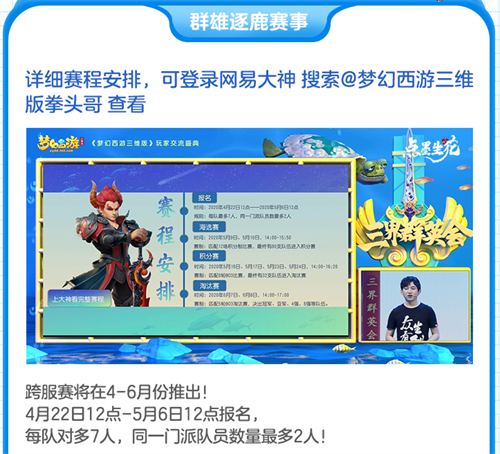 4月10日,《梦幻西游三维版》玩家线上交流盛典“三界群英会”如期举行。开发组成员在直播中解答了玩家问题,带来了关于新角色“逍遥生”、新门派“化生寺”、新玩法和跨服赛事等的最新爆料。而在线上交流会结束后,网易大神《梦幻西游三维版》圈子立刻同步了见面会内容,为大家带来最新最全的游戏相关资讯。玩家可以通过登陆网易大神搜索#见面会#,回顾“三界群英会”的精彩内容。 【新角色、新门派揭开神秘面纱,辅助玩家过年了!】 在《梦幻西游三维版》线上交流盛典“三界群英会”中,开发组对玩家关心的新门派和新角色进行了详细说明。正如大部分玩家所料,本次加入的新角色是风度翩翩的君子“逍遥生”,其游戏定位是给予友方回复的辅助角色,也就是俗称的“奶爸”。而新门派则是悬壶济世的“化生寺”,同样是偏重辅助与治疗能力的新门派。 除此之外,开发组还面对面回答了玩家现场提出的问题,涉及门派调整、藏宝阁上线、帮战新玩法等问题,整场见面会干货满满。具体内容,可以到网易大神《梦幻西游三维版》游戏圈查看。 【“逐鹿群雄”即将开启,跨服赛事等你参战】 除了上述的新内容,策划还为观众们介绍了此前已有少量消息流出的跨服赛事——“逐鹿群雄”。赛事预计将于4月22日开启,报名截止时间为5月6日12:00。玩家可以组成7人小队参与赛事,参赛队伍中同一门派队员数量最多两人。跨服赛暂定将分为海选赛、积分赛和淘汰赛三个阶段,最终将会有32支参赛队伍进入淘汰赛,冠军、亚军、4强、8强得主将在6月7日、8日的淘汰赛中揭晓。详细赛程安排,同样可以前往网易大神APP查看。 【网易大神《梦幻西游三维版》圈子带你回顾见面会精彩】 错过了“三界群英会”?朋友,网易大神《梦幻西游三维版》圈子了解一下!在4月10日线上玩家见面会结束后,网易大神《梦幻西游三维版》圈子第一时间同步了见面会内容,所有爆料资讯与策划回答都已收录#见面会#话题内,玩家可以随时前往圈子查看。此外,游戏策划现已入驻网易大神APP,如果你对游戏内容有任何意见或建议,可将内容发布到《梦幻西游三维版》圈子,开发组将不定期给出答复。 传送门:https://m.ds.163.com/topic/%E6%88%91%E8%A6%81%E9%97%AE%E7%AD%96%E5%88%92 【关于“网易大神”】 网易大神是网易游戏旗下的精英玩家社区。这里汇聚了广大精英玩家、游戏圈红人、行业大咖,集合了网易独家的官方资讯和福利趣闻,旨在为玩家打造一个丰富的游戏兴趣社交圈。玩家可以在网易大神与游戏中的好友实时聊天、多元互动;以游戏会友,结交更多游戏同好,和大神一起发现更多游戏乐趣。 |
