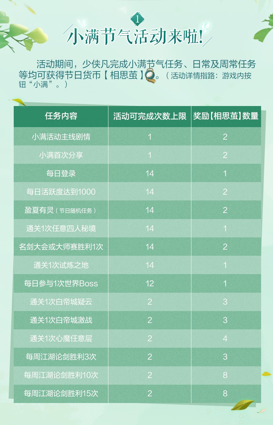 由西山居倾力制作、腾讯游戏独家代理发行的二次元武侠多角色手游《剑网3:指尖江湖》“在下,沈剑心”版本现正火热进行中!群侠聚首、酣畅燃斗,带你领略别样的二次元武侠世界。 夜莺啼绿柳,皓月醒长空。时临小满节气,小麦将熟,万物蓬勃生长。《剑网3:指尖江湖》游戏内也开启了小满节气活动!多重活动好礼相送,一起来看看吧! 【节日活动·小满】 活动时间:5月11日维护后至5月25日维护前(每日凌晨5点刷新)。 一、盛夏小满 小满节气活动期间,少侠可完成小满活动剧情【茧寄相思夏将满】,分享活动页面获得节日货币【相思茧】奖励。 二、活动内容 活动期间,少侠每日参与小满节日任务与日常,可额外获得节日货币【相思茧】奖励,此外,每周参与【白帝城】【心魔幻境】【江湖论剑】等玩法,更可额外获取节日货币【相思茧】奖励。 三、奖励兑换 少侠参加活动所获得节日货币【相思茧】,将用于兑换源明雅好感度道具【灵符】、非限定侠客好感度道具【莲芯茶】、有几率开出【未锻打飞仙玄晶】的礼盒【流晶溢璀匣】、【一级五行石】、小满节日头像框【燕于飞】等珍稀物品,本奖池兑换截止时间为6月1日维护前。 三妹小提示~【莲芯茶】可以提交好感度的侠客有:五门派弟子、李复、秋叶青、陈月、祁进、于睿、李忘生、木师傅、渡会、玄正、小七、高绛婷、叶芷青、曹雪阳、朱剑秋、李承恩、谷之岚、裴元、东方宇轩。 【英豪论剑 挑战赠礼】 5月11日维护后至5月25日维护前,江湖论剑开放时间调整为:每日12:00至24:00,且每日少侠前5场胜利可获得3倍【论剑币】奖励。 除此之外,活动期间少侠参与除当日大战秘境以外的【四人江湖秘境】,皆可额外获得1000金币与100侠义值奖励。少侠成功挑战秘境后,可以在秘境界面领取奖励! 【特惠礼包 助战江湖】 活动期间,太墟挑战包、秘境挑战包、心魔挑战包、初涉江湖礼包、试炼修行礼包、神兵淬炼礼包等多款礼包上架,多倍收益惊喜惠享,助力各位少侠挑战【云梦幽墟】【心魔幻境】玩法,快速成长助战江湖; |