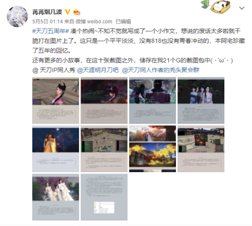 花开五载,共庆嘉年。天刀五周年同人嘉年华活动正在火热进行中,5+1丰富活动已全部开启,无论你是会画会写会剪辑还是会手工,都能找到适合你的舞台! 更有超多豪礼,除了高额现金、五周年主题外观天衣·紫宸、海量绑点外,更有同人限定动作、首款官方设定集、五周年限定周边礼盒等特别礼物哦~ 心动短视频大赛 活动时间:4月16日-5月20日 以“我为天刀五周年打call”为主题创作短视频,展现你在天刀最心动的内容,为天刀五周年打call!真人出镜、游戏内录、照片快闪等形式都可以,记录下在天刀每一个美好的瞬间,即有机会拥有超多丰富奖励! 详情点击: #天刀五周年#同人嘉年华今日开启,短视频大赛冲鸭! 五周年心动短视频大赛火热进行中!想不到使用什么BGM?刀娘来给你支招~ 部分作品欣赏: 少侠,你又在等谁呢? 我为天刀五周年生日打call #天涯明月刀 @天刀同人娘 https://v.douyin.com/oXa1Te/ 复制此链接,打开【抖音短视频】,直接观看视频! 作者:竹语(ID:青竹香) #天涯明月刀 你若战死,我便生死相随!我为天刀五周年生日打call @天刀同人娘 https://v.douyin.com/oXrdm6/ 复制此链接,打开【抖音短视频】,直接观看视频! 作者:@无霜wushuang52 心动COSPLAY大赛 活动时间:4月22日-6月10日 少侠只要以天刀端游或手游题材进行COS,即可赢取高额奖金、五周年主题外观、同人限定动作、称号等奖励! 详情点击: 通往五周年Cosplay大赛的马车即将启程,少侠快上车! 部分作品欣赏: CN:@行云 CN:@狐白Haku 第五届外观设计大赛 活动时间:4月29日-6月10日 第五届天刀外观设计大赛火热开启,参与就有机会赢取巨额现金、实装机会、游戏限定道具&称号! 本届大赛主题:天刀服装外观(除门派外装,风格不限)多才多艺的少侠快来找刀娘投稿吧~ 详情点击: 第五届天刀外观设计大赛今日开启!高额奖金、实装机会、官方故事设定集等你赢! 部分作品欣赏: 作者:@阿紫姑娘VV 作者:@金桔阿莫仙 作者:@猫滴狠maodihen 作者:@秦白_ 珍藏截图征集活动 活动时间:5月4日-5月20日 刀娘想看看你珍藏在文件夹一直不愿意删掉的天刀截图,更想听听这些截图背后的故事。或许它们只是随手时的一个定格,它可以是一张风景、一次战败、与多位好友的合影、甚至是多年前初入江湖时在藏锋谷的留念。 在微博话题#天刀五周年#下发布截图并@天刀IP同人秀 ,正文中附上截图背后的故事,说出它让你珍视的原因,就有机会赢取五周年主题外观、五周年限定官方周边礼盒和海量绑点! 详情点击: 五周年珍藏截图征集活动开启!我有酒你有故事吗? 部分作品欣赏: 作者:@苒苒烟几渡 作者:@三问今天玩天刀了吗 五周年生日祝福大征集 活动时间:5月1日-5月20日 五周年BOT正在营业中,你的祝福/建议/期待等以视频的形式发表,可以真人出镜,也可以游戏角色出镜,但生日祝福的音频需要用少侠们自己的声音哦。 参与就机会在五周年盛典当天的发布会上播出。还有机会将五周年主题外观等超多惊喜豪礼带回家!它可能只是简短的一个小视频,但对于刀刀来说非常珍贵,期待少侠的祝福! 详情点击: 五周年BOT来啦,送生日祝福赢海量绑点!周年外观!Q币好礼! 精彩活动全部奉上,超多丰厚的奖励等你拿!最后再次感谢所有爱天刀爱天刀同人的少侠,因为有你们的陪伴,我们才能一步步变得更好,这个江湖因你更精彩! 点击阅读原文还能收藏同人嘉年华活动传送门合集,期待你的参与! |