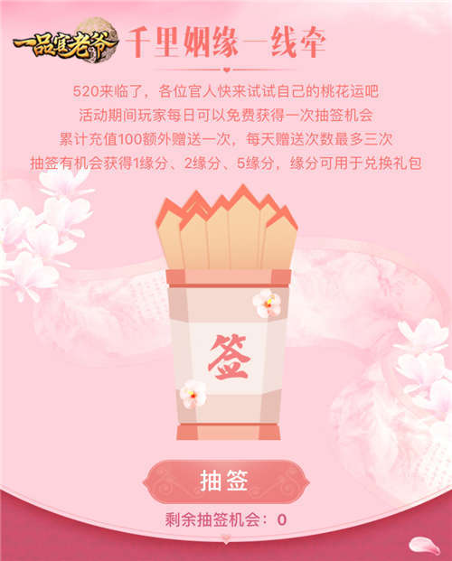 一年一度的520情人节即将来袭,不知道各位大人今年要如何度过?在这个充满爱意的节日里,无论你是单身汪还是秀爱狂魔,都可以来参与《一品官老爷》的惊喜爱情签活动,快来测试一下,领取你的520专属爱情签吧! 爱情签活动将于5月19日-5月21日开启,各位大人快来游戏测试一下自己的桃花运吧~ 在活动期间,大人们可以免费获得每日一次的免费抽签机会,累计充值100额外赠送一次,每天赠送次数最多三次,抽签有机会获得1缘分、2缘分、5缘分,缘分可用于兑换礼包。 缘分可以用来兑换三种礼包,三种礼包兑换分别需要2缘分、5缘分和7缘分,礼包里会有什么样的神秘福利呢?各位大人可以许愿期待哦! 再次提醒!福利多多的爱情上上签活动,将于5月19日正式开启~活动时间是5月19日~5月21日,各位大人千万不要错过啦! 那么今天,《一品官老爷》的爱情上上签活动介绍就到这里啦~希望各位大人都能够抽到称心如意的活动大礼包!更多游戏攻略玩法还有惊喜福利,请关注【一品官老爷手游】公众号。 【《一品官老爷》手游介绍】 《一品官老爷》是一款的古风官斗手游。游戏展现了古代尔虞我诈的官场智斗,颠覆传统的官斗玩法为你带来一场步步惊心的传奇。十年寒窗苦读,一朝金榜题名,官斗之余府邸小憩,娇妻相伴,金玉满堂,享田园轻趣时光;千古门客尽入门墙,谈笑间位极人臣;联盟争斗步步惊心,联盟战场一决高下。 |