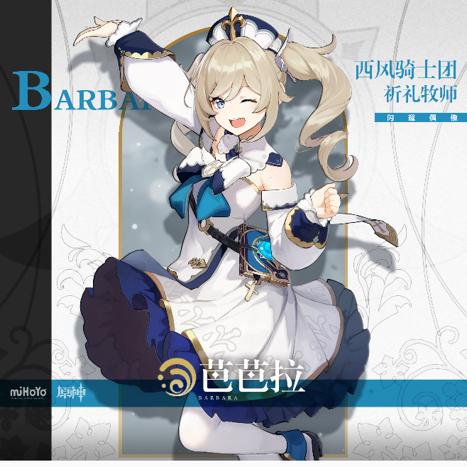 「偶像」对于蒙德人来说,不是神明一般遥不可及,而是看得见的美丽、听得到的福音——那就是芭芭拉,西风教会的祈礼牧师,也是蒙德的闪耀偶像。 芭芭拉的笑容与歌声能温暖人们的心灵,而她的魔法能治愈他们的病痛。 7月5日,是治愈系偶像芭芭拉的生日,不止可爱,还是实力派,请pick芭芭拉! 芭芭拉生日贺图(画师@呜拉祖啦) 【芭芭拉·治愈偶像,闪耀登场】 「只要看见芭芭拉小姐,心情就会变好!」 作为一名牧师,芭芭拉实在是过于有人气了。人们总是在西风大教堂门口徘徊,据说只要看一看她的笑容,或听到那美妙的歌声,便能被她的乐天阳光所感染,获得一整天的好心情。蒙德人将此称之为魔法,而在芭芭拉的心中,这种魔法名叫「切实的努力」。 闪耀偶像芭芭拉 【芭芭拉·元气满满每一天】 「我的愿望,是给身边的大家带来笑容。」 即便四下无人,芭芭拉也会摆动她纯白的裙裾,伴着优雅可爱的舞姿,唱起小调。无论何时,芭芭拉蓝白色的身影都令人们放心。当然,还有她温柔甜美的声线,能将患者的身心全都治愈。对于芭芭拉来说,大家脸上重新洋溢出的笑容,就是她最好的奖章。 「唔唔…芭芭拉冲呀!」 【芭芭拉·实力派的证明】 「努力是最神奇的魔法。」 芭芭拉的治愈能量,来自她的水属性神之眼。她的元素战技「演唱,开始?」会唤出跃动的水珠,对周围敌人造成水元素伤害,并施加潮湿状态;此后水珠转为歌声之环,为当前使用角色持续恢复生命值;元素爆发「闪耀奇迹」,能为队伍中所有角色恢复大量生命值。技能召唤出的星星与彩虹,汇成芭芭拉最闪耀的舞台。 芭芭拉「演唱,开始?」 芭芭拉「闪耀奇迹」 是战斗的强力后援,也是蒙德城的治愈偶像。生日快乐,芭芭拉,接下来的日子也要努力呀! |