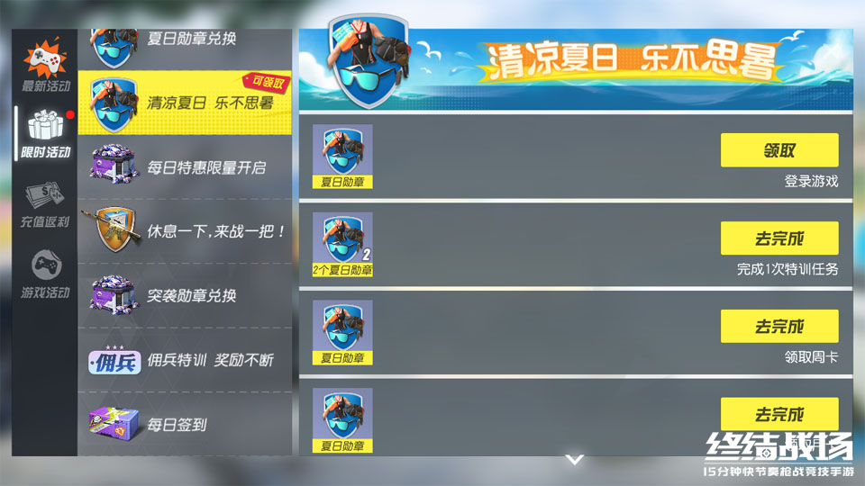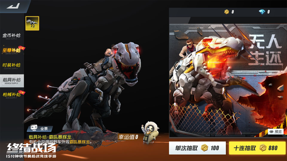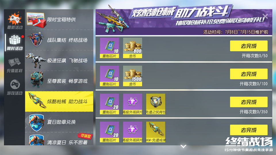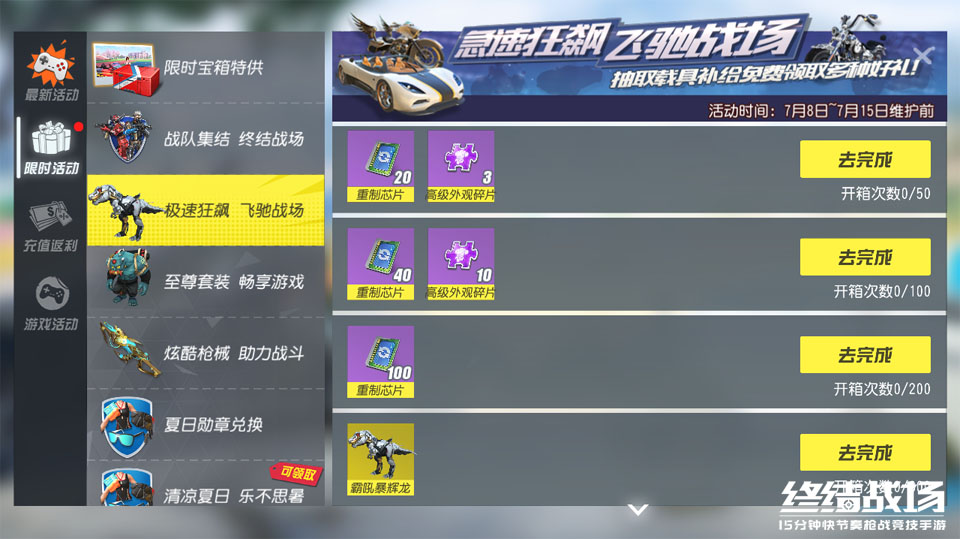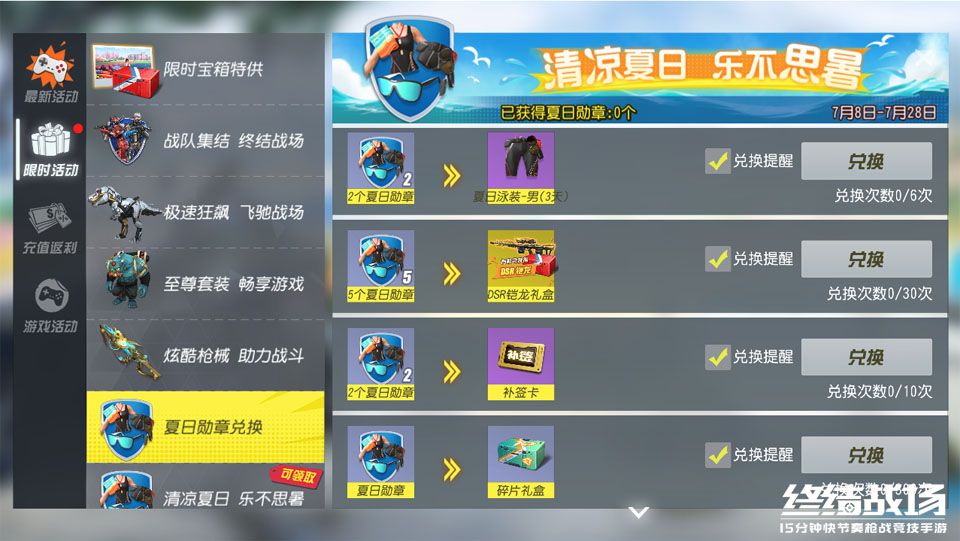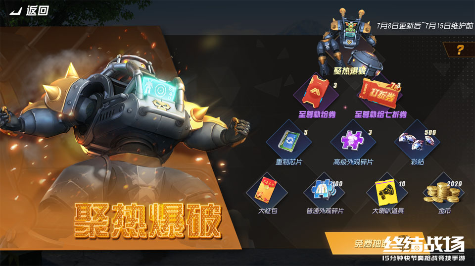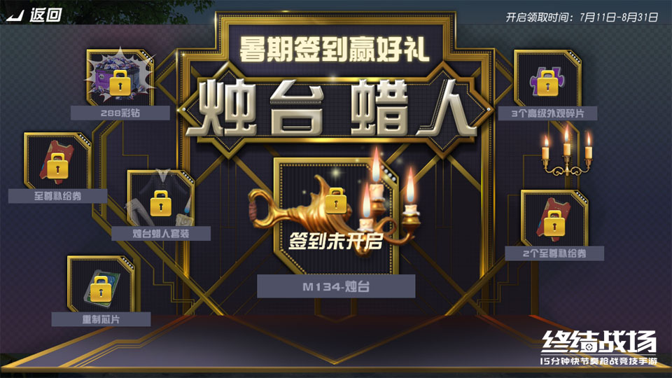 夏日酷热难耐,正宜夜行出击!《终结战场》7月8日更新后,玩家将迎来新一波的清凉福利。本周更新后,参与暑期签到活动,全新人物外观“烛台蜡人”、 枪械外观“M134-烛台”限时免费领取,为暑期夏夜打造魔幻惊悚风的惊险奇遇!更有蒸汽朋克风至尊预热礼包登场,勋章兑换、枪械返场、载具上新等惊喜一并开启! 暑期欢乐打卡 签到心跳好礼 暑期仲夏夜,《终结战场》永久珍稀外观免费派送!本周更新后,玩家只需参与“暑期签到赢好礼”活动,在指定页面进行签到操作,即可免费获得永久男性人物外观“烛台蜡人”、枪械外观“M134-烛台”以及大量彩钻、重制芯片、至尊补给券等物品奖励。 精美华贵的金质烛台构成了“M134-烛台”的枪身主体,点燃的蜡烛闪动着光芒,中世纪贵族喜爱的日用珍品摇身一变成了火力凶猛的未来武器,能够给你的敌人带来视觉与战斗的双重冲击。 男性人物外观“烛台蜡人”则拥有剪裁别致的精美套装,强健优雅的身体线条,是最完美的西式绅士形象,然而这一刻他的头部却变异成了点燃的白烛。这样的人形“烛台”不仅营造了浓厚的诡异气氛,也让玩家在酷暑中成了“清凉制造者”。 除了专属的签到活动之外,玩家还可以在“清凉夏日,乐不思暑”活动中完成任务收集夏日勋章。一定数量的勋章可以兑换各种实用道具,是《终结战场》为玩家带来的另一重暑期惊喜。 通过夏日勋章兑换活动,玩家还能够得到泳装主题外观、DSR铠龙礼盒、补签卡等实用道具。 先遣之民 暴吼巨龙 在神域纷争中存活并掌控了神秘力量的“先遣之民”再次进入《终结战场》,抽取枪械补给即有机会获得枪械外观“AKM-先遣戒律”、男性人物外观“先遣之民”、背包外观“先遣之民系列”。 除了通过抽取补给获得“先遣之民”系列外观之外,玩家也可以在“炫酷枪械 助力战斗”界面,根据开箱次数直接兑换枪械外观“AKM-先遣戒律”,背包外观“先遣之民背包”和其他游戏内道具奖励; 当人类误入恐龙世界,往往要面对“无人生还”惊恐考验,但在《终结战场》里,玩家却可以驾御这些恐怖的史前生物。抽取本周载具补给,即有机会获得越野车外观“霸吼暴辉龙”,让它陪你自由驰骋,迅猛作战。 除了通过抽取补给获得暴辉龙之外,玩家也可以在“极速狂飙 飞驰战场”界面,根据开箱次数兑换相关奖励物品。 蒸汽朋克 聚热爆破! 本周更新后至7月15日更新前,玩家在抽取枪械补给的同时,还有机会获得至尊补给预热活动中的“聚热爆破预装礼包”以及大量游戏道具奖励,包括金币、彩钻、重制芯片、至尊补给券、红包、喇叭等实用道具。获得预装礼包更是可以提前锁定新版本“聚热爆破”外观套,在下周抢先变身朋克战士,享受蒸汽狂想中主角的待遇。 让烛光照耀竞技舞台,玩转中西魔幻外观!本周维护更新后,《终结战场》限免英雄阵容变更为战场指挥官、赏金猎手、合成异兽、灵鸦侍者、永生伯爵与火箭骑士,彪悍战力争论高下,团队配合战术烧脑,英雄之战全面爆发! 关于《终结战场》 英雄归来,终结战场!2周年全新英雄模式刺激开战!彗星巨炮、特工潜行,召唤空投,任选秘宝,给你超酷超燃的对决体验! |