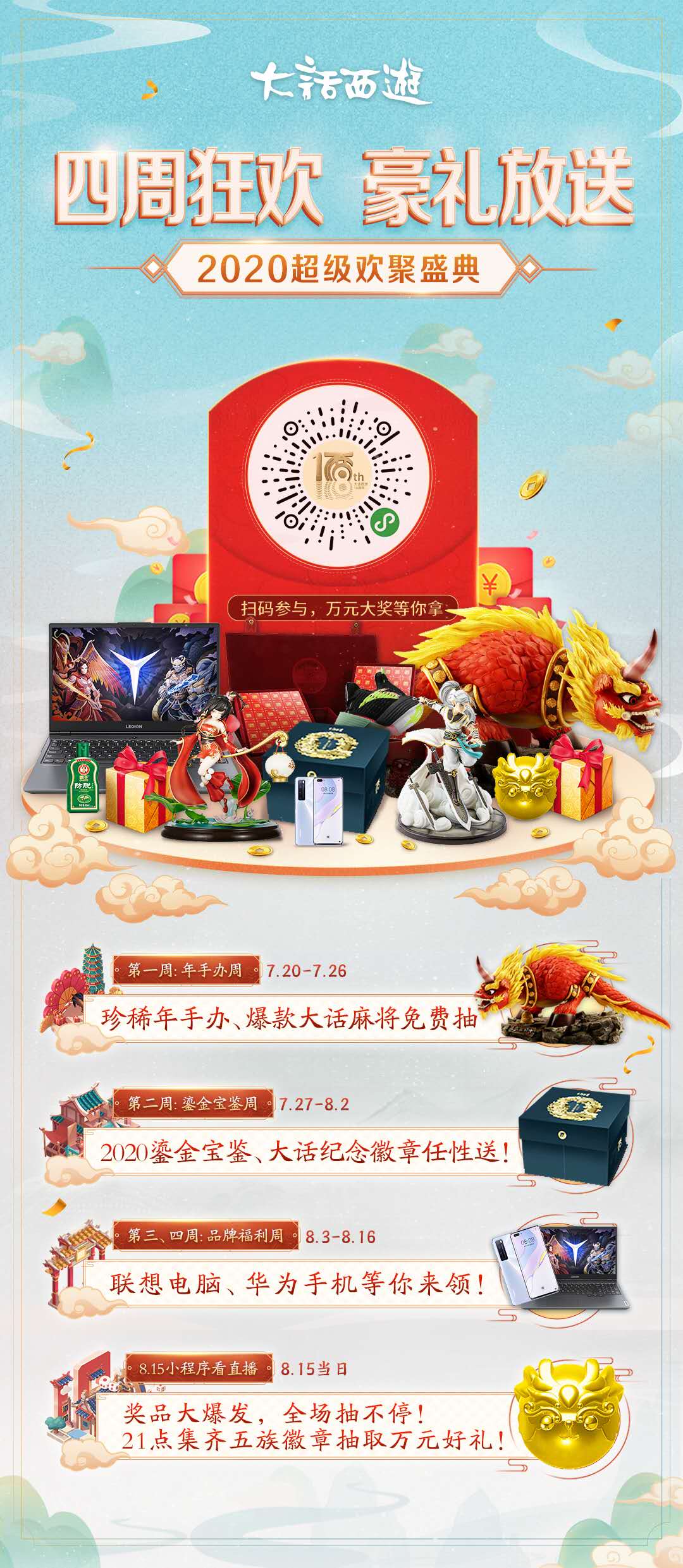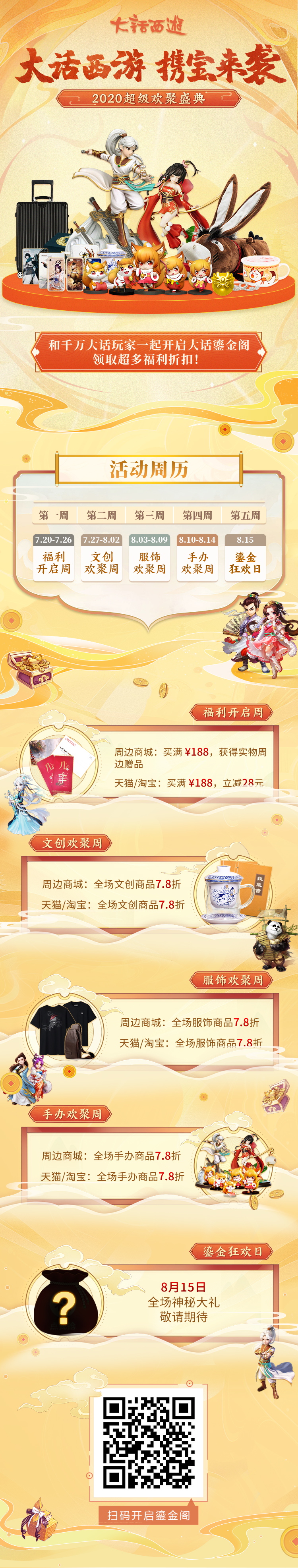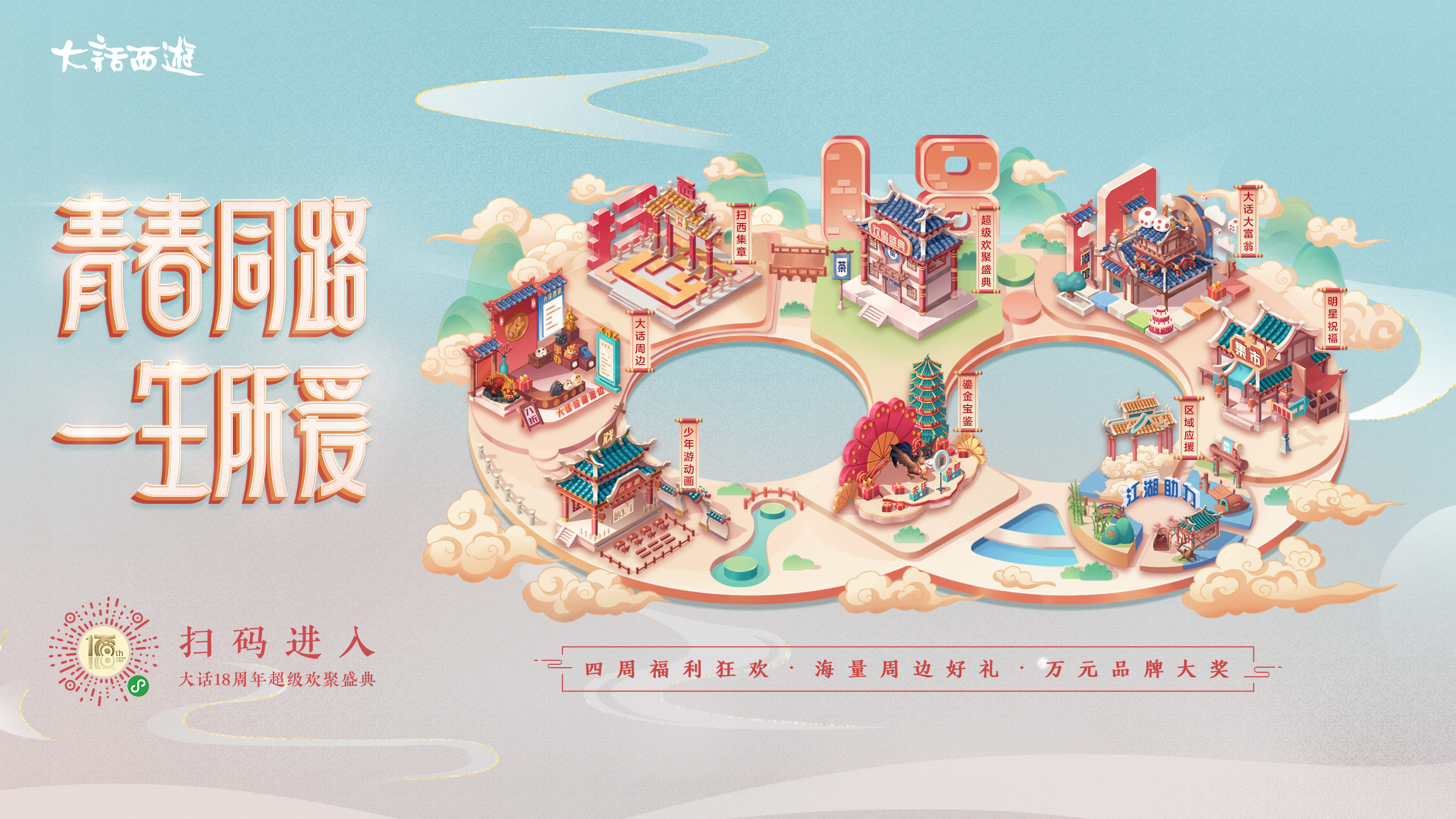 青春同路,一生所爱! “大话西游”大品牌18周年超级欢聚盛典今日正式拉开帷幕,盛典福利月今日同步开启,一场 18年来最强预热活动上线!打开小程序扫“西”字就有机会赢取珍稀年手办、欢聚盛典线下分会场活动即将开启报名、国货联盟大牌携手献礼、大话周边商城更有多重福利从天而降,千万不要错过! 扫“西”集徽章 免费赢取年手办! 全新“大话18周年超级欢聚盛典”小程序今日正式上线,一系列超值福利将陆续降临,大话兄弟们千万不要错过! 首周福利已正式开启——【大奖珍稀年手办】,各位玩家扫描下方小程序码或进入微信搜索“大话18周年超级欢聚盛典”即可进入小程序,参与“收集5族徽章”趣味玩法,使用手机摄像头扫“西”字或邀请好友来共同收集徽章,都有机会参与抽奖,赢取珍稀年兽手办以及上百件精美大话周边! 线下齐欢聚!欢聚盛典分会场报名开启 虽然大话十八周年超级欢聚盛典将在线上举办,但专属于大话玩家的线下欢聚不会停止。今年的超级欢聚盛典将同步在线下开设东北、华北、华东、西北、西南、华中、华南七大区主题分会场,走进全国11个城市,和各地的大话兄弟们共度欢乐时光。 每一个区域分会场都将结合当地的地域特色,为玩家们打造不同主题的丰富活动。线下分会场报名将于明日(7月21日)正式开启官网报名通道,欢迎大话玩家们前来线下活动现场,和好友们聚首畅聊! 大牌齐贺!国货联盟献礼周年庆 国潮齐聚,玩转“话”样!在大话十八周年到来之际,大话国货联盟正式“成立”。大家熟悉的国货大牌纷纷来贺,携手大话带来丰富定制福利。 今日首个国货正式公开,《大话西游》x《虎邦辣酱》定制辣酱率先亮相!玩家只需参与“大话18周年超级欢聚盛典”小程序中的扫“西”字集徽章活动,就有机会获得《大话西游》x《虎邦辣酱》定制辣酱和其他奖励!大话也将携手更多国货品牌继续进行多维度联动合作,为玩家们带来更多新意! 狂欢折扣!大话周边商城携宝来袭! 在大话十八周年超级狂欢庆典期间,大话周边商城也将带来一系列惊爆折扣活动,超值福利持续整整一个月,每周都有不同惊喜。即日起,“福利开启周”活动将率先登场,截至7月26日期间,在周边商城实际消费满188元,就能获得大话西游明信片实物周边,还有几率获得惊喜红包;此外,在京东/天猫大话旗舰店消费满188元,立减28元! 之后不仅每周都将有福利活动登陆大话周边商城,8月15日更将有全场神秘折扣活动,敬请期待! 青春同路,一生所爱。“大话西游”18周年超级欢聚盛典今日正式开启,最强预热活动接连登场,海量福利大放送!现在就前往“大话18周年超级欢聚盛典”小程序参与各种趣味玩法,玩家扫“西”集徽章即可参与抽奖,有机会赢取珍稀年兽手办! 快来参与丰富的周年庆典活动,享受超值福利,赢取丰富奖品,和兄弟们一起为大话庆生吧! |