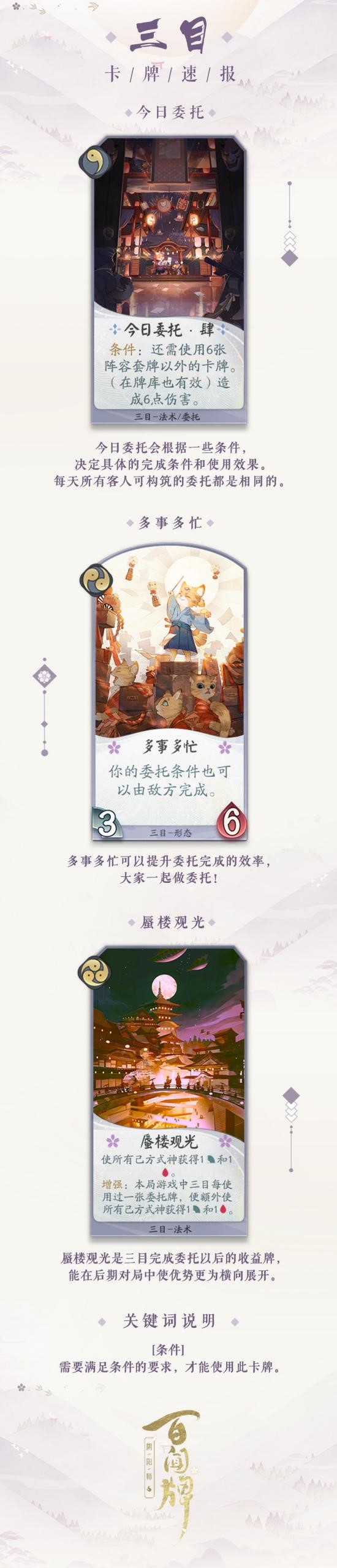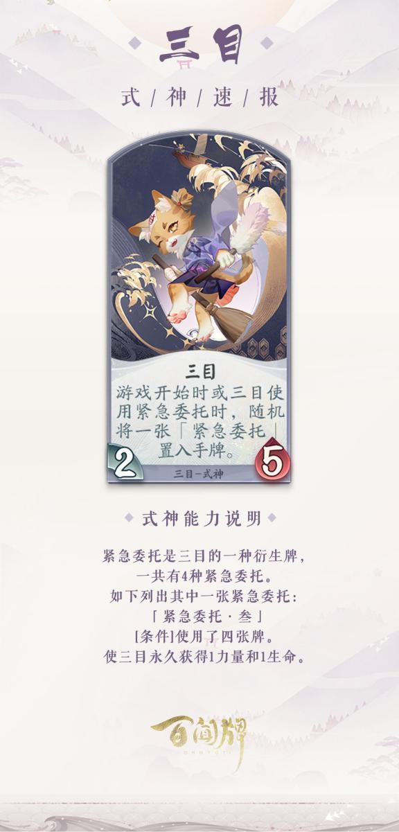 当沧海刀鸣的前奏响起,网易无套路妖怪对战卡牌手游《阴阳师:百闻牌》即将迎来全新资料片。近日,游戏公布了多位新式神,其中百闻牌的首位原创式神——猫妖三目,也会带着他的委托加入牌局! 蜃气楼第一武士?三目转正排面满满 “阴阳师”系列中,《阴阳师》里的扫地工、《决战!平安京》里的樱子,还有《阴阳师:百闻牌》里的三目,《阴阳师:妖怪屋》里的卡米酱,都是大家最熟悉亲切的NPC。他们不仅带着大家体验游戏中的诸多玩法,也会第一时间给玩家们带来第一手的爆料资讯。另外,衍生作品中的式神,总是会稍晚于原作,或同步上线。 如今,三目作为《阴阳师:百闻牌》里的重要NPC,正式宣布将在9月“沧海刀鸣”资料片中登陆百闻牌局!三目立下豪言壮语,自称与大岳丸、鬼切等式神实力相当。对此,《阴阳师》与《决战!平安京》、《阴阳师:妖怪屋》也作出了回应,对三目的排面表达了羡慕嫉妒恨。 懒散猫侍应的梦想 牌局上的紧急委托 作为蜃气楼的猫侍应,三目是一位有着姜黄色毛发,额头贴着眼睛状刘海贴的矮小可爱猫妖。他的梦想是有一天可以成为强大的猫武士。对于他来说,他的鸡毛掸子和扫帚就是他的武士佩刀,总是像佩戴宝刀一样带着。虽然三目平时有些懒懒散散,可他还是会认真应对客人们的委托的。“摸鱼是为了更好地工作”,难道不是吗? 牌局中的三目同样有一些特殊的设定,即他的“紧急委托”。三目的基础能力就是在游戏开始时或他使用该卡牌时,随机置入一张“紧急委托”手牌。目前,三目的紧急委托一共有四种,比如说“紧急委托·叁”,需要在使用了四张牌的条件下打出,可以让三目永久获得1力量和1生命。 三目的卡牌情报 达成条件强势触发 除此之外,三目的三张卡牌也得到了曝光。“今日委托·肆”是在使用过六张阵容套牌以外的牌的条件下,才能打出的,可以造成六点伤害。“多事多忙”是一张形态牌,在该形态下的三目,可以让敌方来完成委托牌的条件。“蜃楼观光”可以使己方所有式神获得1力量和1生命,效果会随着三目使用的委托牌数量而叠加。 以上得知,三目的上线,将带来一类特殊的卡牌,“委托”牌。这些牌需要在特定的条件达成之时,才可以打出触发效果。同时,委托牌也具有相当强大的能力,一旦触发会让敌方十分头疼。 《阴阳师:百闻牌》特殊NPC转正式神,三目带着他的紧急委托即将在“沧海刀鸣”版本上线,你准备好做委托了吗? |