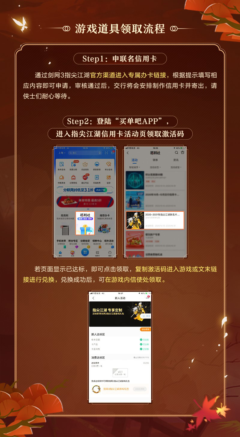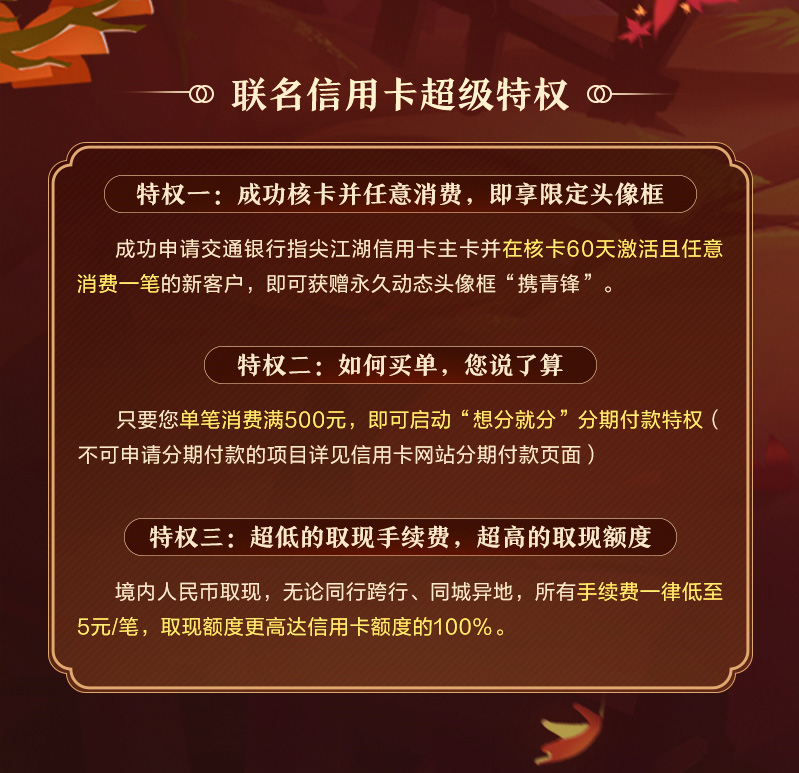 由西山居倾力制作,腾讯游戏独家代理的二次元武侠多角色手游《剑网3:指尖江湖》全新版本“虎啸龙吟”火爆进行中! 万众瞩目!《剑网3:指尖江湖》x交通银行联名信用卡来啦!即日起-2020年12月31日,前往交通银行活动页面进行申请,即可获得《剑网3:指尖江湖》定制联名信用卡,黑金配色尽显尊贵,超人气侠客叶英跃然于卡面,不仅实用,更具收藏价值!此外,参与活动更有永久动态头像框“携青锋”相赠,开办新卡更享诸多尊贵特权! 【参与活动 赢诸多福利】 【游戏道具领取流程】 【多项特权 尊贵享受】 |