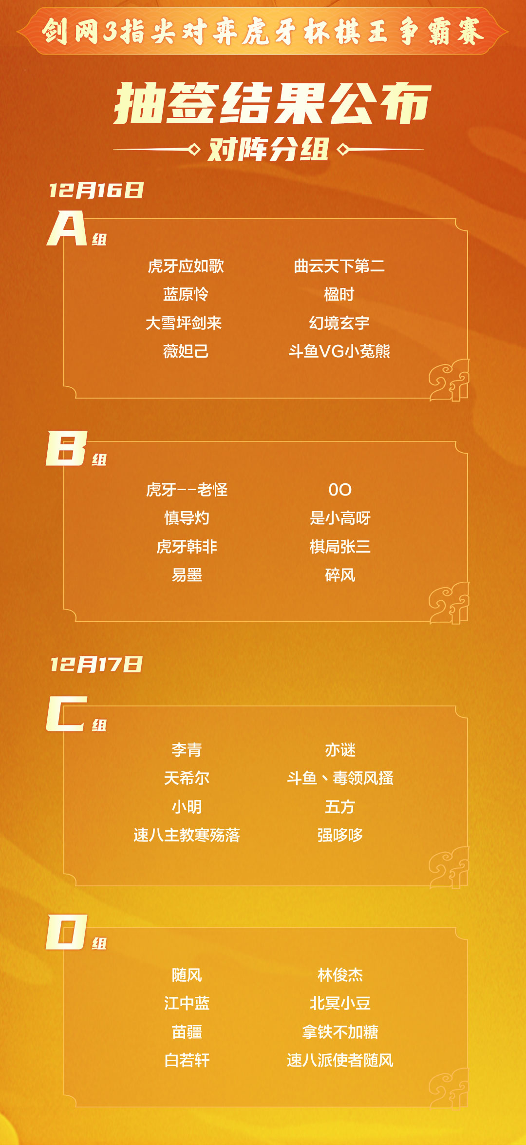 大唐顶尖棋圣齐聚于此交锋棋技,好礼多多拿不停!首款武侠自走棋——亲友必备的摸鱼神器《剑网3指尖对弈》第一届虎牙杯棋王争霸赛12月16日高能来袭!比赛将于2020年12月16-20日及23日每天晚上19:30开始!参赛选手高手如云,赛事奖励丰厚!夺得冠军还可一人独揽20,000元现金大奖!参与竞猜与围观活动,还可获得海量元宝与游戏道具! 赛事详情如何?竞猜及围观好礼如何获得?究竟谁能夺得20,000元现金大奖?相信各位侠士一定十分好奇,资讯君这就带大家一探究竟! 【棋王对决当有豪礼助兴——奖励详情】 2020年12月20日正式赛的总决赛结束后,大唐棋圣根据其积分排名,可获得相应奖励。赛事中夺得第一名还可斩获20,000元现金大奖! 不仅如此,本轮赛事还设置了众多福利活动,大家快随资讯君一起先睹为快! 每日参与竞猜,好礼拿不停!在赛事进行期间,各位侠士可在《剑网3指尖对弈》的游戏邮箱内获取多张【竞猜券】;若能正确猜中获胜选手,则有机会获得海量元宝及【鎏金钥匙】!各位侠士不要错过哦! 围观还能拿好礼!每日前往直播间观赛或参与赛事专题活动,不仅可以观赏大唐棋圣间的巅峰对决,还可获得抽奖机会!参与抽奖就有可能随机获得橙色侠客【李复】、限时棋手【心魔·贪】等珍稀奖励! 虎牙直播房间号:22691500、20063540、551423 【虎牙杯棋王争霸赛——16日、17日淘汰赛对阵详情】 对弈赛场,高手如云!一番选拔后,最终将有32名大唐棋圣将参与本轮赛事的正式赛,更有3名人气解说为大家现场讲解!淘汰赛的抽签分组现已完成,详情如下图!↓想知道谁将成功晋级?那就一起来直播间围观吧!想了解赛制详情,见文章结尾处↓ 【众星齐聚,共战弈局——主播娱乐赏金赛详情】 2020年12月23日将开启主播娱乐赏金赛!人气主播同台竞技,最后究竟谁能脱颖而出?让我们拭目以待! 高能赛事现已来袭,诚意活动好礼不停!前往观赛或参与竞猜还可获得海量游戏道具!首款武侠自走棋——亲友必备的摸鱼神器《剑网3指尖对弈》邀您下载体验! 首届棋王争霸赛详细规则如下: |