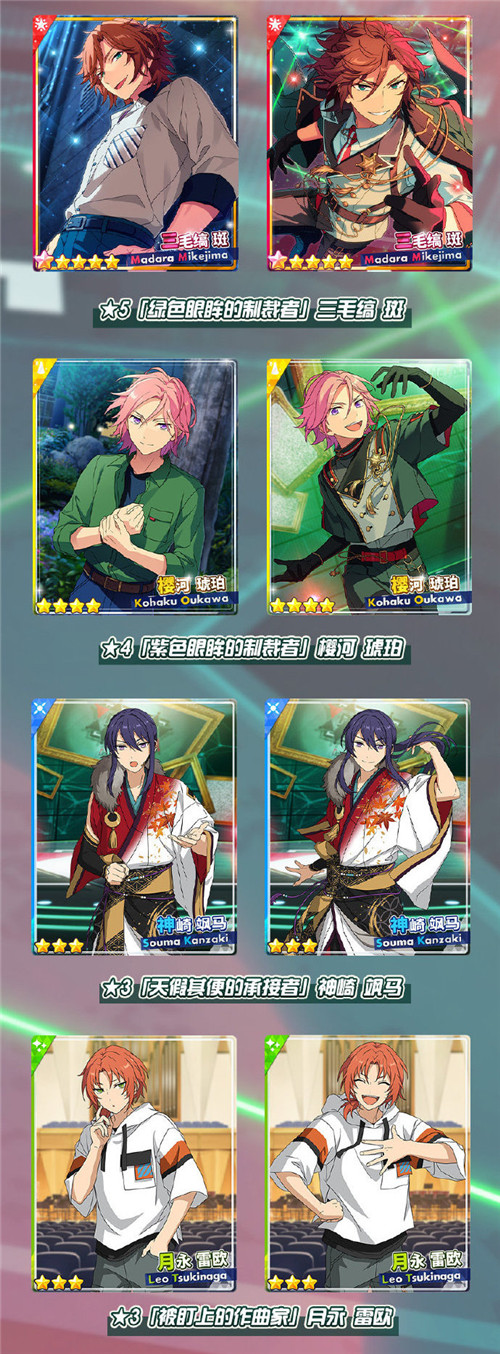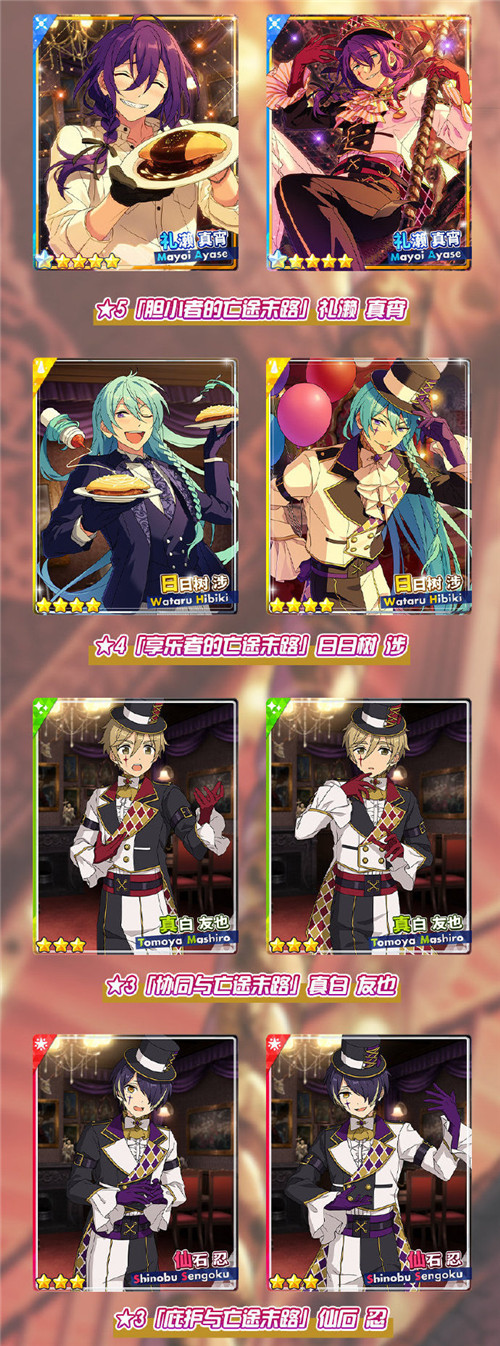 当春日渐暖,合唱广场也有不可思议的事情正在发生,琥珀与斑组成了全新组合「Double Face」,开始了一系列的调查活动……《偶像梦幻祭2》全新活动「新秀登场!觉醒时分的暗夜行路!」已正式开启,「招募!亡途末路游乐场」限定卡池、「新秀登场!觉醒时分的暗夜行路!」演唱会活动将和大家见面。下面就来看看本期活动指南吧! 「招募!亡途末路游乐场」限定卡池开启 全新限定卡池「招募!亡途末路游乐场」目前已经正式开启,将于4月9日12:00结束。★5【胆小者的亡途末路】礼濑真宵、★4【享乐者的亡途末路】日日树涉、★3【协同与亡途末路】真白友也、★3【庇护与亡途末路】仙石忍,活动卡牌在活动卡池掉率提升! 将活动卡编入队伍,也会获得「新秀登场!觉醒时分的暗夜行路!」演唱会活动的加成。 此外,「招募!飞舞蜜蜂」的卡片将在「招募!亡途末路游乐场」开放后加入常规招募。加入上级招募的是:★5【勤劳飞舞的蜜蜂】樱河琥珀、★4【不劳而飞的蜜蜂】天城燐音、★3【空腹飞舞的蜜蜂】椎名丹希、★3【观察飞舞的蜜蜂】HiMERU,以上卡片★4、★3也会加入海选招募。 同时「招募!人偶玩具小屋」于3月26日12:00 停止招募,请各位制作人注意结束时间。 「新秀登场!觉醒时分的暗夜行路!」活动开启 琥珀出于某些原因开始收集情报。在沿着线索追踪调查之时,琥珀遇到了察觉事情有异的斑。得知琥珀调查的人物与雷欧有关之后,斑试图加入搜查工作…… 全新演唱会活动「新秀登场!觉醒时分的暗夜行路!」于3月27日12:00正式开启,并将于4月4日22:00结束,三毛缟斑、樱河琥珀组成全新组合「Double Face」,为制作人们带来新活动歌曲「=瞳=」。 本期登场卡片为★5【绿色眼眸的制裁者】三毛缟斑、★4【紫色眼眸的制裁者】樱河琥珀、★3【天假其便的承接者】神崎飒马、★3【被盯上的作曲家】月永雷欧,这四张限定卡牌将在活动中与大家见面了,此次演唱会活动奖励卡片均附有MV服装及特殊演出。 此外,本期活动将开启丝带兑换所。通过演唱会收集「暗夜行路丝带」,在丝带兑换所中可兑换【钻石】、【ES硬币】、【各色宝石】多种道具。 「新秀登场!觉醒时分的暗夜行路!」活动指南 在活动「新秀登场!觉醒时分的暗夜行路!」完成演唱会和偶像工作收集活动pt和活动通行证,使用活动通行证可挑战活动歌曲获得大量活动pt;累计活动pt可获得活动限定卡片等奖励! 在活动期间,制作人可通过通常乐曲、打工获得活动pt以及活动道具。通过积攒活动pt,大家可以获得活动卡牌。如果希望活动卡牌综合值更高,需要收集足够的材料和提高足够的等级,让自己的卡牌达到满破,这也需要通过积攒活动pt实现哦!活动pt和演唱会举行的分数有一定相关性,大家可以尽量让高阶、高等级、原唱、与歌曲属性相同的角色出场,这样就会获得更高的演唱会分数。 在限定活动期间,每日登录可领取活动支援奖励: 3月28日首次登录可领取【活动通行证x100】; 3月29日00:00-4月4日22:00期间内(共7天),每日首次登录可领取【活动通行证x50】。 琥珀与斑组成的新组合——双眼的灰之猎犬「Double Face」,相信能在「新秀登场!觉醒时分的暗夜行路!」活动中为制作人们带来无限惊喜!敬请期待他们在舞台上的活跃表现吧! |