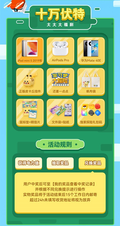 随时随地,尽情探险!由网易、The Pokémon Company、GAME FREAK inc.合作开发的正版宝可梦手游《宝可梦大探险》全新资料片“奇遇之境”现已正式上线,你是否已经向奇遇挑战发起了冲刺?《宝可梦大探险》与怪兽充电联动活动“十万伏特 满电探险”盛夏时节,惊喜开启,联名定制宝可梦充电宝助你电力十足,专属福利等待幸运锦鲤,还有转发福利倾情奉上,让我们一起,开始探险吧! 探险时刻,无惧电量考验 轻松趣味的方可乐岛之旅,已经成为了许多探险家暑假里的度假首选,哪怕顶着烈日外出,也关注着营地里料理烹饪的进度和探险好友的动态,利用空闲时间来上几把探险家大赛,更是放松心情的上佳选择,但若是手机电量过低,便无法登岛嬉戏。幸运的是,有怪兽充电助你随时电量充沛! 7月9日至15日,《宝可梦大探险》与怪兽充电联动活动“十万伏特 满电探险”在全国同步开启,遍布千余座城市众多商户的怪兽充电柜式机上,将出现《宝可梦大探险》联名定制的充电宝,探险家们只需进入“怪兽充电小程序”,点击活动页面,点击地图中的皮卡丘、小火龙、杰尼龟等宝可梦头像,便可获知联名定制充电宝所在充电站的位置,前往扫码取出,就能让方形皮卡丘为你的手机充电,再也无惧电量考验! 联名定制,营造完美体验 怪兽充电与宝可梦大探险联名定制充电宝共有六款,分别为皮卡丘、杰尼龟、小火龙、耿鬼、妙蛙种子和胖丁,其中皮卡丘还配备了游戏内首款S级饰品“冲浪板”,背面图案则均为皮卡丘、伊布和小火龙的合影,三位人气宝可梦同框亮相,邀请探险家们即刻充电,一起出发! 除了精益求精的外观,联名定制充电宝的内在也毫不含糊,三线设计、极速快充、异地借还、数据安全等特性,将让探险家收获快速充电体验的同时,也无需担心适配、归还和安全等问题。 助力探险,更有丰厚好礼 联动期间,《宝可梦大探险》还将携手怪兽充电为探险家们带来超级福利——关注怪兽充电官方微博,转发活动文案,便有机会将成套宝可梦抱回家;根据规则在微博上晒图、留言或在微信上留言互动,即有机会赢得联名定制充电宝或周边好礼;参与趣味活动,截图生成属于你的本命宝可梦海报并分享,还有概率获得额外惊喜。 奖励可不止于此!探险家们在联动活动期间租借联动定制充电宝便可获得电力值,租借其他充电宝或分享联动活动亦可获取电力值奖励,电力值可用以在十万伏特界面抽奖,华为Mate 40E、AirPods、iPad和宝可梦大探险精美周边、独家礼包等好礼等你抽取! 探险不停,欢乐无限!网易正版宝可梦手游《宝可梦大探险》与怪兽充电联动活动开启在即,联名定制充电宝惊喜上线,让皮卡丘为你释放十万伏特,伴你满电探险! 关于《宝可梦大探险》 《宝可梦大探险》英文原名为《Pokémon Quest》,是株式会社ポケモン (The Pokémon Company)发行的Nintendo Switch和手机平台游戏,上线一个多月,累计下载量达到750万次,深受国内外玩家喜爱,目前国服版本由网易、The Pokémon Company、GAME FREAK inc.合作开发。 |