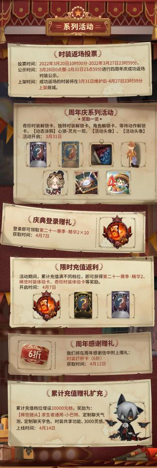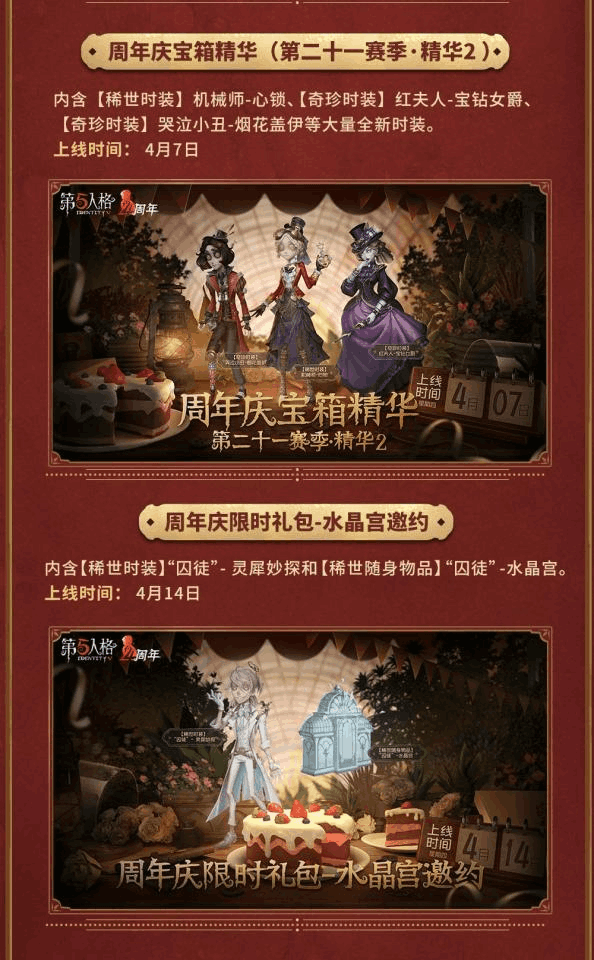 四载陪伴,欢乐同行。盛典将至,共赴未来!网易首款1V4非对称竞技手游《第五人格》四周岁生日日益临近,盛大的庆典活动已经准备就绪,丰厚诱人福利等你来领取,海量新鲜内容随邀你再启程! 接下来,让我们抢先一睹四周年庆的精彩活动,与《第五人格》以及侦探们一起,静候四周年的到来! 周年新版,讲述全新故事 时光倏忽而过,《第五人格》即将迈入第四个年头,四周年版本将于庆典期间正式上线,为你讲述新的故事,带你亲历新的旅程。 周年庆宝箱精华将于4月7日亮相,机械师迎来了首款限定稀世时装“心锁”,红夫人奇珍时装“宝钻女爵”与哭泣小丑奇珍时装“烟花盖伊”等大量全新时装也将联袂登场。 周年庆限时礼包的归属尘埃落定,4月14日起,“囚徒”稀世时装“灵犀妙探”和稀世随身物品“水晶宫”将带你探查没落的水晶宫内的重重疑云。 备受喜爱的溯洄系列时装即将上新,红蝶奇珍时装“更纱”也将于4月14日上架,如果扭转了她一生的那件事情并未发生,红蝶又以怎样的面貌呈现在我们眼前? 缤纷活动,奉上丰厚贺礼 四年的时光,因你们的陪伴而显得格外珍贵。周年庆期间,《第五人格》将开启一系列的精彩活动:登录签到最多可得10个周年庆宝箱精华,参与各类活动有机会获得奇珍时装解锁卡、角色解锁卡、动态涂鸦、活动头像等珍贵好礼,一封内含6折时装打折卡的感谢信也将向你倾诉这四年来的美好点滴与深切感恩。 与此同时,限时充值返利活动将于活动期间开启,充值达不同档位即可获对应好礼,累计充值赠礼扩充全新档位,稀世随从、定制功能、海量灵感等你解锁。 3月20日至27日,周年庆时装返场投票将限时开启,那款曾与你遗憾错过的时装终于有机会再度上架,请为它投上一票,更为自己弥补遗憾! 惊喜联动,重磅功能优化 四周年庆典期间,欧利蒂丝庄园内将迎来许多新朋友——3月28日,《第五人格》X罗森联动开启;4月28日,《第五人格》| LINE FRIENDS联动惊喜到来。他们的造访,必将为庄园增添更多精彩。 《第五人格》| LINE FRIENDS联动视频链接:#第五人格# #第五人格IP联动# 第五人格 | LINE FRIENDS @LINEFRIENDS_CHINA 联动即将启动,详细情报请期待后续公开!-游戏-高清完整正版视频在线观看-优酷 (youku.com) 同时,《第五人格》也将对玩家游戏体验进行优化,双通道网络、快捷发言、人品值&举报系统、新手体验等内容将陆续进行优化更新,体验卡一键分解和时装图鉴两大功能也即将上线,带给你更加流畅舒心的游戏体验! 肆时相聚,共译心声!网易首款1V4非对称竞技手游《第五人格》四周年庆精彩内容绝密爆料,周年盛会邀你加入,无穷欢乐伴你畅享!即刻登录官网,查看更多周年庆资讯! 【关于第五人格】 《第五人格》是网易首款非对称性对抗竞技手游。荒诞哥特画风,悬疑烧脑剧情,刺激的1V4的对抗玩法,都将给玩家带来全新的游戏体验。玩家将扮演侦探奥尔菲斯,在收到一封神秘的委托信后,进入恶名昭著的庄园调查一件失踪案。在进行证据调查过程中,玩家扮演的奥尔菲斯将采用演绎法,对案情进行回顾。在案情回顾时,玩家可以选择扮演监管者或求生者,展开激烈的对抗。而在调查的过程,无限接近事实时,却发现越来越不可思议的真相。 |