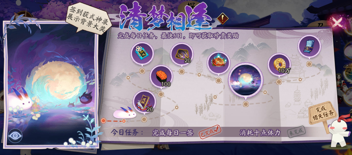 清辉映浮云,晚风拂静夜。皎月下的美梦交织,显现出别样光景—— 【清梦相逢活动即将开启】 -活动时间- 8月30日维护后-9月8日23:59 -活动内容- 活动期间,等级≥15级的阴阳师,可点击庭院右侧小纸人进入活动。 每日任务将在当日24点刷新,若前一天未完成任务,可使用勾玉购买错失的进度。 【活动奖励】 阴阳师们每天登录游戏,完成今日任务达到指定进度时,即可对应解锁获得体力、大蛇的逆鳞、皮肤券、神秘的符咒以及式神录展示背景·繁影流珠等奖励。 月华流转草叶飘摇,如镜湖面小妖成群跳跃。在暑期离开前,跃入这清凉神奇的梦境中遨游一番吧~ 【关于《阴阳师》手游】 网易自研旗舰级IP,唯美空灵写意,经典的半即时回合制RPG,卡牌收集、养成,基于LBS技术的社交PK,新番剧情跌宕起伏,上百种式神亟待觉醒......《阴阳师》等你展开神秘的奇幻之旅! |