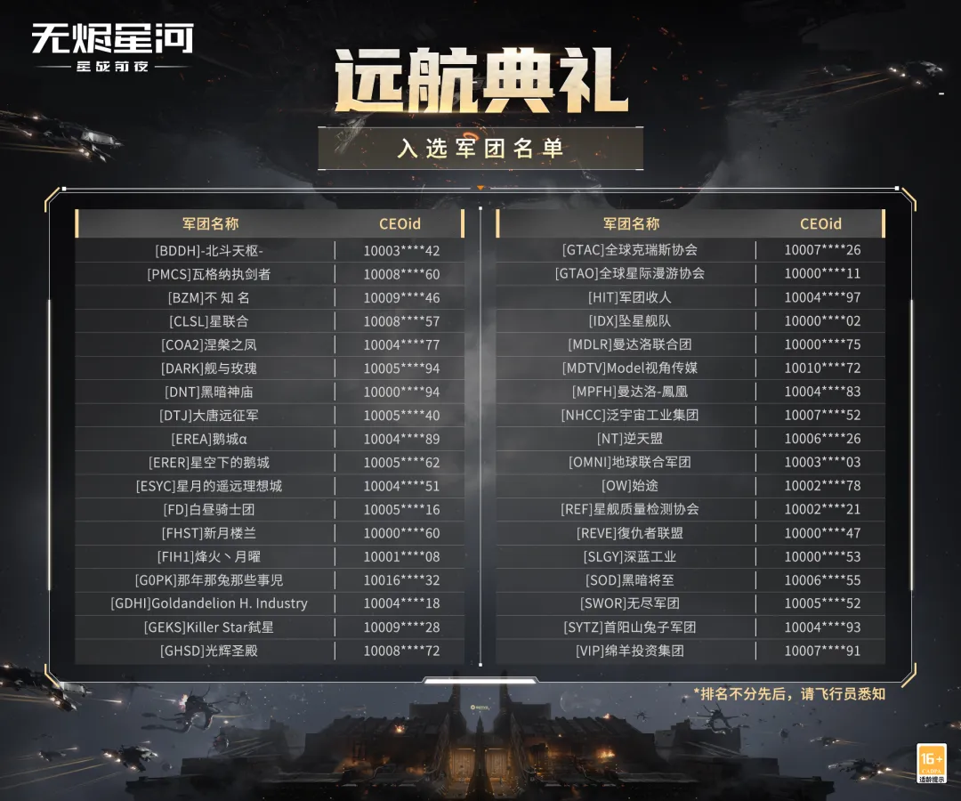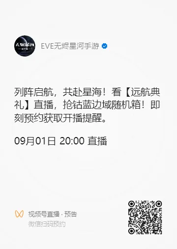 探寻伊甸,逐梦星海 EVE无烬星河【远航典礼】 9月1日20点隆重开启 多重好礼等待飞行员领取 快来直播间参与互动 把好礼带回家吧~ 直播间专属福利 EVE无烬星河手游【远航典礼】将于9月1日20点正式开启,官方视频号、哔哩哔哩、虎牙、斗鱼、抖音、QQ频道等多个社交平台同步直播,观看直播更有海量礼品相送! 9月1日20点直播开启后,飞行员可以前往【活动】页面,在【远航典礼-典礼直播】中选择对应平台的直播间进入,即可一键亲临远航典礼现场! 观看直播参与互动就有可能获得百元京东卡、游戏周边、钴蓝边域装备随机箱、8w技能点及远航典礼补给箱等诸多豪礼,直播间还会不定时放出固定礼包码,游戏内输入礼包码即可获得10W忠诚点奖励,数量有限先到先得。 纪念勋章荣耀加身,军团永久铭名 所有参加远航典礼的飞行员和军团,都将在活动结束后荣获一枚珍贵的“远航典礼”纪念勋章。 参与远航典礼的军团名称将被永久记录在远航典礼纪念碑上,它是新伊甸历史的见证,每一位来到新伊甸的飞行员,都能看到参与典礼的前辈们为开拓新伊甸做出的贡献。 庆典甄选礼包现已送达 为感谢诸位飞行员在过去一年中为新伊甸做出的贡献,统合部特别为所有飞行员精心准备了一份甄选礼包,内含技能重置载体、超立方星核等珍贵道具!现已发放至各位飞行员邮箱中。 预约直播不迷路 远航典礼即将开启,诸位飞行员可以扫描下方二维码,或是将直播地址提前收藏,避免错过精彩活动。 分享直播赢周边 飞行员们可以分享自己对远航典礼的期待,或是为自己喜欢的参礼军团加油助威,在远航典礼结束后,统合部将在所有评论中随机抽取20位幸运飞行员,送出中国航天联动纪念徽章礼盒一份。 9月1日,不容错过的远航典礼将拉开帷幕,让我们共赴星海,一同见证星际盛会的绚烂瞬间! |