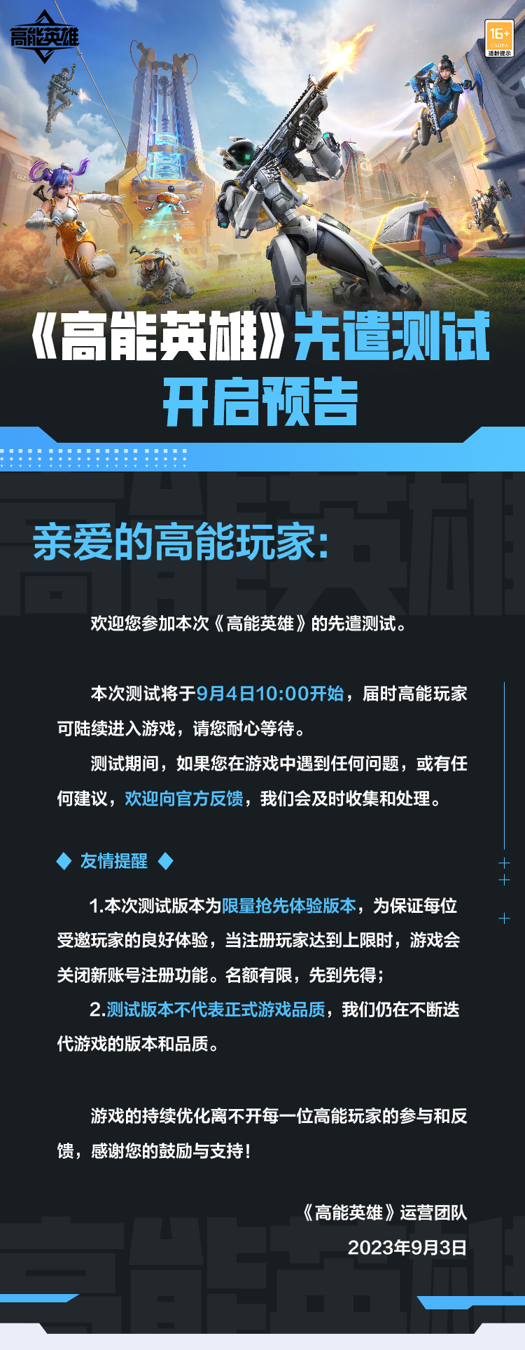 据悉,《高能英雄》先遣测试于9月4日10:00正式开启,快来一起看看吧!