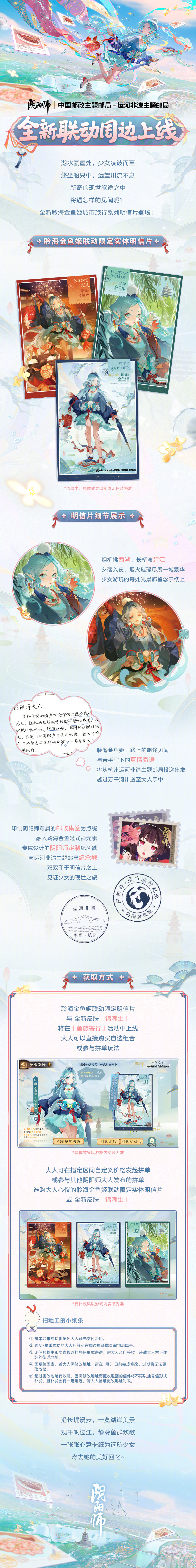 泛波聆语,碧水潮生,踏上现世旅途,远航至杭州的聆海金鱼姬,在这里记录下了哪些见闻呢? △《阴阳师》与中国邮政主题邮局-运河非遗主题邮局,携手推出全新联动周边——聆海金鱼姬城市旅行系列·联动限定明信片! 【全新联动限定实体明信片】 -限时上架- 12月14日维护后-12月20日23:59 ※聆海金鱼姬城市旅行系列·联动限定明信片,共有3 款可供挑选。记录了聆海金鱼姬游历杭州的见闻,也承载着聆海金鱼姬为阴阳师们写下的真挚寄语,更有阴阳师定制邮政集签与专属纪念戳——中国邮政主题邮局-运河非遗主题邮局纪念戳 作为特别印记~ ※阴阳师们可选择在「鱼旅寄行」活动中参与拼单玩法,在指定区间自定义价格发起拼单,或者直接参与好友或其他阴阳师发布的拼单。以更加便捷的方式获得更心仪的 聆海金鱼姬新皮肤 或「联动限定实体明信片」; ※阴阳师们还可选择在「鱼旅寄行」活动中直接购买自选组合,限时活动售价58元,包含「聆海金鱼姬新皮肤·锦潮生」及1张自选「联动限定实体明信片」。 ※活动期间,每位阴阳师最多可购买3件「聆海金鱼姬新皮肤·锦潮生」。活动结束一个月之后,未能及时参与的阴阳师也可通过寄售屋购买对应皮肤。(活动规则以游戏内为准)更多具体规则请查看长图。 【关于《阴阳师》手游】 网易自研旗舰级IP,唯美空灵写意,经典的半即时回合制RPG,卡牌收集、养成,基于LBS技术的社交PK,新番剧情跌宕起伏,上百种式神亟待觉醒......《阴阳师》等你展开神秘的奇幻之旅! |