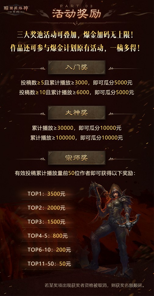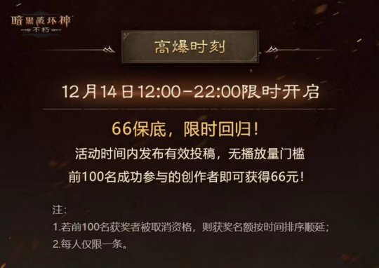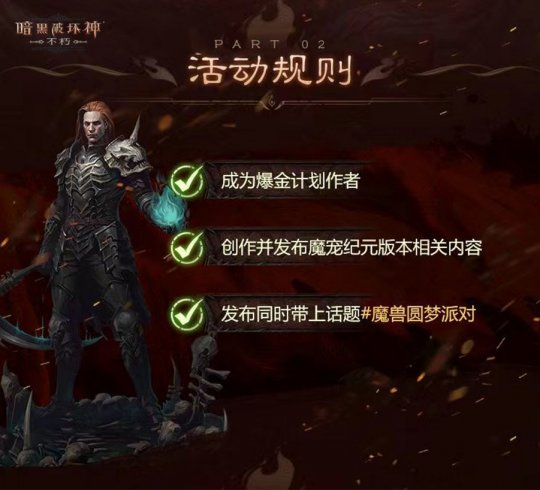 翘首以盼,纪元开启!今日起,《暗黑破坏神:不朽》将翻开崭新的篇章,庇护之地正式进入“魔宠纪元”! 神秘的魔宠从月之暗面降临庇护之地;在暗黑版图的一角,全新主线地图斯塔布雷克上演“破碎的正义”;全新PVE玩法“猩红旋涡”与“魂之试炼”正式开启,游戏体验更加欢乐;五大魔神来袭,庇护之地再度面临危机;超多限时活动登录,更多优化内容上线;版本同名新服【魔宠纪元】火爆开启,海量福利等你来拿!还有三大全新传奇宝石、全新绿装和传奇装备等待着玩家的获取,启发丰富了BD的深度......“魔宠纪元”的大门已经打开,史诗的冒险拉开帷幕,是时候踏上旅程,将传奇继续书写下去! 【使魔结契 开启魔宠纪元】 危险正在迫近,月之女巫妮萨来到威斯特玛,用魔法联结生存在月之暗面的魔法生物——使魔,这些神秘而强大的生物将为玩家们对抗庇护之地的邪恶力量提供巨大帮助。 目前,月之女巫妮萨带来了八只使魔,它们分别是苍白之焰、乌乌、风暴假面、沙角、潮汐幻影、影爪、石之御者和暮影猫灵。玩家达到30级时可以使用金币购买或打怪掉落的空白契约召唤出以上使魔中的随机一只。此外,妮萨还会不定期出售满级的使魔,由于满级使魔珍贵稀有,需要玩家们在游戏过程中多多留意!当然,所有玩家也可以在集市处自由购买或出售使魔,寻找那只最适合你的魔宠伙伴! 每只使魔都有属于自己的主动技能和被动技能,能够协助玩家进行更加多样化的战斗。同时,它们还有着许多独特的能力,不仅掉落的神秘传奇装备可以交给使魔进行辨识,打野获得的不需要的装备也可以交给使魔进行分解,还可以协助玩家拾取掉落的装备和道具,减少了玩家们繁琐的跑图流程,提高了刷取资源的效率,让玩家在庇护之地上的冒险变得更加便捷。 【魔宠悬赏令 抓魔宠分10万现金】 魔宠悬赏,豪礼开启!《暗黑破坏神:不朽》全新版本“魔宠纪元”全新开启,庇护之地也随之张贴出“魔宠悬赏令”。玩家只要参与活动,捕捉魔宠,就有机会获得现金奖励!12月14日,前往庇护之地,抓获神秘魔宠,收获“魔宠纪元”赏金猎人的第一桶金! 幸运悬赏开启,奖金相伴好运相随!12月14日至12月16日期间,庇护之地上将张贴出了一张属于欧皇的悬赏令,以100000元的总金额悬赏魔宠【苍白之焰】。活动期间,玩家可以前往庇护之地寻找【苍白之焰】的身影,成功获得【苍白之焰】(通过交易所获得除外)的玩家将成为幸运猎人。所有的幸运猎人将在12月22日当天一起瓜分100000元超高额悬赏金!十万奖池,不容错过!12月14日前往庇护之地,下一个幸运猎人或许就是你! 【邀请好友增加亲密 神秘魔宠0元获得】 随机魔宠零元购!12月14日至12月28日,玩家通过邀请伙伴助力,完成系列活动可以提升魔宠的亲密度,在亲密度达到100之后,即可在游戏内领取随机魔宠兑换券一张,可兑换随机魔宠一只!同时,提供助力的玩家也将获得包含金币*4888、噬月材料*50和噬月之尘*1的【结伴助力礼包】,让每一位参与者都能有所收获! 活动期间,每位用户仅可为一位玩家助力一次,每日最多为五位玩家进行助力。助力的亲密值提升依次为邀请第一人助力加50亲密度,邀请第二人助力增加30亲密度,邀请第三人助力增加20亲密度,最多三位用户就可完成助力。当玩家的亲密值达到100后,好友将无法继续进行助力。 【魔宠首秀即将上演 周末上演精彩对决】 魔宠首秀,即将上演!12月16日至12月17日每晚19:00《暗黑破坏神:不朽》主播表演赛【召唤!魔宠对决!】热血开打! 本次表演赛邀请了太阳能、YC、老炮、尼公子、沧澜和不科学6名抖音主播参与,每名主播将分别带领一支由粉丝和水友组成的队伍,与其他主播进行多场激烈的比赛。比赛采用工会战8v8乱斗玩法模式,官方会额外提供8只属性各异的预设魔宠,参与玩家自行选择一个使魔出战,赛制分为两个阶段,每个阶段采用三局两胜的形式决定胜负。魔宠的首战即将打响,6位主播全力以赴,胜利究竟花落谁家?12月16日-17日,锁定斗鱼、虎牙、抖音、视频号、B站、CC、快手7大直播平台,观看精彩对决,收获惊喜豪礼! 【爆金计划再度加码 魔兽圆梦惊喜无限】 魔宠纪元即将开启,魔兽圆梦火热爆金!魔宠纪元×爆金计划火热联动来袭,“魔兽圆梦派对”助你一夜暴富!玩家只要参与爆金计划,成为爆金计划作者,带上话题#魔兽圆梦派对#创作并发布魔宠纪元版本相关内容,就有机会瓜分万元奖励。 本次魔兽圆梦派对设置了“魔宠入门奖”、“魔宠大神奖”和“魔宠宗师奖”三大奖池。玩家投稿的作品数量达到5个且播放量达到3000,和玩家投稿的作品数量达到10个且播放量达到6000时均可获得“魔宠入门奖”,分别获得一次瓜分5000元奖金的机会;在播放量达到30000和100000时可获得“魔宠大神奖”,也可分别获得一次瓜分10000元奖金的机会。活动更有为作品播放量最高的前50名创作者准备的“魔宠宗师奖”,拿下此奖的玩家最高可斩获3500元现金奖励!3大奖池可同时参加,奖金叠加结算,助力每一个暴富的梦想! 不仅如此,12月14日12:00至22:00,高爆时刻也将同时开启!活动时间内,前100名成功参与魔宠纪元×爆金计划联动有效投稿的创作者,都能无门槛获得66元保底奖励!每人仅限一条作品可获得该奖励,且对作品无任何播放量要求。同时,本次联动不设限制,玩家投稿的作品还可参与爆金计划原有活动,一稿多投爆金重重,最大