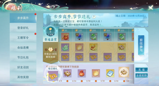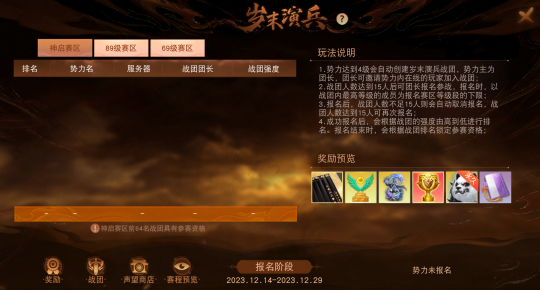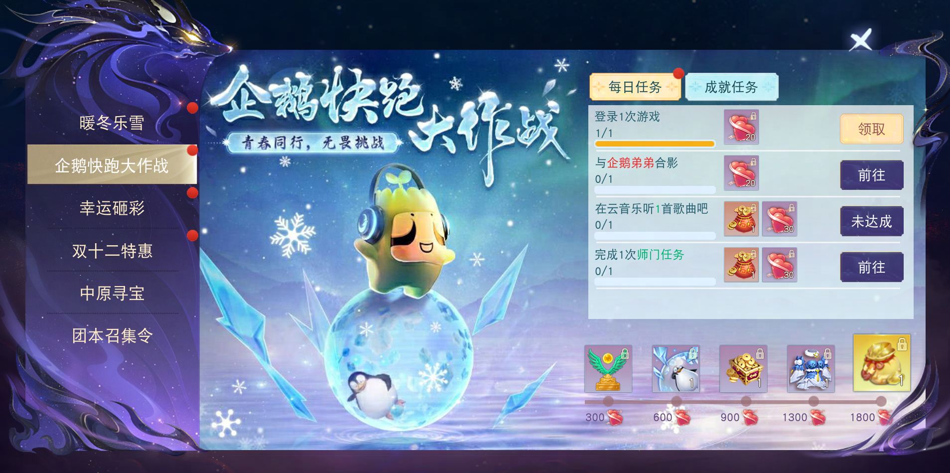 年末将至,新岁临近,大荒也变得热闹起来了。新一届的岁末演兵、名人堂同步来袭,龙舞贺嘉年携百万军资豪礼而至,帮助调皮小企鹅还可领取精美时装、坐骑!面对如此丰厚的奖励,各种少侠你们准备好了吗?快一起看看本周大荒发生的新变化吧~ 名人堂 名人堂玩法报名现已正式开启,即日起至12月20日23:59,所有少侠均可报名参与,成功报名可获得二级宝石袋和金币奖励! 活动分为名人榜和门派榜,两个榜单均按照等级划分为四个等级段。报名截止后天下一统、新生大荒和天下贰大区少侠分别按照总修为进行排名,各大区上榜少侠将有机会获得名人堂翅膀、限定头衔及称谓、玉玑子雕像手办等丰厚奖励!神启等级段名人榜前3名少侠更会在巴蜀南紫荆谷中设立雕像,受全服少侠贤拜! 名扬大荒的机会就在眼前,少侠们快快行动起来吧! 岁末演兵 年度PVP盛事岁末演兵燃情开启!12月14日-12月29日,当势力达到4级时,势力主便可创建团队带领15至20人的团队报名。届时将根据战团强度排名锁定参赛资格。 比赛将会在2023年12月30日至2024年1月15日有序进行,投票竞猜活动也将同步开启,少侠使用投票券参与即有机会获得星币奖励,更有超级大奖随机投送!使用星币可在声望商店中兑换刮刮乐、金品魂晶等道具~ 所有比赛结束后,优胜队伍将获得相应奖励,限定动态称谓、势力奖杯雕像、岁末演兵坐骑、玉玑子雕像手办等珍稀奖励等你拿! 龙舞嘉年 龙年将至,神龙携百万军资与少侠共赏嘉年!活动期间每日8:00-19:50,少侠可前往活动界面免费挑选或使用元宝额外挑选数字。20:00揭晓当日中奖数字后,将根据匹配数字个数发放军资、童童筑梦坐骑等奖励,符合条件的少侠还可修改数字解锁更多好礼,未中奖的少侠也将获得时光瓶奖励! 少侠们快快参与起来吧,说不定幸运儿中就有你! 企鹅快跑大作战 粗心的企鹅弟弟弄丢了自己的行囊,少侠们快伸出援助之手吧! 活动期间前往活动界面完成每日任务和成就任务可获得宝石晶石、海量金币和鹅心心,达到对应里程碑进度还可解锁永久称谓、免费时装坐骑、四级宝石袋等丰厚好礼! 圣兽福临 圣兽福临,圣兽指引之下,来试试你是否有这份缘带走这些宝物吧!12月14日-12月20日,参与圣兽福临活动,有机会获得五级自选宝石、元魂通天宝箱、红莲溟钻等珍贵奖励。 同时圣兽福临声望商店将限时开启,可使用圣灵玉碟兑换百万军资、玉髓元精等各种珍贵奖励。 步步高升 12月14日-12月20日活动期间,每日登录即可领取暖心小礼,充值达到相应额度可获得圣灵币、军资礼盒、加护溟钻、四级宝石重铸符等珍稀奖励。解锁特典嘉赏还可额外领取大量金币、金玉富贵、四级宝石袋、三才石宝匣、红莲碎溟等豪华奖励。 冬季严寒,但大荒的活动却热火朝天,快快呼朋唤友一起来大荒取暖,把丰厚好礼带回家吧! 结契神龙,灵歌九霄,《天下》手游2023年终资料片【蜃海龙吟】重磅上线!第九门派【龙巫宫】翩然入世;大型演出式团本【九嶷之渊】来袭,在战斗中沉浸式体验龙巫再世的精彩剧情;2亿玩家同归季开启,新服百万元宝福利升级,携20亿萌新养成基金回馈每一位陪伴大荒的你! |