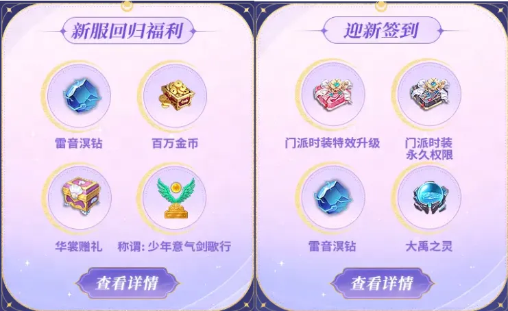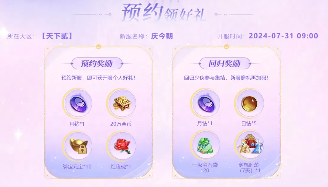 八载天下,今朝共庆!《天下》手游周年庆资料片【庆今朝】将于7月31日重磅开启,全新势力玩法打响大荒领土争夺战,高自由度全新团本颠覆往日体验,更有《天下》首套变身系外观实现一秒变身,尽显大荒美学! 【八周年庆资料片】专题页现已上线,在游戏内弹窗页面点击跳转或点击链接https://tx.163.com/2024/qjz/#/index前往专题页,即可了解更多关于资料片的内容玩法和精彩福利! 同时,资料片同名新服【庆今朝】携海量福利已开启预约,点击链接https://tx.163.com/xinfu/前往预约页面,无论是萌新还是老友,预约新服就能带走超多惊喜好礼,本次新服更有买一送一专属特权来袭! 在此,我们诚邀大家前来体验不一样的大荒,再忆开拓时探索和冒险的激情!接下来,就让我们一起看看新服里的各种精彩福利详情吧~ 新服专属特权“买一送一” 八周年狂欢新服即将盛大开启,新服专属特权让你体验买一送一的快乐!活动期间,少侠可在新服【庆今朝】享受元宝双倍返还的回馈福利!在额度范围内,你充值任意档位元宝都将获得?双倍元宝!(同一账号的新区角色将共享返还额度)快准备好开启你的大荒发财之路吧~ 海量新服活动,惊喜多多 【加入新服,免费领好礼】 萌新老友齐聚新服,众多福利享不停!新服角色每天登录即可免费领取珍稀道具、门派焕新时装等惊喜好礼;回归少侠达到指定等级条件后更有专属称号、多款绝美时装任选,以及雷音溟钻等回归大礼! 【开拓大荒,冲榜赢大奖】 为了助力少侠们在新服的成长,我们不仅准备了超值萌新礼包,新服开服三周内还将定期根据少侠在装评/修为/等级中的排名情况,发放丰厚的冲榜奖励。勇攀大荒巅峰,舍我其谁! 【成长之路】 萌新少侠初入大荒没有经验?不用担心!跟着成长之路走,助你轻松成长,快速提升~ 通过完成特定任务累计积分,在熟悉大荒各种玩法的同时,还可将坐骑自选礼包、绝美时装、元魂珠自选礼包及异兽豚豚等各种丰厚奖励收入囊中! 随着角色等级上升还将解锁相应的等级奖励,获得更多成长资源,秒变实力大神!角色达到指定养成条件后更有月威溟钻、技能书残页、异兽自选宝箱等珍稀道具奖励送上,助力少侠畅游大荒! 【亲友团秘宝】 在赛季奖励中还包含特殊的惊喜宝箱,领取时会获得随机品质的宝箱,有机会开出大量红莲碎溟、极品宝石、紫霄琥珀等珍稀道具奖励! 与此同时,其他PVP玩法也将迎来奖励提升,奖励加码,热血加倍!其中,势力战玩法同步新增惊喜宝箱奖励,在为势力争夺荣誉的同时,便已将海量奖励统统收入囊中~ 在大荒的每一段旅程都少不了亲友的陪伴,探索新服又怎么少得了志同道合的伙伴? 少侠在新服组建亲友团,在秘宝有效时间内达到指定条件即可领取对应奖励,内含月威溟钻、圣灵软玉等丰厚好礼!快叫上好友组队,准备开启新旅程吧~ 新服集结,预约领好礼 八年天下,载梦扬帆!八周年狂欢新服【庆今朝】预约现已火热开启! 点击前往预约页https://tx.163.com/xinfu/进行预约,即可获得月钻、绑元等个人预约好礼。回归少侠参与预约集结更可享受新服赠礼加码,额外获得一级宝石袋、精美时装等奖励! 邀请好友进行组队还能解锁四级宝石袋、技能书残页、仙灵宝玉等福利。奖励内容根据成团人数的增加逐步解锁,达到“人多势众”阶段更有雷音溟钻、特殊称谓等好礼相赠!心动不如行动,快和好友组队加入新服共闯大荒~ 福利盛宴,精彩加倍!看了这么多关于新服的福利爆料,不知大家有没有心动呢?快叫上好友预约成团,领取成团福利,共同开启新的冒险之旅吧! 《天下》手游8周年资料片「庆今朝」即将狂欢来袭!势力竞技新玩法点燃大荒战火,全新解谜机制十人团本等你体验!最强福利季开启,18套经典外观中选你最爱、登录领免费战兽、幽州东盛夏烟火大会等海量福利邀你共庆天下芳辰! |