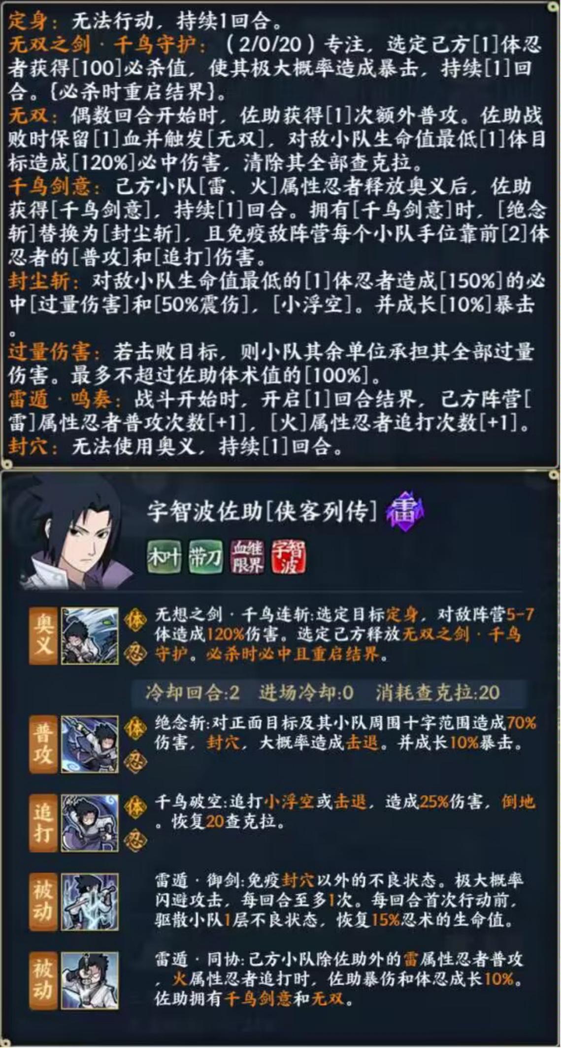 宇智波佐助是木叶隐村中宇智波一族的天才忍者之一,同时也是六道仙人长子因陀罗的查克拉转世者。第四次忍界大战中,佐助与秽土转生后的鼬相遇并协力打败药师兜。 本次在《火影忍者:忍者新世代》中登场的佐助,整体采用的是国潮风格,黑色内衬显得灵活干练,有着游侠的飘逸风格,辅以灰色道袍外套,古风盎然。黑色龙鳞护臂以及麒麟腰带呼应佐助雷遁麒麟的元素,而红色的弯月玉扣则颇具宇智波风格。 自古以来,儒以文乱法,而侠以武犯禁,恰恰与佐助的经历有异曲同工之处,月影、竹林、剑客。孤独的少年所踏上的复仇之路,不正是传统武侠的精髓吗?所谓人在江湖身不由己,鼬如此,佐助亦然! 在《火影忍者:忍者新世代》中,宇智波佐助[侠客列传],拥有攻守两种方式的奥义,能强化雷火双属性的忍者,可谓攻守兼备,输出不俗!就让我们一起看看他在游戏中的精彩表现吧! 一、忍者简析: 奥义:无想之剑·千鸟连斩:选定目标定身,对敌阵营5-7体造成120%伤害。选定己方释放无双之剑·千鸟守护。必杀时必中且重启结界。 Tip:攻守兼备的奥义,能根据实际对局情况灵活使用,为己方使用时候可以极大造成暴击,对特定忍者使用会有奇效。 普攻:绝念斩:对正面目标及其小队周围十字范围造成70%伤害,封穴,大概率造成击退。并成长10%暴击。Tip:输出伤害不俗,且有概率能造成多体封穴,还能养成暴击,非常强势的普攻。 追打:千鸟破空:追打小浮空或击退,造成25%伤害,倒地。恢复20查克拉。 Tip:非常实用的追打效果,恢复查克拉的效果,能缓解整个小队对于查克拉的需求。 被动Ⅰ:雷遁·御剑:免疫封穴以外的不良状态。极大概率闪避攻击,每回合至多1次。每回合首次行动前,驱散小队1层不良状态,恢复15%忍术的生命值。 Tip:闪避提高了自身的生存能力,还能辅助小队驱散不良状态以及恢复生命值,为小队忍者提供了续航。 被动Ⅱ:雷遁·同协:己方小队除佐助外的雷属性忍者普攻,火属性忍者追打时,佐助暴伤和体忍成长10%。佐助拥有千鸟剑意和无双。 Tip:佐助的核心技能,搭配其他雷火属性忍者,能快速养成自身,满足技能机制后,能免疫手位靠前2体忍者的普攻和追打伤害,很大程度上保证了佐助自身的生存,以及临死反击的效果也相当不错。 特殊词条: 定身:无法行动,持续1回合。 无双之剑·千鸟守护:(2/0/20)专注,选定己方[1]体忍者获得[100]必杀值,使其极大概率造成暴击,持续[1]回合。{必杀时重启结界}。 无双:偶数回合开始时,佐助获得[1]次额外普攻。佐助战败时保留[1]血并触发[无双],对敌小队生命值最低[1]体目标造成[120%]必中伤害,清除其全部查克拉。 千鸟剑意:己方小队[雷、火]属性忍者释放奥义后,佐助获得[千鸟剑意],持续[1]回合。拥有[千鸟剑意]时,[绝念斩]替换为[封尘斩],且免疫敌阵营每个小队手位靠前[2]体忍者的[普攻]和[追打]伤害。 封尘斩:对敌小队生命值最低的[1]体忍者造成[150%]的必中[过量伤害]和[50%震伤],[小浮空]。并成长[10%]暴击。 过量伤害:若击败目标,则小队其余单位承担其全部过量伤害。最多不超过佐助体术值的[100%]。 雷遁·鸣奏:战斗开始时,开启[1]回合结界,己方阵营[雷]属性忍者普攻次数[+1],[火]属性忍者追打次数[+1]。封穴:无法使用奥义,持续[1]回合。 忍者定位:养成输出、雷火辅助 推荐饰品:猿王、玄龟、鸣雷、战鬼套装 二、搭配思路: 1、结合宇智波佐助[侠客列传]的技能特点,一图流搭配推荐: 2、与宇智波佐助[侠客列传]搭配阵容忍者的优点: (1)宇智波止水[须佐能乎]具有养成速度快的特点,被动能靠追打达成回合外输出的手段,无论输出或是辅助都有不俗的效果; (2)宇智波鼬[绛月之侍]拥有结界,拥有使己方小队成长的能力,还能限制敌方必杀值,可造成特效“转写灵印”,一回合最多可释放两次奥义; (3)千手柱间[和服]可增加对方奥义查克拉消耗,奥义有专注效果,阵亡后可提供“火之意志”,增强小队普攻能力及吸血; (4)日向宁次[忍界大战]能限制敌方查克拉,可增加对方奥义冷却,自身拥有多种方式能造成封穴,每回合一次守护队友; (5)纲手[夏装]拥有治疗小队的能力,同时提供体忍防抗成长,具有辅助普攻和普攻伤害效果; (6)达鲁伊能为小队提供水攻、雷攻加成,并为水、雷忍者增加额外普攻; (7)红莲之瞳具备解除异常状态,提供查克拉和吸血效果,并提升追打伤害和忍术; (8)黑夜之刃能恢复查克拉、增强雷属性忍者,或为小队忍者提供体术和体术吸血,并为带刀忍者提供额外抗性和免疫不良状态增益。 三、阵容推荐与实战解析 阵容一(斗祭/竞技场): 阵容优点: 1、查克拉充足; 2、拥有结界,可造成不良状态; 3、普攻及体忍成长较好,暴击伤害较高; 4、前2回合的抗性较强。 阵容缺点: 1、需要初代战败后才能增强小队普攻次数和伤害; 2、雷主普攻回复查克拉,可能会影响奥义时机; 3、缺乏解控手段,若忍者被控制会比较被动。 (一)实战分析1(竞技场) 敌方阵容: 宇智波止水[须佐能乎]+宇智波佐助[侠客列传]+千手柱间[和服]+雷主 实战解析: 第一回合: 1、对方初代使用奥义,我方雷主奥义查克拉消耗增加; 2、我方佐助普攻后对我方止水使用奥义,我方止水暴击增加; 3、我方止水对我方初代使用防守奥义,我方初代解除不良状态; 4、对方佐助使用防守奥义,暴击增加; 5、对方止水使用防守奥义,对方佐助奥义冷却减少; 6、我方初代使用奥义,对方止水奥义查
