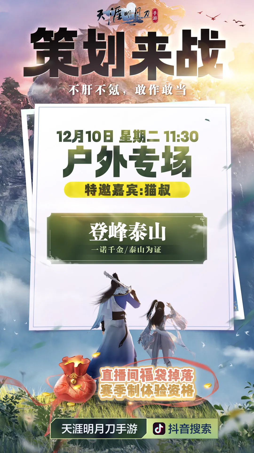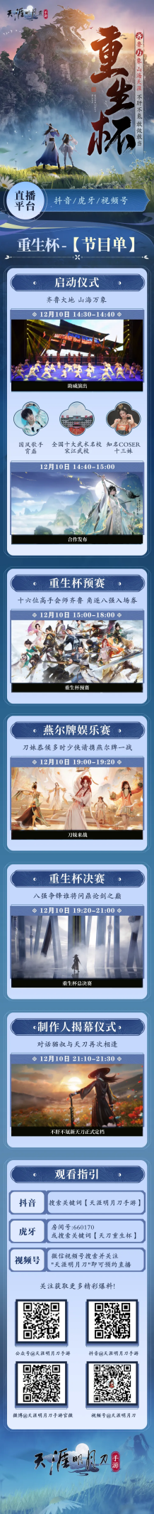 各位天刀少侠们,小编我前来报告!“天刀重生”计划进度加载一路狂飙,邀少侠相约刀刀直播间获取最新进展! 「策划来战」直播·特别场 12月10日上午11:30起将首先迎来本周的「策划来战」直播·特别场,这次我们将直播间“搬到了”泰山之巅,制作人猫叔和刀妹本妹将通过直播带大家一起勇攀泰山,拿取「重生杯」线下总决赛奖杯! 「重生杯」国风电竞邀请赛 「重生杯」国风电竞邀请赛的直播则将在12月10日下午14:30正式开启,选手们会经过下午的紧张赛程角逐八强入场券;刀妹也将向选手们发起挑战,来一场轻松欢乐的燕尔牌娱乐赛,欢迎大家来公屏为刀妹应援~ 「重生杯」总决赛 「重生杯」总决赛将于12月10日晚上19:20开启巅峰对抗,谁能最终拔得头筹、登临泰山之巅?赛后的制作人揭幕更有刀刀重生之终极计划发布,欢迎少侠来抖音、微信视频号官方账号或虎牙搜索“天刀重生杯”一探究竟! 以上就是本期的全部内容啦~轻松有趣的全新天刀也正在火热预约中,愿与少侠在全新的世界里,再次相逢!更多精彩爆料内容,敬请关注小编@天涯明月刀手游! |