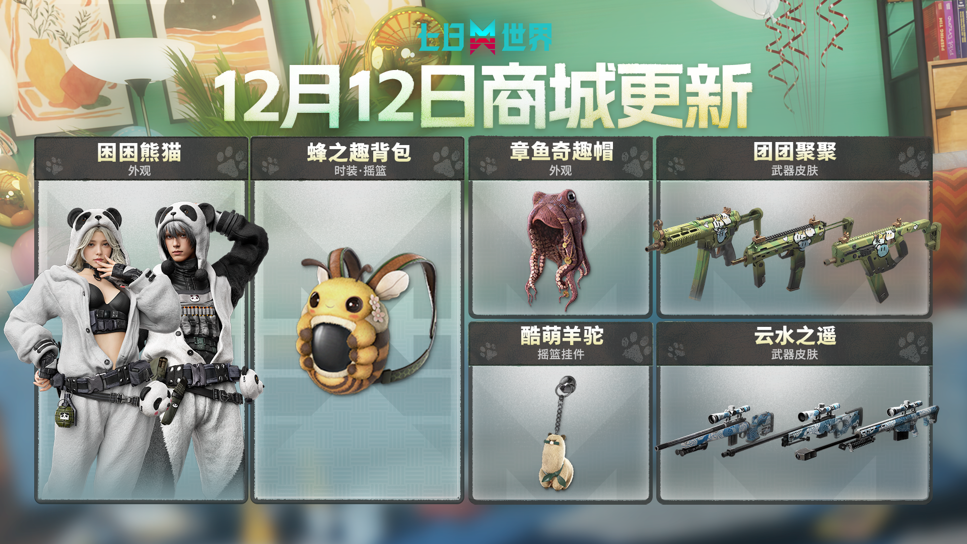 在奈科特大陆这片广袤天地里,每一天都充满了未知与挑战。在末日生存,超越者们除了需要具备面临威胁的勇气,更要懂得偶尔享受悠闲的时光呀~ 全新外观即将于12月12日上新,悠闲、可爱与国风元素的交融,会带给大家怎样的全新感受呢!准备好踏入这个充满萌趣与华韵魅力的新世界了吗?一起来看看吧! 卓越品质时装外观-困困熊猫 末日也要好好睡觉!经典的大熊猫黑白配色,如同一幅可爱的水墨画鲜活呈现,萌萌的熊猫脑袋帽子与俏皮的厚拖鞋相映成趣,穿上它仿佛化身慵懒又迷人的国宝,在末日世界中踏出可爱的韵律。 卓越品质摇篮外观-蜂之趣背包 恰似一只憨态可掬的小蜜蜂跃然于摇篮背包之上,灵动大眼睛闪烁萌光,可爱值瞬间爆棚,于末日废土间开辟出一条可爱至上的潮流新径。 卓越品质散件外观-章鱼奇趣帽 神秘深邃的紫色章鱼造型,灵动的触手自然垂下,将海洋奇趣与时尚帽饰精妙融合,仿佛是从奇幻深海游弋而来的潮流精灵! 卓越品质背包挂件-酷萌羊驼挂件 酷萌羊驼挂件来袭,棕色小羊驼萌态尽显,虽表情故作凶凶却更显俏皮可爱,挂于摇篮之上,为末日之旅增添了一位独特的时尚萌友~ 精良品质武器皮肤-团团聚聚 (团团聚聚-M416、团团聚聚-MP7、团团聚聚-短剑) 清新丛林绿铺满武器主体,瞬间将你带入神秘的绿色秘境,憨态可掬的卡通团子与俏皮白色小心心相互映衬,恰似欢乐精灵,为末日之战增添无尽可爱与温馨~【团团聚聚】组合礼盒同步上新,更多优惠等你体验! 精良品质武器皮肤-云水之遥 (云水之遥-M700、云水之遥-AWM、云水之遥-M82A1) 蓝白相间如传世青花瓷般典雅,云朵飘逸、海水翻涌的花纹镌刻其上,仿若将诗意的中国风画卷在武器上徐徐展开,每一处笔触都流淌着千年文化的韵味与灵秀。【云水之遥】组合礼盒同步上新,快快享受超值优惠吧! 本期的内容到这里就介绍完毕啦,更多精彩内容请持续关注我们的官方公告。 |