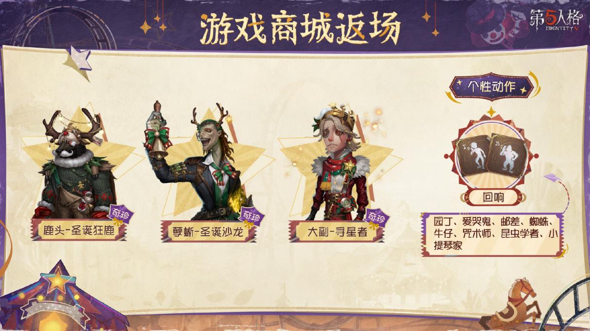 雪花飘飘,颂歌回荡!网易首款1V4非对称竞技手游《第五人格》圣诞主题活动今日盛大开启!圣诞活动氛围十足,专属节日时装经典来袭,浓浓的圣诞节日氛围,让我们一起体验这场狂欢,还有更多精美好礼等你来领取! 围炉欢声笑,共祝圣诞节 圣诞前夕,邦邦为了给疯眼准备圣诞礼物“绑架”了魔术师瑟维,并将自己身体的零件作为“演出入场券”送给了小镇居民。虽然疯眼十分怀疑这个来路不明的魔术师,但为了满足邦邦的心愿,以及回收那些昂贵的机械零件,疯眼不得不答应将家中装饰一新,并开启一场为时7天的魔术表演…… 演出已经准备完毕,访客们可以通过参与活动获得【独特时装】魔术师-圣诞魔法/【独特时装】26号守卫-圣诞雪怪(二选一)等奖励!还有往年圣诞主题活动时装、随从、个性动作也将同步返场。圣诞主题公共地图——“月亮河嘉年华”也将限时登场!我们将在雪花纷飞的气氛中再次来到月亮河公园。在此次版本中,我们为其全新增加了滑冰玩法,欢迎大家前往体验! 除了今年全新的活动奖励,往期活动限定时装【独特时装】园丁-圣诞装、【独特时装】厂长-圣诞老人、【独特时装】调酒师-圣诞装、【独特时装】牛仔-圣诞装、【独特时装】摄影师-圣诞装、【独特时装】昆虫学者-圣诞装、【独特时装】空军-圣诞装、【独特时装】雕刻家-圣诞装和【独特随从】淘气的布鲁斯已返场上架活动商店;此外,【奇珍时装】鹿头-圣诞狂鹿、【奇珍时装】孽蜥-圣诞沙龙、【奇珍时装】大副-寻星者和【个性动作】回响(园丁、昆虫学者、咒术师、牛仔、邮差、蜘蛛、爱哭鬼、小提琴家)也会在游戏商城返场,感兴趣的访客们抓紧机会选购! 魔术表演送祝福 奇珍时装闪亮登场 演出将至,这次的圣诞夜又会发生什么故事呢?【奇珍时装】疯眼-圣夜巫师头戴一顶巫师帽,帽子上有着金色的羽毛和齿轮造型的装饰物,身穿一件深绿色的长袍,长袍上有着金色的装饰和纹理,显得非常华丽。他手握魔杖,魔杖的上端似有能量在流动,上面的蘑菇和腰间挎包里的蘑菇遥相呼应,为整体的深绿色调增加了一抹明艳色彩。他的身上和魔杖上都有着点点雪花,冒雪而来,想必是有什么重要的事情需要他去完成。 暖意浓浓,共享欢乐!网易首款1V4非对称竞技手游《第五人格》圣诞主题活动于12月19日维护后开启,多种奖励和时装已在庄园等候你的到来,让我们欢聚庄园感受圣诞狂欢为访客们带来的温馨与幸福! 【关于第五人格】 《第五人格》是网易首款非对称性对抗竞技手游。荒诞哥特画风,悬疑烧脑剧情,刺激的1V4的对抗玩法,都将给访客带来全新的游戏体验。访客将扮演记者爱丽丝·德罗斯,在收到一封神秘的邀请函后,进入欧利蒂丝庄园调查背后的秘密。在进行证据调查过程中,访客扮演的爱丽丝·德罗斯将采用演绎法,对真相进行回顾和推演。在案情回顾时,访客可以选择扮演监管者或求生者,展开激烈的对抗。而在调查的过程,无限接近事实时,却发现越来越不可思议的真相。 |