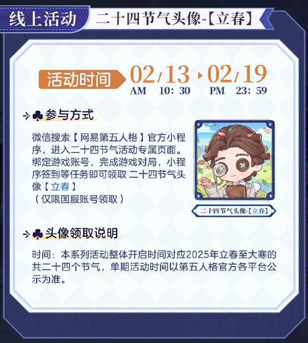 四时之始,万物随生。网易首款1V4非对称竞技手游《第五人格》庄园二十四节气演绎录第一幕·立春线下活动完美落幕!温州,一座经济活跃的现代化城市,充满人文气息和自然风光的魅力之城,让我们现在就来回顾一下,在这个著名的“百工之乡”举办的线下活动吧! 残冰坼玉片,新萼排红颗 立春是二十四节气中的第一个节气,标志着春天的开始。立春时节,虽然寒意尚未完全消退,但大地已悄然苏醒,阳气渐升,万物开始萌发。此时冰雪消融,草木初萌,春风拂面,带来生机与希望。立春不仅是农事活动的重要节点,也是人们迎接新岁、祈福纳祥的时节,立春的到来,象征着寒冬的结束和春天的降临,带给人们无限的喜悦与憧憬。 《第五人格》在2月8日和9日在浙江省温州市龙湾区温州吾悦广场1号门外广场举办了庄园二十四节气演绎录第一幕·立春线下活动。官方精心准备的人气COSER、趣味活动与精美周边令现场充满了访客们的欢声笑语。 庄园角色现身,活动趣味十足 不似天涯,卷起杨花似雪花。在线下活动现场,园丁、小说家、摄影师等3位庄园人气角色来到现场,COSER们通过精心打扮和逼真的装扮,成功地再现了角色形象,在温馨的互动环节中,他们赢得了访客们的高度评价,使得大家争相在现场捕捉这难忘的瞬间。 活动现场还为各位访客准备了趣味十足的互动游戏,融合了《第五人格》独有的庄园特色与立春节气文化,分别是庄园诗会、最佳推理、密码破译和人格推演。相信访客们打卡这四个互动游戏后定能对中国节气文化有更加深入的了解。玩乐的同时还能赢取印章,兑换二十四节气头像-【立春】兑换卡、【立春】线下限量徽章以及线下活动限定明信片等第五人格精美周边! 春日春盘节物新,节气线上活动精彩继续 随着立春线下活动的完美落幕,立春线上活动也即将于2月13日10:30开启。玩家们可通过“网易第五人格”微信小程序进入专题页面,完成各项活动任务即可领取二十四节气头像-立春。头像中,入殓师身后是春意融融的村庄,河水已然解冻,天青草绿的风景非常怡人,他的身上飘落的花瓣和绿叶也在诉说着春色的迷人。 春烟袅袅,人间安暖,阳和起蛰,品物皆春。网易首款1V4非对称竞技手游《第五人格》庄园二十四节气演绎录第一幕·立春线下活动圆满落幕,冬去春来的第一场约定,之后还有着一场又一场新的约定,期待与访客们再次相聚! 【关于第五人格】 《第五人格》是网易首款非对称性对抗竞技手游。荒诞哥特画风,悬疑烧脑剧情,刺激的1V4的对抗玩法,都将给玩家带来全新的游戏体验。玩家将扮演记者爱丽丝·德罗斯,在收到一封神秘的邀请函后,进入欧利蒂丝庄园调查背后的秘密。在进行证据调查过程中,玩家扮演的爱丽丝·德罗斯将采用演绎法,对真相进行回顾和推演。在案情回顾时,玩家可以选择扮演监管者或求生者,展开激烈的对抗。而在调查的过程,无限接近事实时,却发现越来越不可思议的真相。 |
