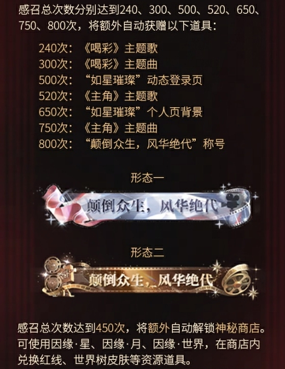 6月25日,网易无限流言情手游《世界之外》更新,推出娱乐圈主题版本?如星璀璨?。 踏上荣耀之路,人生由此逆袭! 是一夜成名,还是漫天非议? 接通告、出作品、成顶流,聚光灯下,万众屏息—— 待你谈遍资本、影帝、巨星、顶流后,功成名就,璀璨登顶! 本次版本上线,海量内容纷至沓来:重磅福利、绝美侧影、全新剧情、趣味玩法…… 下载《世界之外》,待你颠倒众生,风华绝代! 重磅福利:消费满1元可得50抽,最高可得60抽 6月25日更新后-7月16日00:00,活动期间共计可得60抽。 登录游戏【签到3天】,即免费送「如星璀璨」空间碎片*20。 充值或购买礼包满1元,再加量「如星璀璨」空间碎片*30。 充值或购买礼包满100元,继续加量「如星璀璨」空间碎片*10。 此外,往期天妍宝市、520赠礼、初夏之礼等活动,还可额外累积15抽,最高可得75抽! 绝美侧影:?如星璀璨?世界侧影,限时上线! 6月25日更新后-7月16日03:59,「如星璀璨世界之间」限时开放。 四款限定侧影:顾时夜 · 长街暮色、易遇 · 无声定格、柏源 · 红毯荣耀、夏萧因 · 金色华彩,全新上线! 顾时夜「如星璀璨」侧影丨长街暮色 “她的后台……是我。” 易遇「如星璀璨」侧影丨无声定格 “果然,这样阴阳两隔的命运,不止我一个人接受不了。” 柏源「如星璀璨」侧影丨红毯荣耀 “选择和你留到最后的原因,其实可能还因为……我有点舍不得杀你。” 夏萧因「如星璀璨」侧影丨金色华彩 “所有人都能听到我的曲子,但不是所有人都能欣赏。” 感召福利:加码加码再加码,畅享明星顶奢体验! 感召达到特定次数后,可额外解锁以下内容 7月2日更新后,集齐「如星璀璨」限定世界侧影,额外兑换内容再升级! 集齐4张「如星璀璨」限定侧影,即可兑换服装【璀璨华光 · 珍藏】 集齐4张「如星璀璨」限定侧影并每张贴近2次,即可兑换珠宝【深海之泪 · 传世】 集齐4张「如星璀璨」限定侧影并每张贴近5次,即可兑换房产【鎏金云筑】 版本特色:传奇之路,每一步都由你选择 星途启程,从素人到顶流,请解锁你的传奇之路: √演艺事业经营:拍电影、上综艺,多栖发展,停不下来 √开挂逆袭:天降金手指,打破黑幕,颠覆非议 √天命桃花:资本巨鳄、天王影帝、国际巨星、顶流歌星……全攻略! (*图片出处:由网友@绑定系统后我在娱乐圈封神了 制作,侵删) 动人音乐:「如星璀璨」音乐专辑上线,包含《主角》《喝彩》两首歌曲 世界之外「如星璀璨」主题歌《主角》,独家上线网易云音乐。 欢迎进入网易云歌手主页「世界之外」,点击专辑「如星璀璨」进行收听。 「如星璀璨」主题歌《喝彩》同步上线全平台,欢迎玩家前往「世界之外」歌手主页进行收听。 《世界之外》是网易推出的一款无限流言情手游。娱乐圈版本「如星璀璨」已上线,成为文娱界的一代传奇,等你颠倒众生,风华绝代。 下载方式:iOS/TapTap/各大平台搜索【世界之外】。 |