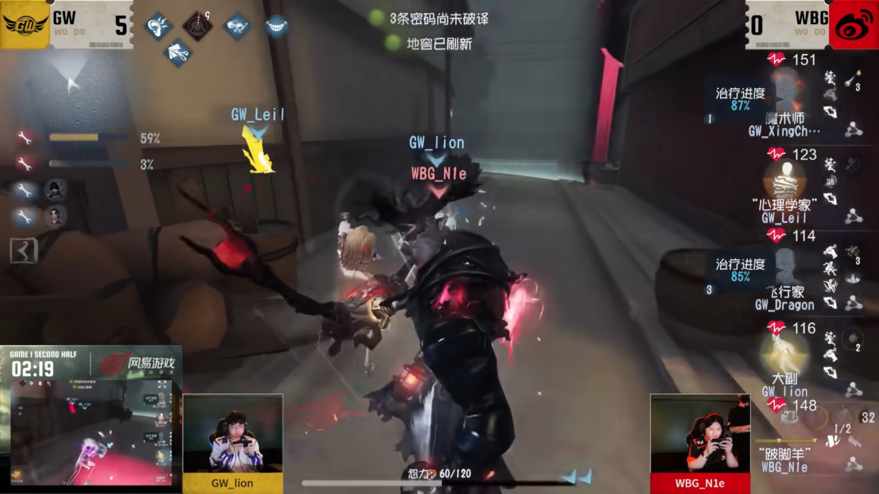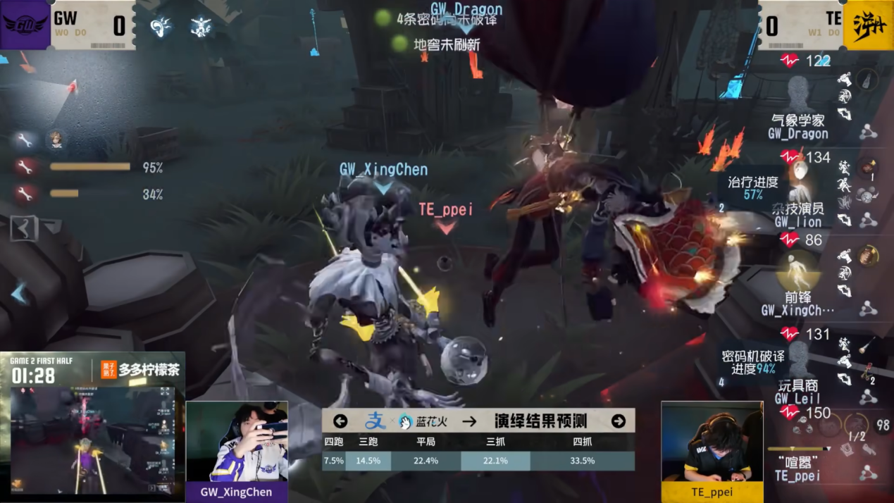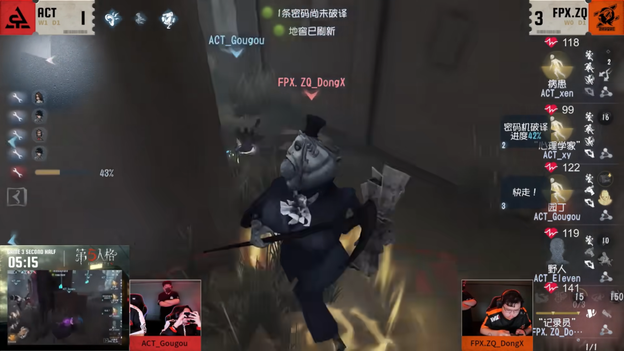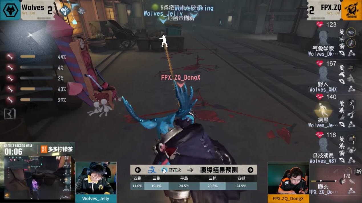 【当前战况】 2025IVL夏季赛第五周的比赛已经结束,当前积分排名如图: Gr战队依旧保持着恐怖的统治力,Gr_Jin前两局的高熟练度“四大天王”和稳健的Gr求生者相互兜底,常以2:0的姿态赢下比赛,即使对局来到第三场,Gr_Jin仍有绝活26号守卫保平争胜;MRC战队的MRC_BaiLu的角色池在前两局也有着极高的优势,但从前半程的赛况来看,MRC战队监管者方在第三局会出现心有余而力不足的情况,虽然目前有着稳定的出线资格,但该短板可能成为他们前进路上的阿喀琉斯之踵应及时作出针对性训练;成都Wolves战队求生者方应避免木桶效应的出现,希望他们能及时调整,做到和监管者选手Wolves_ChoAi的双向奔赴;北京WBG战队仍需沉淀应战底蕴,希望他们在后半程继续积累经验,WBG_Guoker虽然也有高光时刻,但在操作和运营思路上仍需精进和稳定。 下面让我们一起回顾一下本周的精彩对局吧! 【精彩回顾】 第一天,GW vs TE第二局上半场,TE_ppei“喧嚣”开局追击小木屋GW_lion杂技演员,杂技演员交出粘土爆弹转进小木屋内,TE_ppei精准释放双重惊喜对其造成伤害。待监管者准备再次使用双重惊喜将杂技演员击倒的时候,GW_XingChen前锋及时补撞协助杂技演员转点至海滩,但因只拉四分之一的球,对监管者造成的眩晕时间还没有超过双重惊喜持续时间,最终杂技演员还是在海滩双板区被架点击倒。前锋在一旁给监管者挂人压力,TE_ppei选择将其攻击至半状态而后移形挂人,GW_XingChen在监管者还未移形至杂技演员身前就开始果断拉球远距离冲向监管者将正在被牵起的杂技演员救下。杂技演员继续进行单人牵制,前锋寻找气象学家释放的暖雨进行治疗。挂上杂技演员后,TE_ppei第一时间留意前锋所在的位置,前锋状态刚刚补好,“喧嚣”的攻击便接踵而至,GW_XingChen视角锁定“喧嚣”抬手动作,按下飞轮抵消伤害,与此同时,GW_Leil玩具商悄无声息地从后方将杂技演员无伤救下,此次救援调动了两个人,场上密码机进度会相应被拖慢,但好在GW_XingChen对橄榄球耐久的合理使用,使其有持续干扰的能力。杂技演员待化险为夷效果结束后,倒在板子中间,面对有前锋干扰和可能被砸板的风险,监管者不得不花大块时间想办法将前锋击倒。待前锋成功将杂技演员的绝处逢生拖出,GW_lion也不负众望,砸板,转点,跳球扭开双重惊喜,极力延缓自己倒地速度,场上密码机已经破译完毕四台。此时TE_ppei选择管控最后一台密码机,将玩具商留在遗产机附近,GW求生者立刻在外围开启新的密码机,GW_Dragon气象学家则留在海滩周围准备救人。TE_ppei敏锐排到气象学家的位置,GW_Dragon利用层云将玩具商救下,玩具商下椅后未能成功利用跳板逃脱追击范围,而考虑到气象学家没有携带回光返照,GW求生者方选择直接点亮密码机。TE_ppei选择追击大船上的气象学家,待“喧嚣“上船后,GW_Dragon再次利用层云靠近狂欢之椅将人救下,此次救人十分关键,能让玩具商下椅后拖住监管者,使前锋能成功将大门破译开,避免了移形仍在手有多抓的机会。 图为GW_XingChen在监管者还未移形至杂技演员身前就果断拉长球将杂技演员救下 第二天,北京WBG vs GW第一局下半场,开局WBG_N1e“跛脚羊”迷失之笼封交互点封得又快又准,思路清晰,仅用1分02秒击倒心理学家。在拦截大副救人的时候,利用跃笼加合笼特质,准确打到正在摇怀表的大副,触发了失乐园,此时GW_lion大副只能选择救人,一旦救下来还有继续拉扯的机会,如果不救,魔术师状态刚被飞行家补好,没有其他人能赶来救人,监管者则可以直接不守椅追击大副续二手节奏。既然救人,GW_lion就必须在怀表持续时间结束之前将“心理学家”救下,GW_lion灵活走位,不断拆笼骗出刀,WBG_N1e只得再次释放迷失之笼,GW_lion利用怀表催眠监管者使其只能看到2秒前的幻象调虎离山,将监管者与椅子的距离拉远,半状态成功将“心理学家”救下。但因前期密码机进度太慢,飞行家个人牵制也未能成功将两台整的密码机拖至压好,最终三抓收场。 图为WBG_N1e“跛脚羊”精准跃笼合笼贴近大副,并触发“失乐园”为其救人增加压力 第三天,FPX.ZQ vs 成都Wolves第三局下半场,FPX.ZQ_DongX鹿头开局追击Wolves_Jelly病患,Wolves_Jelly拉距离至二楼并利用钩爪转点至双十一板区,FPX.ZQ_DongX预判钩爪落点,在等链爪冷却的时间争分夺秒地布置双十一陷阱,利用电车驶过将其压迫在空隙内不能拉开身位,Wolves_Jelly忙中出错转点失误,忘记监管者先前布置的陷阱,FPX.ZQ_DongX成功拿到第一刀伤害而后果断闪现过板直接把病患从二楼下板区勾过来,1分09秒快速将其击倒。虽然野人成功把人救下,但FPX.ZQ_DongX趁热打铁继续追野人双倒,精准定位病患倒地位置并将其挂至地下室,求生者方选择直接卖掉。第二手节奏FPX.ZQ_DongX先把Wolves_487杂技演员状态打下来,然后再追击正在修机的气象学家,两个链爪加一次普攻击倒Wolves_Dking气象学家后,场上密码机对于求生者方来说并不够。FPX.ZQ_DongX排人方向出错,让Wolves_XMX野人把气象学家救下,而后FPX.ZQ_DongX不追气象学家,反而将野人状态再打下来,此时场上所有求生者均为半状态,逼迫Wolves_Dking消耗道具对自己进行暖雨治疗,FPX.ZQ_DongX果断放手野人,对气象学家杀了个回马枪,野人见状也立马和杂技演员合修S板密码机,FPX.ZQ_DongX将气象学家逼离暖雨后继续管控机子,但杂技演员和野人都处于一钩倒的状态,FPX.ZQ_DongX利用野人下板僵直将其勾倒并挂上狂欢之椅,