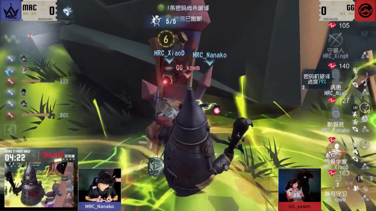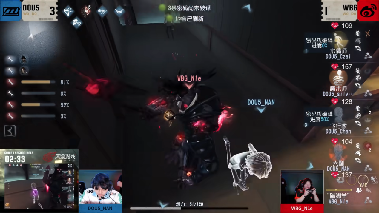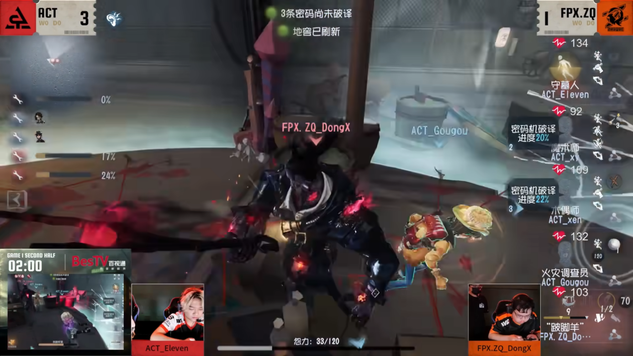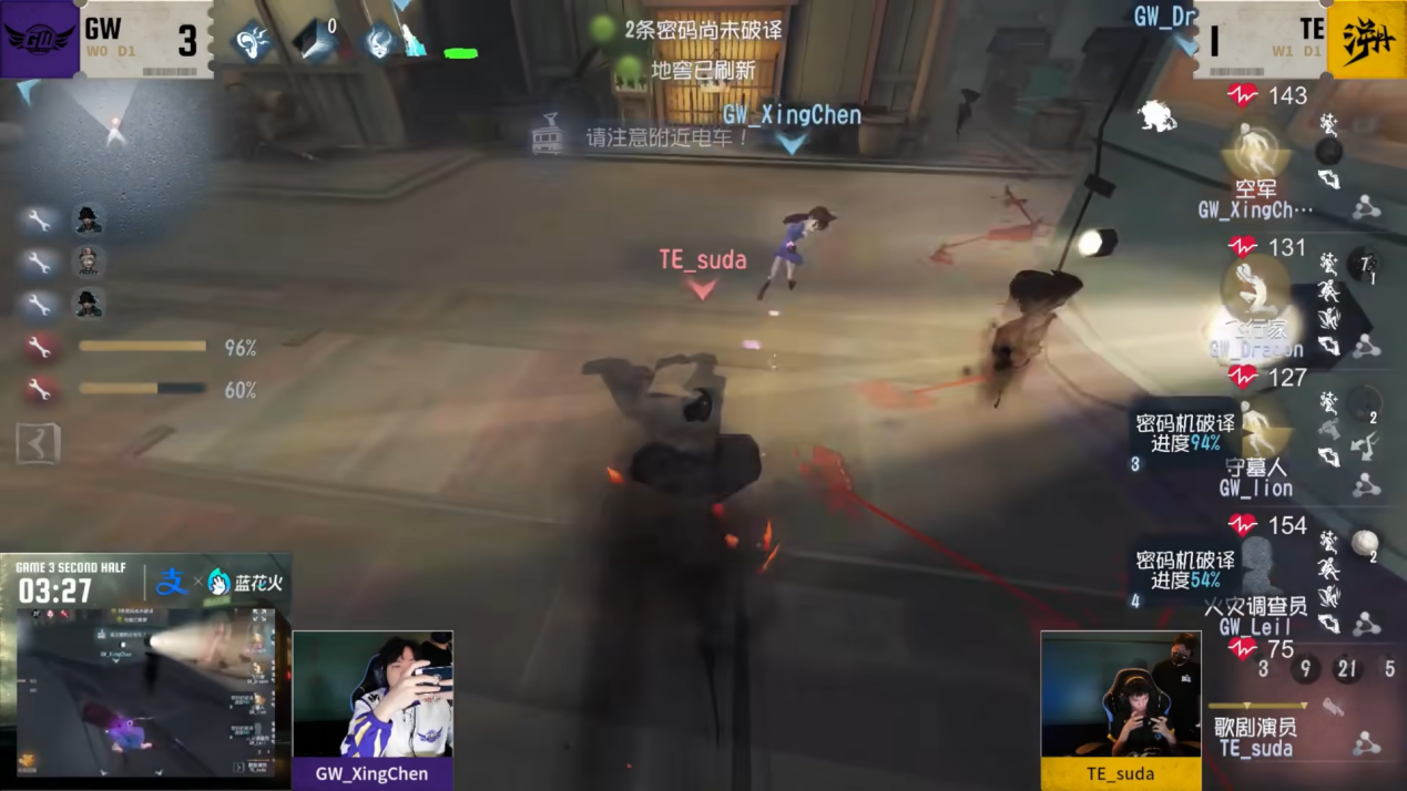 【当前战况】 2025IVL夏季赛第五周的比赛已经结束,当前积分排名如图: Gr战队依旧保持着恐怖的统治力,Gr_Jin前两局的高熟练度“四大天王”和稳健的Gr求生者相互兜底,常以2:0的姿态赢下比赛,即使对局来到第三场,Gr_Jin仍有绝活26号守卫保平争胜;MRC战队的MRC_BaiLu的角色池在前两局也有着极高的优势,但从前半程的赛况来看,MRC战队监管者方在第三局会出现心有余而力不足的情况,虽然目前有着稳定的出线资格,但该短板可能成为他们前进路上的阿喀琉斯之踵应及时作出针对性训练;成都Wolves战队求生者方应避免木桶效应的出现,希望他们能及时调整,做到和监管者选手Wolves_ChoAi的双向奔赴;北京WBG战队仍需沉淀应战底蕴,希望他们在后半程继续积累经验,WBG_Guoker虽然也有高光时刻,但在操作和运营思路上仍需精进和稳定。 下面让我们一起回顾一下本周的精彩对局吧! 【精彩回顾】 第一天,GW vs TE第二局上半场,TE_ppei“喧嚣”开局追击小木屋GW_lion杂技演员,杂技演员交出粘土爆弹转进小木屋内,TE_ppei精准释放双重惊喜对其造成伤害。待监管者准备再次使用双重惊喜将杂技演员击倒的时候,GW_XingChen前锋及时补撞协助杂技演员转点至海滩,但因只拉四分之一的球,对监管者造成的眩晕时间还没有超过双重惊喜持续时间,最终杂技演员还是在海滩双板区被架点击倒。前锋在一旁给监管者挂人压力,TE_ppei选择将其攻击至半状态而后移形挂人,GW_XingChen在监管者还未移形至杂技演员身前就开始果断拉球远距离冲向监管者将正在被牵起的杂技演员救下。杂技演员继续进行单人牵制,前锋寻找气象学家释放的暖雨进行治疗。挂上杂技演员后,TE_ppei第一时间留意前锋所在的位置,前锋状态刚刚补好,“喧嚣”的攻击便接踵而至,GW_XingChen视角锁定“喧嚣”抬手动作,按下飞轮抵消伤害,与此同时,GW_Leil玩具商悄无声息地从后方将杂技演员无伤救下,此次救援调动了两个人,场上密码机进度会相应被拖慢,但好在GW_XingChen对橄榄球耐久的合理使用,使其有持续干扰的能力。杂技演员待化险为夷效果结束后,倒在板子中间,面对有前锋干扰和可能被砸板的风险,监管者不得不花大块时间想办法将前锋击倒。待前锋成功将杂技演员的绝处逢生拖出,GW_lion也不负众望,砸板,转点,跳球扭开双重惊喜,极力延缓自己倒地速度,场上密码机已经破译完毕四台。此时TE_ppei选择管控最后一台密码机,将玩具商留在遗产机附近,GW求生者立刻在外围开启新的密码机,GW_Dragon气象学家则留在海滩周围准备救人。TE_ppei敏锐排到气象学家的位置,GW_Dragon利用层云将玩具商救下,玩具商下椅后未能成功利用跳板逃脱追击范围,而考虑到气象学家没有携带回光返照,GW求生者方选择直接点亮密码机。TE_ppei选择追击大船上的气象学家,待“喧嚣“上船后,GW_Dragon再次利用层云靠近狂欢之椅将人救下,此次救人十分关键,能让玩具商下椅后拖住监管者,使前锋能成功将大门破译开,避免了移形仍在手有多抓的机会。 图为GW_XingChen在监管者还未移形至杂技演员身前就果断拉长球将杂技演员救下 第二天,北京WBG vs GW第一局下半场,开局WBG_N1e“跛脚羊”迷失之笼封交互点封得又快又准,思路清晰,仅用1分02秒击倒心理学家。在拦截大副救人的时候,利用跃笼加合笼特质,准确打到正在摇怀表的大副,触发了失乐园,此时GW_lion大副只能选择救人,一旦救下来还有继续拉扯的机会,如果不救,魔术师状态刚被飞行家补好,没有其他人能赶来救人,监管者则可以直接不守椅追击大副续二手节奏。既然救人,GW_lion就必须在怀表持续时间结束之前将“心理学家”救下,GW_lion灵活走位,不断拆笼骗出刀,WBG_N1e只得再次释放迷失之笼,GW_lion利用怀表催眠监管者使其只能看到2秒前的幻象调虎离山,将监管者与椅子的距离拉远,半状态成功将“心理学家”救下。但因前期密码机进度太慢,飞行家个人牵制也未能成功将两台整的密码机拖至压好,最终三抓收场。 图为WBG_N1e“跛脚羊”精准跃笼合笼贴近大副,并触发“失乐园”为其救人增加压力 第三天,FPX.ZQ vs 成都Wolves第三局下半场,FPX.ZQ_DongX鹿头开局追击Wolves_Jelly病患,Wolves_Jelly拉距离至二楼并利用钩爪转点至双十一板区,FPX.ZQ_DongX预判钩爪落点,在等链爪冷却的时间争分夺秒地布置双十一陷阱,利用电车驶过将其压迫在空隙内不能拉开身位,Wolves_Jelly忙中出错转点失误,忘记监管者先前布置的陷阱,FPX.ZQ_DongX成功拿到第一刀伤害而后果断闪现过板直接把病患从二楼下板区勾过来,1分09秒快速将其击倒。虽然野人成功把人救下,但FPX.ZQ_DongX趁热打铁继续追野人双倒,精准定位病患倒地位置并将其挂至地下室,求生者方选择直接卖掉。第二手节奏FPX.ZQ_DongX先把Wolves_487杂技演员状态打下来,然后再追击正在修机的气象学家,两个链爪加一次普攻击倒Wolves_Dking气象学家后,场上密码机对于求生者方来说并不够。FPX.ZQ_DongX排人方向出错,让Wolves_XMX野人把气象学家救下,而后FPX.ZQ_DongX不追气象学家,反而将野人状态再打下来,此时场上所有求生者均为半状态,逼迫Wolves_Dking消耗道具对自己进行暖雨治疗,FPX.ZQ_DongX果断放手野人,对气象学家杀了个回马枪,野人见状也立马和杂技演员合修S板密码机,FPX.ZQ_DongX将气象学家逼离暖雨后继续管控机子,但杂技演员和野人都处于一钩倒的状态,FPX.ZQ_DongX利用野人下板僵直将其勾倒并挂上狂欢之椅,