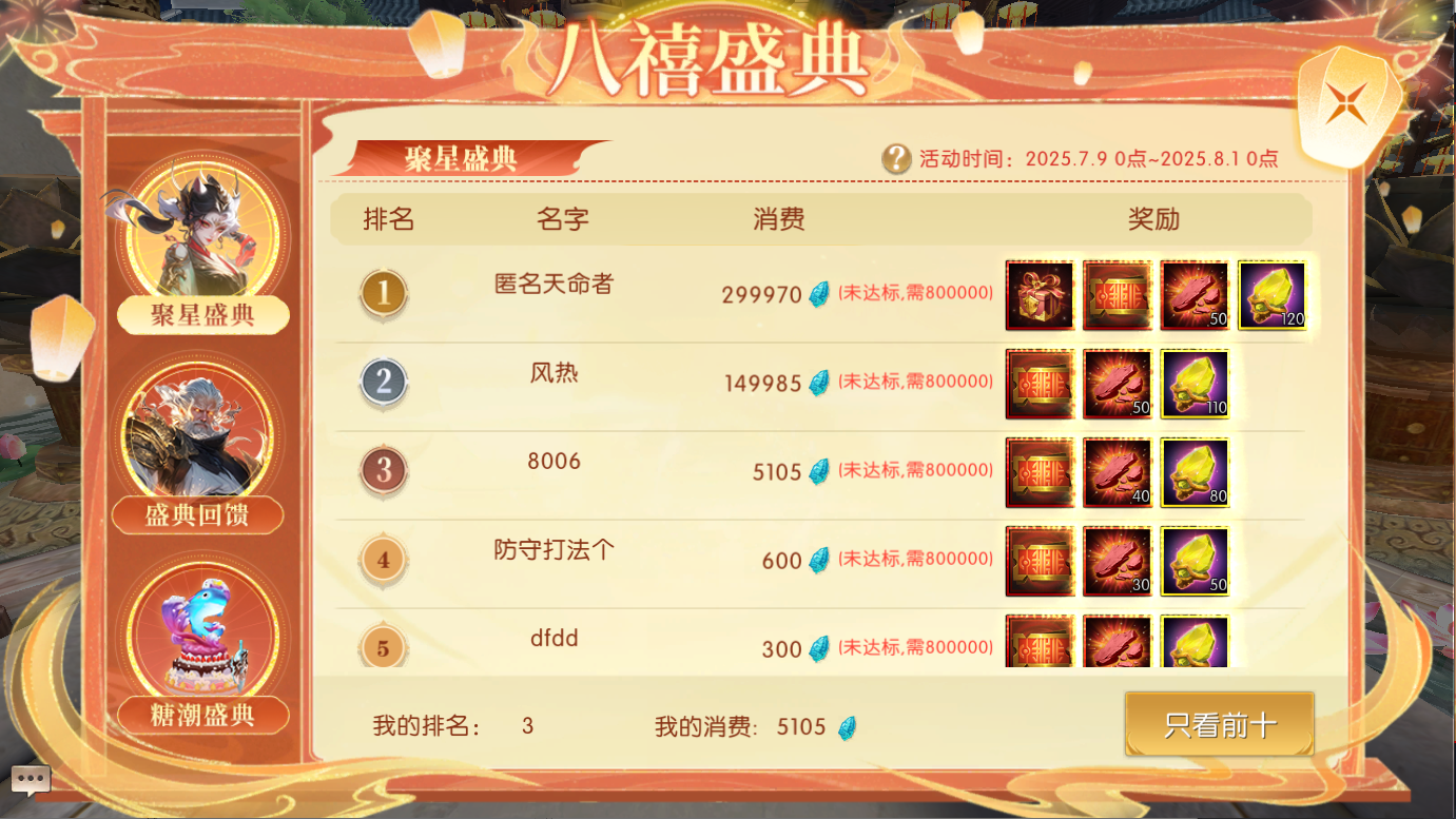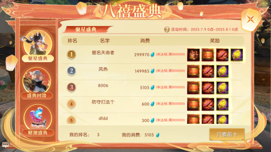 八周年庆典定制称号,全面革新 八周年庆典,强势来袭。超酷炫的全新专属定制特效称号,闪耀登场。华丽的震场效果,全新的获取方式,专属的定制文本,独有的属性增强。 专属称号更有特殊属性加成:定力+100、业力+100,祝您成长路上更胜一筹。 获取定制方式: 封神圣战赛季期间,八荒圣阶突破达到玄帝·圆满,可获得定制权益。 八周年庆典期间,参与八禧盛典·聚星盛典全区全服消费排行活动,并在活动结算时排名前5的玩家,可获得定制权益。 满足上述两种获取方式的要求后,即可联系客服定制豪华专属定制特效称号。为确保定制称号的展示效果,文本需控制在5个文字以内,且文本需符合游戏命名规范。 二、八周年盛世欢庆,全民消费获壕奖 八周年庆典期间,开启全民消费排行大活动:八禧盛典·聚星盛典 活动时间:7月9日0时-7月31日24时 ,消费海玉即可累计消费值,系统会根据消费值进行全区全服实时排名。当消费值达到排名所需的额度后,即可获得对应排名奖励。排名越靠前,奖励越丰厚,排名前5的玩家,更可获得专属定制权益。 具体排名奖励如下: 第1名:千魂引红卡·盛典定制*1、豪华专属定制特效称号*1、属性金装碎片(二)*120、卓越卦象石碎片(二)*50。 第2名:豪华专属定制特效称号*1、属性金装碎片(二)*110、卓越卦象石碎片(二)*50。 第3名:豪华专属定制特效称号*1、属性金装碎片(二)*80、卓越卦象石碎片(二)*40。 第4名:豪华专属定制特效称号*1、属性金装碎片(二)*50、卓越卦象石碎片(二)*30。 第5名:豪华专属定制特效称号*1、属性金装碎片(二)*50、卓越卦象石碎片(二)*30。 第6名:属性金装碎片(二)*50、卓越卦象石碎片(二)*30。 第7名:属性金装碎片(二)*30、卓越卦象石碎片(二)*10。 第8名:属性金装碎片(二)*30、卓越卦象石碎片(二)*10。 第9名:属性金装碎片(二)*30、卓越卦象石碎片(二)*10。 第10名:属性金装碎片(二)*30、卓越卦象石碎片(二)*10。 第11-20名:属性金装碎片(二)*10、疯狂包兑换石*5 第21-50名:轩辕灵金*5000、金票*8888、疯狂包兑换石*2 第51-100名:轩辕灵金*2888、金票*5888、疯狂包兑换石*1 属性金装碎片(二)和卓越卦象石碎片(二),集齐可兑换卓越卦象石和全新套装属性金色时装外显、神翼和坐骑。 如玩家在活动结束时,未满足当前排名所需的额度,将不会获得该排名所对应的奖励。 三、八周年轻盛典回馈,全民消费返利进行时 八周年庆典期间,开启全民消费大返利八禧盛典·盛典回馈(7月9日0时-7月31日24时),个人消费海玉即可累计消费值,累计达到对应档位额度,即可获得超值回馈豪礼:大量属性金装碎片(二)和卓越卦象石碎片(二),集齐可兑换卓越卦象石和全新套装属性金色时装外显、神翼和坐骑。 四、奖励介绍 属性金装碎片(二) 集齐一定数量碎片,即可兑换全新包含套装效果【星幻天成】的金色时装外显,时装-星幻逸影、武器-星幻、配饰-鲸梦浮饰、神翼-星幻羽翼、坐骑-蓝飞翼机蜓。 【星幻天成】套装效果: 破甲+3000 破甲抗性+3000 时装-星幻逸影: 五维属性战力+2000 基础物攻强度+50 基础魔攻强队+50 武器-星幻: 五维属性战力+2000 基础物攻强度+50 基础魔攻强队+50 配饰-鲸梦浮饰: 五维属性战力+2000 基础物攻强度+50 基础魔攻强队+50 神翼-星幻羽翼: 五维属性战力+3300 坐骑-蓝飞翼机蜓: 五维属性战力+3600 卓越卦象石碎片(二) 集齐80个碎片,即可兑换全新卦象位的卓越卦象石(巽)或卓越卦象石(坎),全新卓越卦象石可镶嵌在八卦的巽、坎位上。 卓越卦象石(巽): 卓越卦象石(坎): |