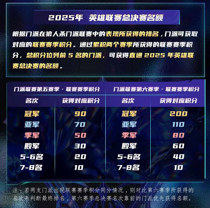 长夜将至,觉醒苍穹!狼人杀门派联赛·第六赛季总决赛来袭,12支晋级门派集结完毕,战斗号角即将打响,究竟哪个门派能成功拿下冠军?精彩对局一触即发! 【总决赛参赛门派集结】 成功晋级狼人杀门派联赛·第六赛季总决赛的12支门派已经集结完毕,这12支门派此前经历了预选撒、常规赛等多轮赛程对决,自身实力均不容小觑,茶颜悦色、迪士尼、控场门派此前多次拿到积分榜第一,戏狼师、长歌等门派则以黑马之势突出重围,其余门派同样虎视眈眈。 【总决赛赛程及板型安排】 狼人杀门派联赛·第六赛季总决赛将在7月16日—7月20日期间进行,总决赛全程采用指定板子对战,每日进行两局比赛,首场板子安排为狼王摄梦人,让我们期待选手们的精彩表现。 【总决赛高额奖励等你来拿】 总决赛取得前八名的门派均可获得游戏荣耀奖杯及现金奖励,成功夺得冠军的门派不仅能获得两万五千元现金奖励,还可获得官方给予的门派活动资源扶持及总冠军奖杯。按照选手在总决赛取得的个人积分,排名前三的选手也会获得额外现金嘉奖。同时取得冠军的选手还可获得全套五星装扮及永久五星时装。 【英雄联赛晋级规则】 按照赛制规则,根据常规赛各门派获得排位分,将其除以五作为总决赛的初始分奖励。按照各门派在门派联赛总决赛中获得的排名可以获取相应的联赛赛季积分,通过累积两个赛季所获得的联赛积分,最终总积分位列前五的门派可以直通2025狼人杀英雄联赛总决赛。 【高能解说观赛指引来袭】 总决赛开赛期间,狼人杀特邀10位大神主播惊喜加盟,他们将在官方直播间开启实时解说,分析选手们在对局中的表现,带大家前排高能观战! 玩家们每晚19:00可前往游戏内置顶房间实时观战,也可前往CC直播、斗鱼、虎牙、快手游戏、视频号、优酷游戏、bilibili、抖音、小红书游戏等平台的官方直播间围观精彩赛程。 关于《狼人杀官方》—— 《狼人杀官方》一直以来致力于游戏玩法的打造,力求给玩家带来最满意最优质的玩法体验以及游戏环境,积极开拓全新玩法,女巫、守卫、摄梦人、魔术师、猎魔人等板子应有尽有。 三分钟爆笑推理,随时随地来一局,欢声笑语乐不停!实景操作古风Q萌小人嗨翻浪漫碎叶城,更有全新神职狼王和猎魔人惊喜加盟,更多逗趣任务等你来解锁!8人10人12人超多娱乐进阶模式,明星主播都在玩。快来狼人杀官方,和全网年轻人热闹组局! |