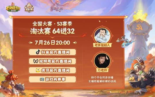 经过多轮酣战,石器时代觉醒全国大赛S3的前64强已经决出,恭喜各个战队!64强的对阵关系也随之新鲜出炉!你心中的顶尖战队是哪支?各战队在淘汰赛中将带来怎样的精彩对局?本周末将展开64进32强和32进16强的对决,来为你支持的队伍摇旗助威吧! 四平台同步直播,海量口令码礼包 7月26日起,将开启全国大赛S3赛事直播专栏。从64强开始,通过直播一起见证赛事荣耀征途!更有多个赛事口令码礼包奖励等你来领! 本周六(7月26日20:00)将开启64进32强直播 本周日(7月27日20:00)将开启32进16强直播 双主播降临官方直播间,为你解析精彩战局,共享赛事激情。 可前往【抖音】【视频号】【虎牙】搜索“石器时代觉醒”,进入官方直播间观赛;也可通过游戏内【赛事】入口一键观赛。 |
