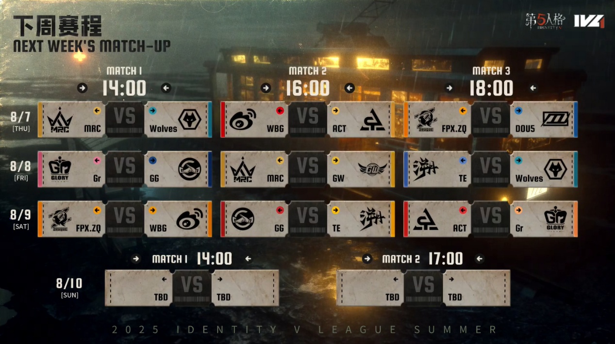 【当前战况】 2025IVL夏季赛第九周的比赛已经结束,当前积分排名如图: 常规赛的对决已经接近尾声,Gr战队,成都Wolves战队依旧名列前茅,北京WBG战队愈战愈勇,在本周取得了积分榜第三名的好成绩,MRC战队就目前来看,势头较刚开赛阶段有所减弱,希望他们能尽快恢复到原来一往无前的好状态;FPX.ZQ战队也步履稳健地在积分榜上一步步向上攀登;纵观排名靠后的战队,其求生者方均一定程度会出现一些让局势急转直下的操作失误,继而导致整个局面摧枯拉朽,他们仍需提升稳定性,在下周抓住每一次练兵机会,提升操作熟练度,在本赛季常规赛的最后一周展现自己的全部实力。 下面让我们一起回顾一下本周的精彩对局吧! 【精彩回顾】 第一天,北京WBG vs 成都Wolves第二局下半场,Wolves_ChoAi“喧嚣”开局大船追击WBG_Persica机械师,机械师释放机械玩偶并翻窗拉离大船进行牵制,Wolves_ChoAi利用双重惊喜精准架点,成功拿到第一刀伤害,但好在WBG_Persica快速回头进行砸板,拖出些许拉点时间,得以转入海边三板进行下一波牵制。Wolves_ChoAi利用移形快速跟上,不断追加焰火和干冰的惊喜标记,WBG_Persica视角盯准“喧嚣“抬手动作,敏捷反应抵消最后一个粘土舞台的累加伤害。Wolves_ChoAi再次利用双重惊喜架点,WBG_Persica转点至靠近大船的双板将其废掉,为外围修机的队友争取到宝贵的修机时间。待上挂后,WBG_Persica调动机械玩偶直接修大船上密码机,虽然佣兵在地下室救人的过程中双倒,但可以倒回大船上让机械玩偶进行治疗;WBG_Persica从船头跳下,避免再次被挂回地下室,同时也拉离大船上密码机;WBG_koting飞行家在补完佣兵开局的密码机之后,火速赶往战场,准备进行二救,”喧嚣“使用移形至大船上,准备击倒机械玩偶避免其继续修机,WBG_Persica操控机械玩偶至船舷边缘,使舞台转盘不能对其上惊喜标记,Wolves_ChoAi佯装拉走骗机械玩偶出来,再利用空中飞人迅速接近身位,终于将其击倒。倒在密码机旁的WBG_Huiyi佣兵及时交出绝处逢生避免上挂,”喧嚣“只得移形返回继续追击机械师。考虑到机械师没有携带回光返照且移形也已经交掉,火灾调查员也早已贴上小门,WBG_koting没有进行陪跑直接前往小门以便开门战能尽快逃出,佣兵点亮密码机后,火灾调查员和飞行家双人小门逃脱,佣兵直冲地窖,最后成功三跑,拉回比分! 图为WBG_Persica飞轮抵消粘土舞台伤害顺利转点拉长牵制时间 第二天,Gr vs DOU5第二局下半场,Gr_Jin“喧嚣“前往墓地追击幸运儿,先长窗交互点释放双重惊喜,而后卡住两次下板的时机释放双重惊喜,快速拿到第一刀伤害;幸运儿坐上电车,”喧嚣“利用狩猎本能快速赶到学校站点,DOU5_Chen火灾调查员在下车点释放气囊,使幸运儿能利用弹射进入板区,而后DOU5_silverzhi用幸运包裹中获得的橄榄球进入封闭长板,DOU5_silverzhi灵活应对迅速翻板,消耗 “喧嚣”的双重惊喜和空中飞人。待DOU5_Czai飞行家救援幸运儿后,没有防备继续补自己开局的遗产机,Gr_Jin挂上幸运儿后,直接移形秒杀飞行家并进行换挂,计算出求生者方电机量不够,选择直接守住飞行家所在的狂欢之椅和其一旁的遗产机。佣兵救下幸运儿后,便潜伏在附近,观察淘汰进度将半,护腕弹到椅子下面直接将人救下,DOU5_Czai飞行家在侧门前双板进行博弈,佣兵则继续修刚刚被守的遗产机给监管者压力,幸运儿则在墓地重新开启密码机,独栋密码机和墓地密码机进度同时上涨,给监管者施加压力使其应接不暇。最后DOU5_Chen火灾调查员前来救援没有回光返照的飞行家,吃一刀伤害自己能受到回光返照收益的同时飞行家能拉开更多点位,并保留佣兵开门战满状态。开门战Gr_Jin将火灾调查员快速击倒,并挂往红蝶亭狂欢之椅,移形前去淘汰没能及时冲门的飞行家,DOU5_NAN佣兵将火灾调查员救下并出现在监管者视野中吸引火力,使火灾调查员能顺利地窖逃生。 图为DOU5_NAN佣兵吸引火力,使火灾调查员能顺利地窖逃生 第三天,成都GG vs 北京WBG第一局下半场,GG_Qiu歌剧演员开局大船追击WBG_Persica调香师,调香师利用前两瓶忘忧之香都拉开了较大的距离,但飞轮失误导致破香,监管者利用闪现将其快速击倒,WBG_Huiyi守墓人利用遁地尽可能延缓救援时间,而后利用震颤击退歌剧演员快速将调香师救下,调香师利用搏命挣扎拉离大船边遗产,在此期间魔术师翻找箱子获得怀表并将其搬运到狂欢之椅附近,无伤救下人后并抗到一刀伤害,调香师下椅后顺利获得怀表并灵活走位规避刀气进行牵制,成功将外围的第四台电机拖开并且给半状态的队友争取到了宝贵的补状态时间。守墓人在大船开始破译最后一台,WBG_Guoker木偶师在小屋附近进行牵制:前期藏匿在视野盲区进行躲藏,被发现后进行短板博弈,目压出刀前摇成为“路易”抵挡伤害并转点进小木屋,而后第二次成为“路易”主动蹭刀气利用擦刀时间进行转点,预判回溯拉开身位翻板,压好密码机后利用擦刀时间拉开身位,凭一己之力在短板牵制一整台密码机,为队伍争取到平局,在第一局中获得7:2的积分优势。 图为WBG_Persica调香师利用搬运来的怀表进行牵制,成功为队友拖出补遗产机和状态的时间 本周精彩瞬间还有:TE vs MRC第一局上半场,在快速淘汰大副后,果断底牌切传送击倒TE_YangY园丁续上二手节奏,期间因木偶师刚刚在破译的密码机在较远的位置,趁此机会MRC_BaiLu“跛脚羊”外出巡视找到冒险家并对其造成伤害,而后利用两个迷