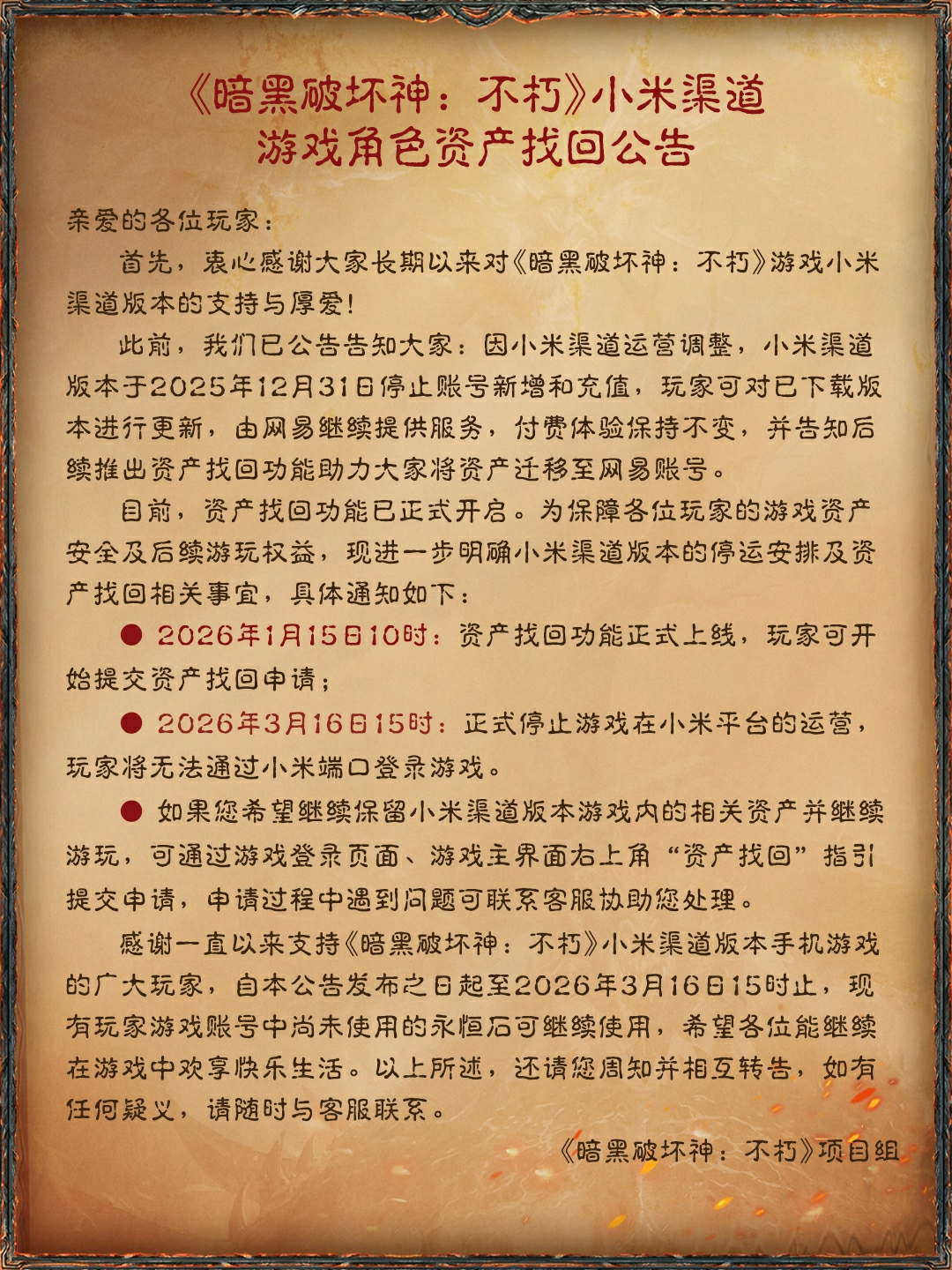 亲爱的冒险者: 首先,衷心感谢大家长期以来对《暗黑破坏神:不朽》游戏小米渠道版本的支持与厚爱! 因小米渠道运营调整,小米渠道版本于2025年12月31日停止账号新增和充值,玩家可对已下载版本进行更新,由网易继续提供服务,付费体验保持不变。 角色资产找回功能现已开启,冒险者们可参阅图片指引进行资产找回,或扫描二维码,前往专题页面,获取更多支持。 感谢一直以来支持《暗黑破坏神:不朽》小米渠道版本手机游戏的广大玩家,自本公告发布之日起至2026年3月16日15时止,现有玩家游戏账号中尚未使用的永恒石可继续使用,希望各位能继续在游戏中欢享快乐生活。 以上所述,还请您周知并相互转告,如有任何疑义,请随时与客服联系。 |