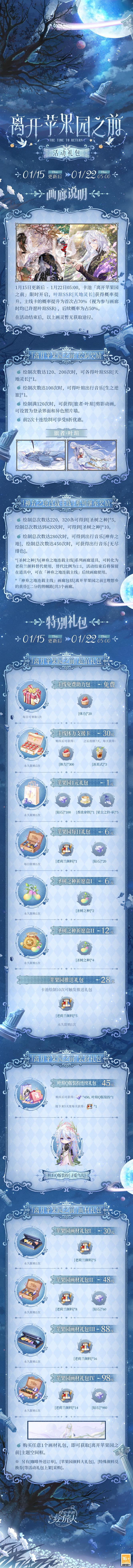 遥遥远方星海的任务与赌约,本地皇朝历史的兴亡, 一切随着一人的到来而交汇。 白银提督的任务曾是污染这里, 而现在,你知道,一切已经再不相同。 绘旅人神弃之地主线「星币篇」将于1月15日更新后启程,主线活动「离开苹果园之前」和同名画廊开启,活动纪念开屏可免费获取。 【叶瑄SSR·天地灵长】「若是被小恩小惠的牺牲打动,反而把弱点泄露给敌我不明的对象,很可能落到万劫不复的下场。」 叶瑄继续着这一次次短暂化身的游历。 他将自己的一部分投入到这个世界,并让自己逐渐被这里的万物接受。 他是小虫,是飞鸟,是青蛇,是种子飘落法阵的植物,也是只在这个星球出现的其他生命。 1月15日更新后 - 1月22日05:00,「离开苹果园之前」主线开启。版本活动期间,叶瑄SSR[天地灵长]获得概率提升。 【离开苹果园之前·活动礼包】 1月15日更新后 - 1月22日05:00,卡池「离开苹果园之前」限时开启,叶瑄SSR[天地灵长]获得概率提升。活动结束后,以上画灵暂无获取途径。 更多详情可查看下方长图↓ 【离开苹果园之前·主线活动玩法】 开启时间:1月15日更新后 - 1月22日05:00,通过[主界面]-[花架]进入[离开苹果园之前]。 即将开启: 主线剧情·星币篇 画灵养成·剧情助力 太初天平·选择系统 主线活动免费头像框、头像和开屏 详情可查看下方长图↓ 【开屏界面·倘若一切终末】 「离开苹果园之前」活动期间,开屏界面「倘若一切终末」自动更换,可在活动中免费获取「倘若一切终末」永久使用权。 【关于《时空中的绘旅人》】 《时空中的绘旅人》活动「离开苹果园之前」1月15日开启!参与游戏体验活动,海量福利等你开启。 |
