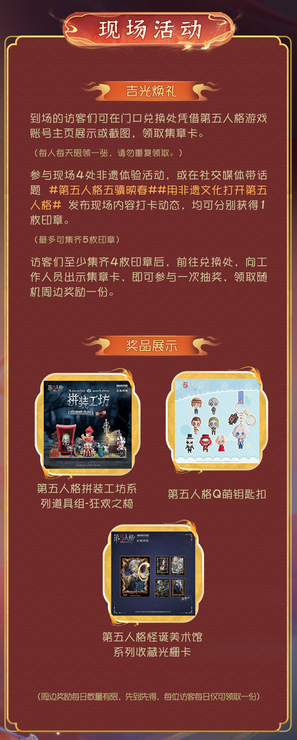 奇灯迎春,庄园共庆!《第五人格》×中国彩灯博物馆——“五”骥映春非遗主题活动即将开启,第五人格与自贡文旅达成合作,2月5日-2月7日将在中国彩灯博物馆为访客们打造多项非遗文化体验活动,在彩灯的世界里传递非遗文化的魅力! 非遗灯影织春景,艺彩流光庆团圆 本次“五”骥映春非遗主题活动将于2月5日-7日期间,在国家级非遗“自贡灯会”民俗和四川省省级非遗“自贡彩灯传统制作工艺”项目的保护单位中国彩灯博物馆(四川省自贡市自流井区公园路6号-自贡彩灯公园内)举行,这是目前国内唯一专门开展彩灯文化收藏、保护、研究、展示的博物馆,其中蕴藏了中华彩灯从古至今的艺术演变与民俗内涵。 打开微信,搜索“中国彩灯博物馆”官方微信公众号,点击【门票预约】,选择入园时段并填写相关信息,预约成功后凭借入园码,在规定时间内入园即可,门票免费。 访客们可选择打车或公交车的方式自行前往,打车可选择【自贡彩灯公园-西南门】或【自贡彩灯公园-西北门】下车;公交车可在市内乘坐1路、5路、9路、31路、35路、307路、801路等多路公交至东方广场站(或彩灯公园站、公园口站)下车,步行约3分钟即可到达。 非遗展品承古韵,艺韵满街映新春 2月5日-2月7日活动期间,将展出4件非遗传承人为第五人格倾力打造的4件非遗展品,访客们可前往线下进行观赏打卡。 现场还设有大型狂欢之椅彩灯装置,等待访客们打卡体验。完成现场打卡内容还可参与幸运抽奖,丰厚的周边好礼等着你! 2月5日-2月7日,活动现场每天都有4项非遗老师亲临活动现场,为访客们带来与众不同的非遗制作体验,访客们可在非遗技艺老师们的指导下,体验自贡彩灯、龚扇、扎染、剪纸等4项非遗制作。活动现场所设非遗体验摊位体验时间为10:00-17:00,非遗体验材料包每日限量100份,用完即止,每位访客的体验时长约3分钟。 非遗活动展雅韵,华光逐影喜迎春 到达现活动现场的访客们可以在门口兑换处,凭借第五人格游戏账号主页展示或截图,领取集章卡。(每人每天限领一张,请勿重复领取。) 在活动现场设有4处非遗体验活动,前往参与体验活动,或在社交媒体带话题#第五人格五骥映春##用非遗文化打开第五人格#发布现场内容打卡动态,均可分别获得1枚印章。(最多可集齐5款印章)访客们至少集齐4枚印章后,前往兑换处,可参与一次抽奖,领取随机周边奖励一份。 千年韵味,遗世匠心!网易首款1V4非对称竞技手游《第五人格》×中国彩灯博物馆——“五”骥映春非遗主题活动即将开启,游戏内春节主题活动也将上线,期待与各位访客们一起全方面体验自贡非遗的魅力!登录游戏官网,查看更多最新资讯! 【关于第五人格】 《第五人格》是网易首款非对称性对抗竞技手游。荒诞哥特画风,悬疑烧脑剧情,刺激的1V4的对抗玩法,都将给玩家带来全新的游戏体验。玩家将扮演记者爱丽丝·德罗斯,在收到一封神秘的邀请函后,进入欧利蒂丝庄园调查背后的秘密。在进行证据调查过程中,玩家扮演的爱丽丝·德罗斯将采用演绎法,对真相进行回顾和推演。在案情回顾时,玩家可以选择扮演监管者或求生者,展开激烈的对抗。而在调查的过程,无限接近事实时,却发现越来越不可思议的真相。 |