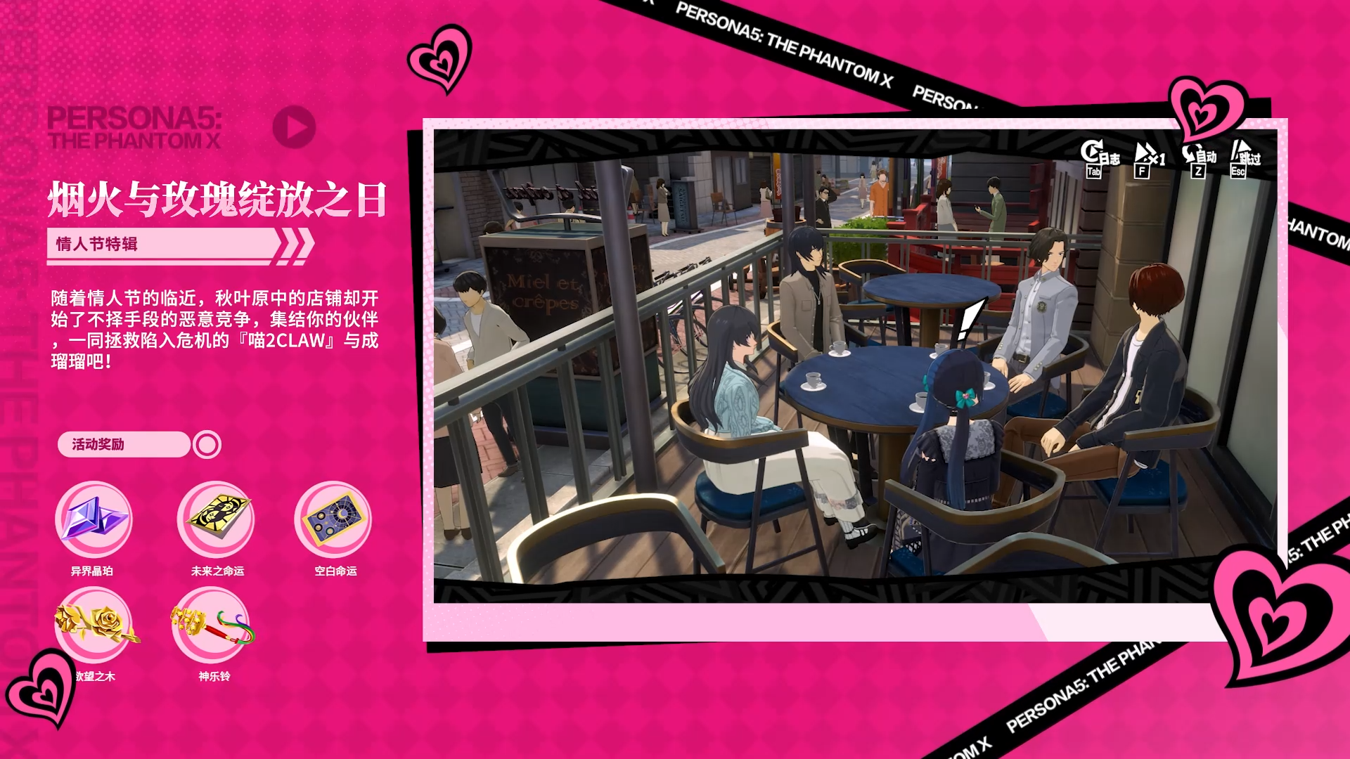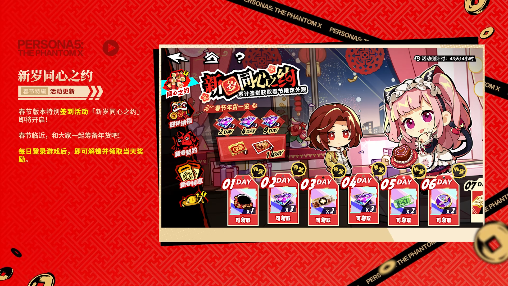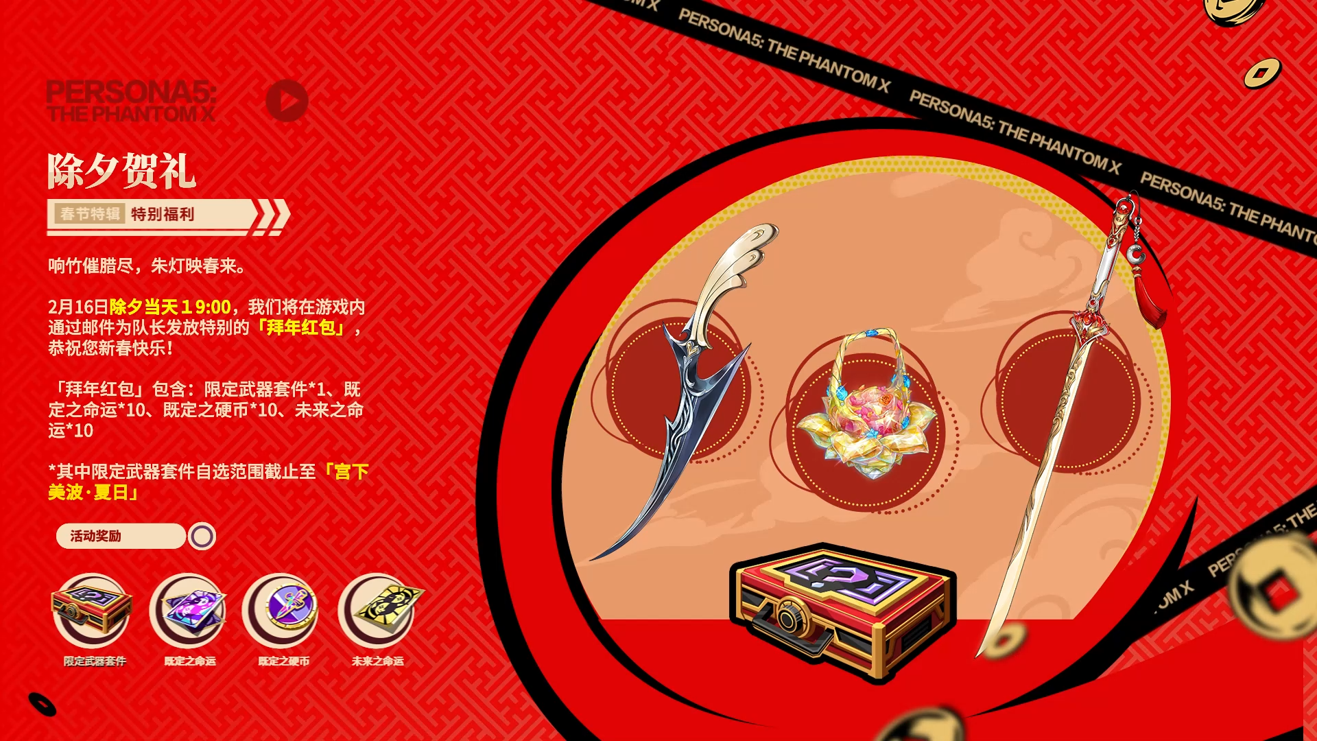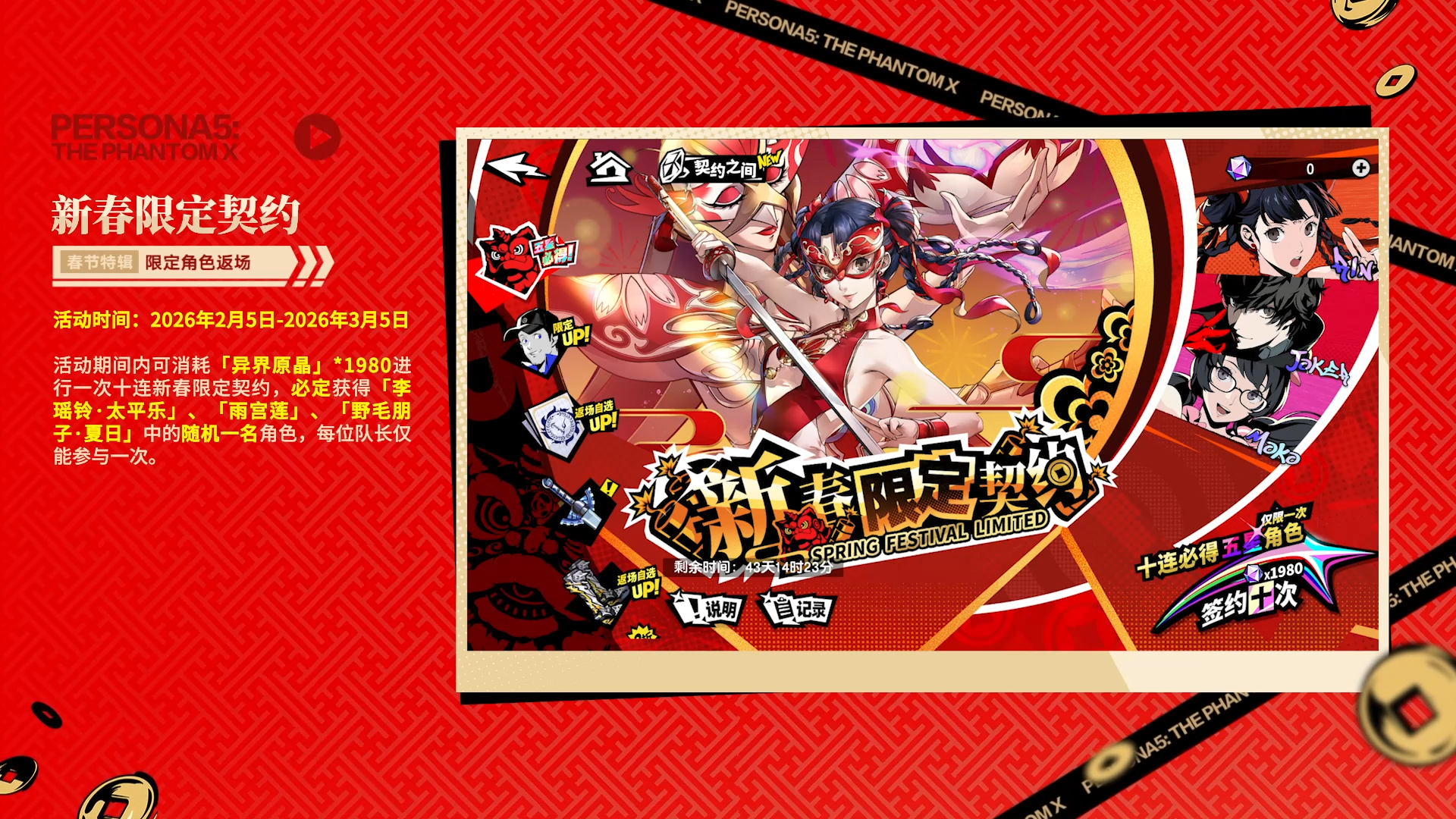 烟火与玫瑰绽放之日《女神异闻录:夜幕魅影》4.8.1版本今日上线 情人节特辑——烟火与玫瑰绽放之日 随着情人节的临近,秋叶原中的店铺却开始了不择手段的恶意竞争,集结你的伙伴,一同拯救陷入危机的『喵2CLAW』与成瑠瑠吧! 五星限定怪盗偶像「梨本成瑠海」登场! 五星限定念动属性反抗角色「梨本成瑠海」获取概率限时UP! 认知模拟试用角色更新! 协同者剧情更新 情人节特辑全新活动 巧克力工房 虽然在伙伴的帮助下找到了等身巧克力的制作方式,但为了挑战制作高难度的等身女仆巧克力,还需要进行大量的练习。参照「喵2CLAW」推出的女仆扭蛋造型,在家中尝试制作迷你版的女仆巧克力吧。 完成活动可获得异界晶珀与自宅摆件「可可女仆咖啡厅」。 情人节特辑全新活动——恋爱作战 随着情人节临近,街道上的浪漫氛围开始变得日渐浓厚,但在如此热情的欲望影响下,印象空间中的阴影也开始焦躁不安起来。与暴走的阴影进行战斗,守护情侣们想要共度情人节的欲望,帮助大众留下美好的节日记忆吧。 战斗中,利用好特殊机制 「可可骑士的祝福」可以协助队长更好平息扭曲的欲望。此外,Wonder 与女性伙伴在战斗中互动会产生非常特别的“化学反应”,队长敬请期待。 情人节特辑全新商品 限定娃娃上架 地区限定娃娃「巴古斯·迷你」「希路奇」即将开放限时获取。 成功抓取即可获得对应自宅装饰摆件。 心象核心新增——开放新怪盗心象核心 两位角色开启心象激活功能: 雨宫莲 新增潜能「愤怒」:拥有3层及以上的「煞气」时,暴击效果额外提升一定百分比;技能「厄运追击」倍率提升一定百分比。 新增潜能「毁灭」:自身攻击处于持有负面效果的敌人时,根据敌人的负面效果数量获得总伤害增幅。 李瑶铃·太平乐 新增潜能「添福」:自身触发TECHNICAL时,攻击力增加一定百分比;触发「爆燃」时自身技巧精通提升一定值。 新增潜能「喜乐」:自身攻击处于「燃烧」状态的敌人时,「铁火流星」、「焰流星火」的技能伤害提升一定百分比。 武器刻印-荧惑烛心 情人节特辑武器更新 本次更新将开放武器「天象星仪」的1种刻印「荧惑蚀心」。 「荧惑蚀心」:光环「星盘万象」额外使全体同伴攻击力提升。每个敌人受到每次伤害,WONDER额外获得1层「推衍」。WONDER回合结束不再消耗「推衍」层数。任意同伴进入额外回合时,使该同伴获得持续一定回合的 「思维超频」。 「思维超频」:念动属性伤害提升;造成念动属性伤害时,暴击效果提升。 大富翁 大富翁S12赛季更新。赛季更新后,排行奖励将会刷新,同时欢乐模式下的富翁币也会按赛季规则进行重置,敬请注意。新增牌手「长尾千津子」,新增特殊卡面「道玄坂琉七」、「须见俊也」。 春节庆典——海量活动福利恭迎新春! 春节特辑全新活动 除夕贺礼——新春特辑特别福利 响竹催腊尽,朱灯映春来。 2月16日除夕当天19:00,我们将在游戏内通过邮件为队长发放特别的「拜年红包」,恭祝您新春快乐! 「拜年红包」包含:限定武器套件*1、既定之命运*10、既定之硬币*10、未来之命运*10 *其中限定武器套件自选范围截止至「宫下美波·夏日」 新岁同心之约 春节特辑活动更新 春节版本特别签到活动「新岁同心之约」即将开启! 春节临近,和大家一起共同筹备年货吧! 每日登陆游戏后,即可解锁并领取当天奖励。 命运骰子争霸赛 春节特辑全新活动 受到人类社会复杂欲望的影响,贝萨推出了全新的节目企划——一款以现实都市为造景的大富翁真人秀游戏节目。同时,他也参考了人类社会中的类似节目,并考察了人类的欲望,参与者需要在对局中完成收购、战斗、事件等内容,获取到更多的货币,并最终赢得对局…… 迎祥纳福 春节特辑活动更新 恭喜发财,红包拿来! 活动期间,可以在论坛或乐园聊天频道中发送贺年红包或抢贺年红包,迎新春财运! 贺年红包可以通过春节期间各项活动获取。 荆棘试炼-呪之岁 春节特辑活动更新 活动时间:2026年2月16日—2026年3月5日 挑战分为均衡模式与崩坏模式: 均衡模式:预设异变效果的挑战,可使用试用阵容,完成挑战将解锁崩坏模式中更多的异变效果; 崩坏模式:可以自由选择异变效果,选择后的异变等级越高,敌人也将更加强悍! 完成对应挑战目标,即可获取异界晶珀与活动限定徽章。 春节甄选年货 新年返利辞旧迎新! 新春限定契约 春节特辑限定角色返场 活动时间2026年2月5日—2026年3月5日 活动期间内可消耗「异界原晶」*1980进行一次十连新春限定契约,必定获得「李瑶铃·太平乐」、「雨宫莲」、「野毛朋子·夏日」中的随机一名角色,每位队长仅能参与一次。 惊鸿驭春 春节特辑时装上新 主人公新春主题都市时装「惊鸿驭春」限时登场,队长可以通过活动界面通过「直购」形式购买「新春·锦绣礼」礼包获取。 购买该礼包将同步赠送春节主题自宅摆件「岁华流彩」,亲手为家中增添一份年味儿吧! *「惊鸿驭春」都市增益:在中华相关店铺打工时获得的现金提升。 天地胜意,万象归新 新春特辑时装复刻 新春主题主人公战斗时装「天地胜意」限时复刻! 更换时装造型后,Wonder将拥有独特的战斗形象、总攻击插画与HIGHLIGHT动画特效! 缘结之契 春节特辑限定角色返场 活动时间2026年2月5日更新完成后-2026年3月5日 指定自选契约「缘结之契」再次开启! 队长可在4.4.1版本(截止到
