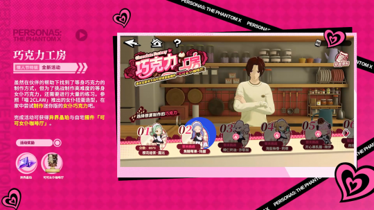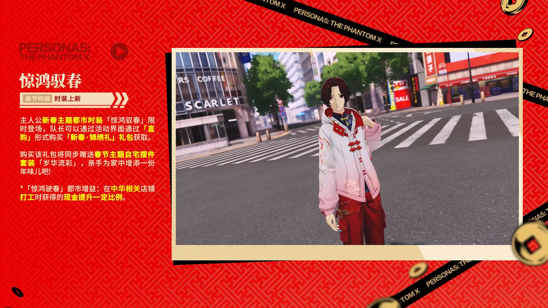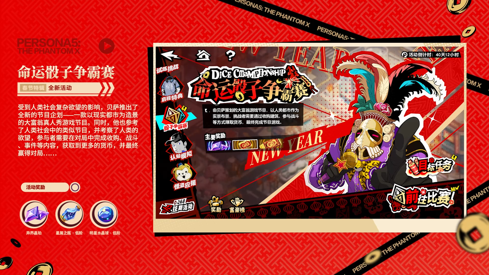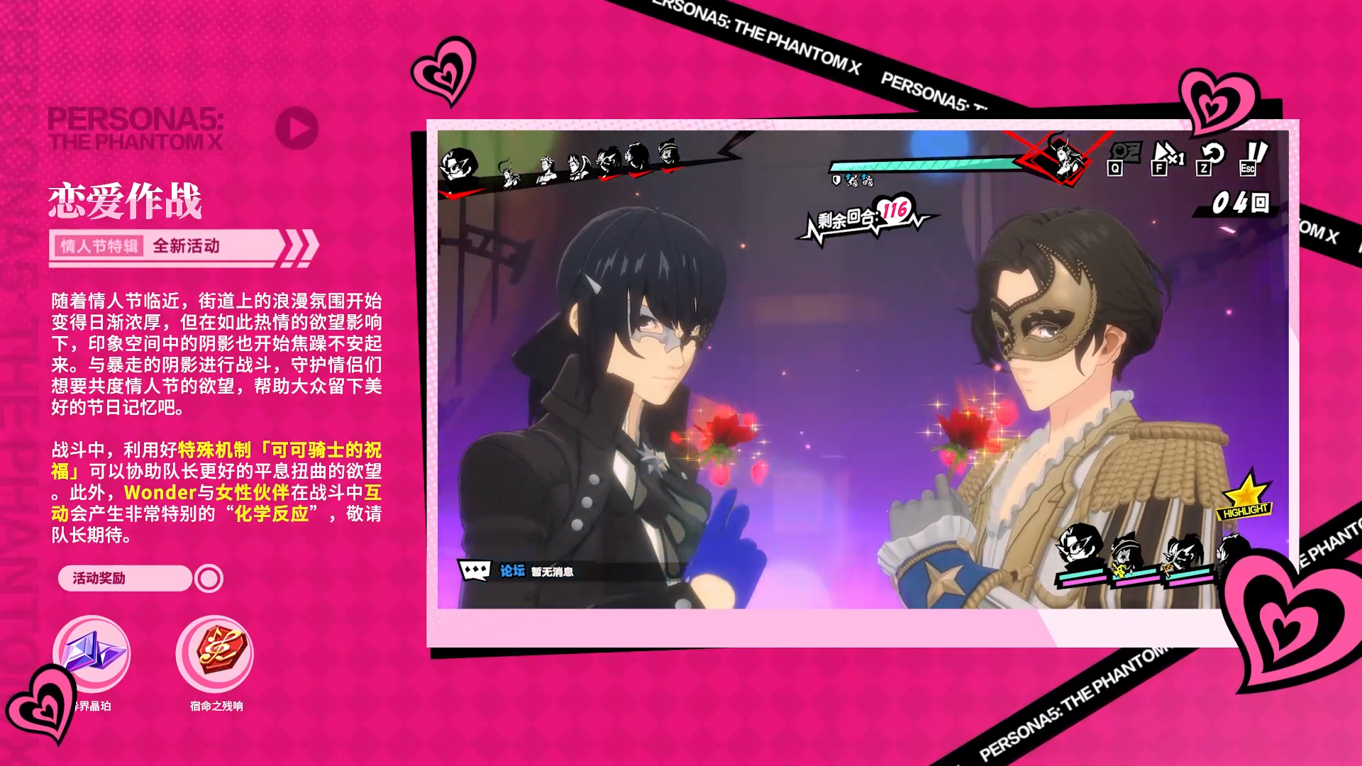 烟火与玫瑰绽放之日《女神异闻录:夜幕魅影》4.8.1版本今日上线 情人节特辑——烟火与玫瑰绽放之日 随着情人节的临近,秋叶原中的店铺却开始了不择手段的恶意竞争,集结你的伙伴,一同拯救陷入危机的『喵2CLAW』与成瑠瑠吧! 五星限定怪盗偶像「梨本成瑠海」登场! 五星限定念动属性反抗角色「梨本成瑠海」获取概率限时UP! 认知模拟试用角色更新! 协同者剧情更新 情人节特辑全新活动 巧克力工房 虽然在伙伴的帮助下找到了等身巧克力的制作方式,但为了挑战制作高难度的等身女仆巧克力,还需要进行大量的练习。参照「喵2CLAW」推出的女仆扭蛋造型,在家中尝试制作迷你版的女仆巧克力吧。 完成活动可获得异界晶珀与自宅摆件「可可女仆咖啡厅」。 情人节特辑全新活动——恋爱作战 随着情人节临近,街道上的浪漫氛围开始变得日渐浓厚,但在如此热情的欲望影响下,印象空间中的阴影也开始焦躁不安起来。与暴走的阴影进行战斗,守护情侣们想要共度情人节的欲望,帮助大众留下美好的节日记忆吧。 战斗中,利用好特殊机制 「可可骑士的祝福」可以协助队长更好平息扭曲的欲望。此外,Wonder 与女性伙伴在战斗中互动会产生非常特别的“化学反应”,队长敬请期待。 情人节特辑全新商品 限定娃娃上架 地区限定娃娃「巴古斯·迷你」「希路奇」即将开放限时获取。 成功抓取即可获得对应自宅装饰摆件。 心象核心新增——开放新怪盗心象核心 两位角色开启心象激活功能: 雨宫莲 新增潜能「愤怒」:拥有3层及以上的「煞气」时,暴击效果额外提升一定百分比;技能「厄运追击」倍率提升一定百分比。 新增潜能「毁灭」:自身攻击处于持有负面效果的敌人时,根据敌人的负面效果数量获得总伤害增幅。 李瑶铃·太平乐 新增潜能「添福」:自身触发TECHNICAL时,攻击力增加一定百分比;触发「爆燃」时自身技巧精通提升一定值。 新增潜能「喜乐」:自身攻击处于「燃烧」状态的敌人时,「铁火流星」、「焰流星火」的技能伤害提升一定百分比。 武器刻印-荧惑烛心 情人节特辑武器更新 本次更新将开放武器「天象星仪」的1种刻印「荧惑蚀心」。 「荧惑蚀心」:光环「星盘万象」额外使全体同伴攻击力提升。每个敌人受到每次伤害,WONDER额外获得1层「推衍」。WONDER回合结束不再消耗「推衍」层数。任意同伴进入额外回合时,使该同伴获得持续一定回合的 「思维超频」。 「思维超频」:念动属性伤害提升;造成念动属性伤害时,暴击效果提升。 大富翁 大富翁S12赛季更新。赛季更新后,排行奖励将会刷新,同时欢乐模式下的富翁币也会按赛季规则进行重置,敬请注意。新增牌手「长尾千津子」,新增特殊卡面「道玄坂琉七」、「须见俊也」。 春节庆典——海量活动福利恭迎新春! 春节特辑全新活动 除夕贺礼——新春特辑特别福利 响竹催腊尽,朱灯映春来。 2月16日除夕当天19:00,我们将在游戏内通过邮件为队长发放特别的「拜年红包」,恭祝您新春快乐! 「拜年红包」包含:限定武器套件*1、既定之命运*10、既定之硬币*10、未来之命运*10 *其中限定武器套件自选范围截止至「宫下美波·夏日」 新岁同心之约 春节特辑活动更新 春节版本特别签到活动「新岁同心之约」即将开启! 春节临近,和大家一起共同筹备年货吧! 每日登陆游戏后,即可解锁并领取当天奖励。 命运骰子争霸赛 春节特辑全新活动 受到人类社会复杂欲望的影响,贝萨推出了全新的节目企划——一款以现实都市为造景的大富翁真人秀游戏节目。同时,他也参考了人类社会中的类似节目,并考察了人类的欲望,参与者需要在对局中完成收购、战斗、事件等内容,获取到更多的货币,并最终赢得对局…… 迎祥纳福 春节特辑活动更新 恭喜发财,红包拿来! 活动期间,可以在论坛或乐园聊天频道中发送贺年红包或抢贺年红包,迎新春财运! 贺年红包可以通过春节期间各项活动获取。 荆棘试炼-呪之岁 春节特辑活动更新 活动时间:2026年2月16日—2026年3月5日 挑战分为均衡模式与崩坏模式: 均衡模式:预设异变效果的挑战,可使用试用阵容,完成挑战将解锁崩坏模式中更多的异变效果; 崩坏模式:可以自由选择异变效果,选择后的异变等级越高,敌人也将更加强悍! 完成对应挑战目标,即可获取异界晶珀与活动限定徽章。 春节甄选年货 新年返利辞旧迎新! 新春限定契约 春节特辑限定角色返场 活动时间2026年2月5日—2026年3月5日 活动期间内可消耗「异界原晶」*1980进行一次十连新春限定契约,必定获得「李瑶铃·太平乐」、「雨宫莲」、「野毛朋子·夏日」中的随机一名角色,每位队长仅能参与一次。 惊鸿驭春 春节特辑时装上新 主人公新春主题都市时装「惊鸿驭春」限时登场,队长可以通过活动界面通过「直购」形式购买「新春·锦绣礼」礼包获取。 购买该礼包将同步赠送春节主题自宅摆件「岁华流彩」,亲手为家中增添一份年味儿吧! *「惊鸿驭春」都市增益:在中华相关店铺打工时获得的现金提升。 天地胜意,万象归新 新春特辑时装复刻 新春主题主人公战斗时装「天地胜意」限时复刻! 更换时装造型后,Wonder将拥有独特的战斗形象、总攻击插画与HIGHLIGHT动画特效! 缘结之契 春节特辑限定角色返场 活动时间2026年2月5日更新完成后-2026年3月5日 指定自选契约「缘结之契」再次开启! 队长可在4.4.1版本(截止到
